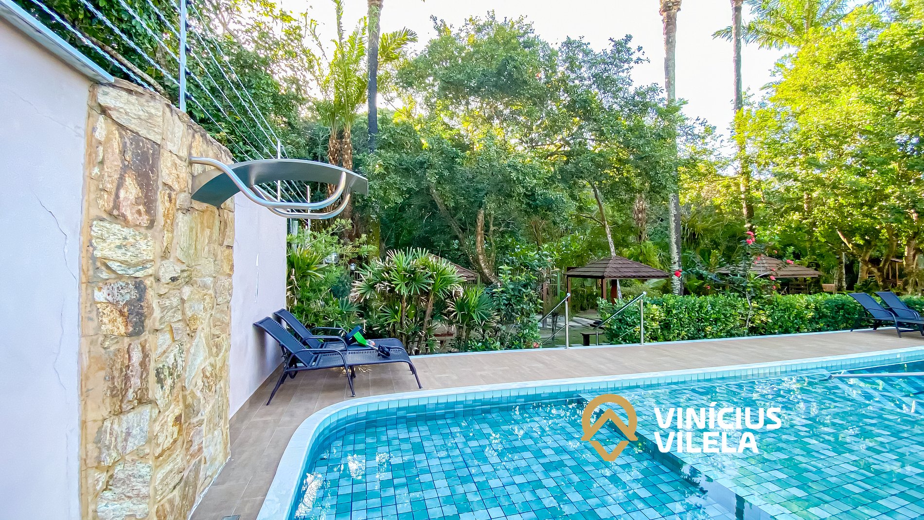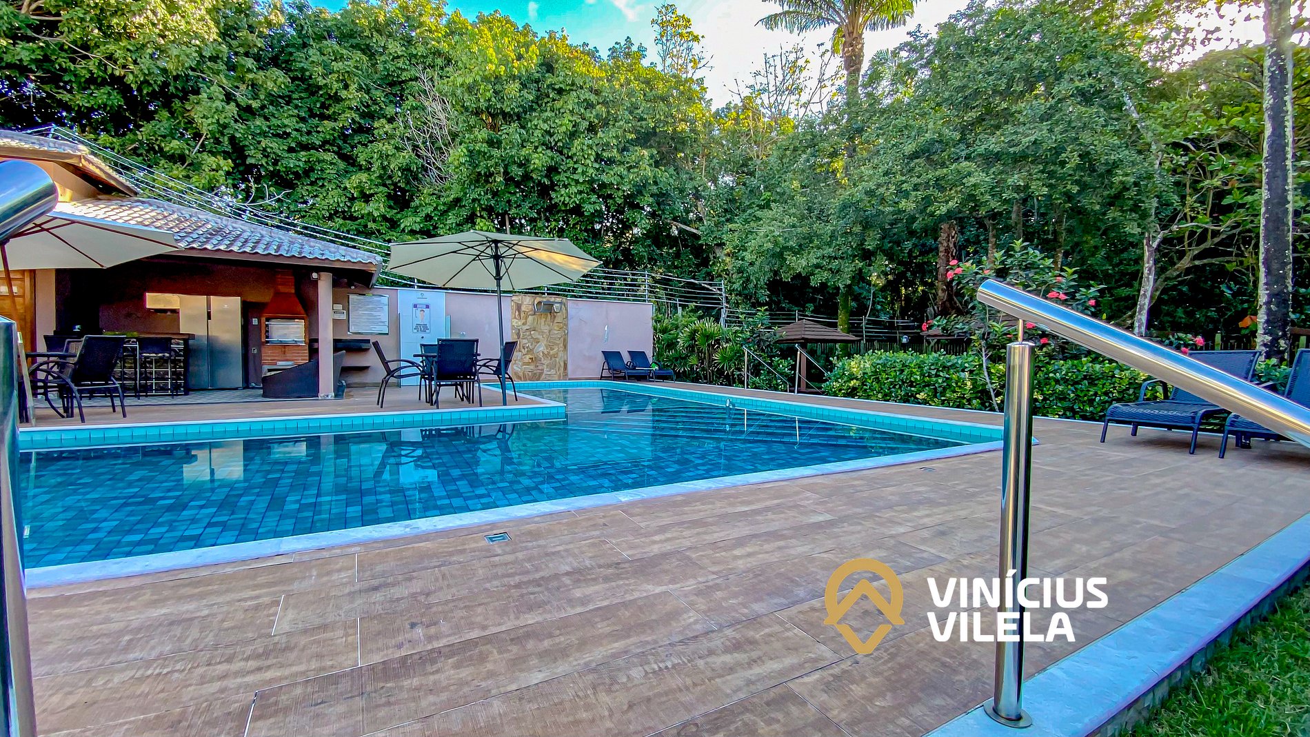 - condomínio com piscina, espreguiçadeiras , rodeado de muita área verde.