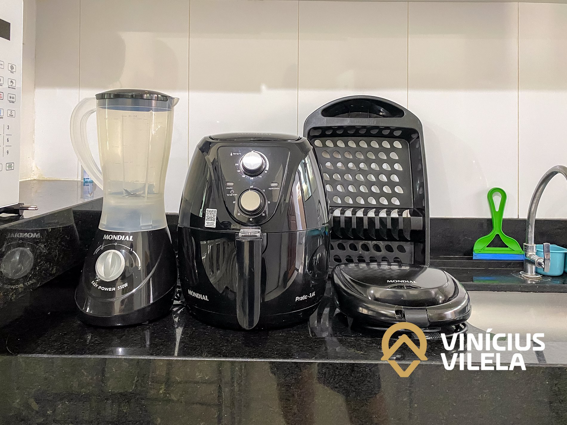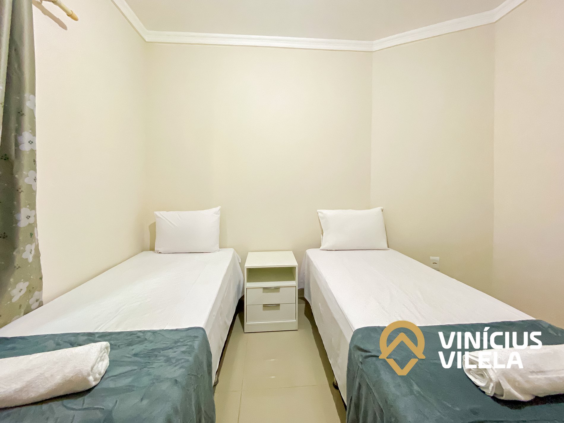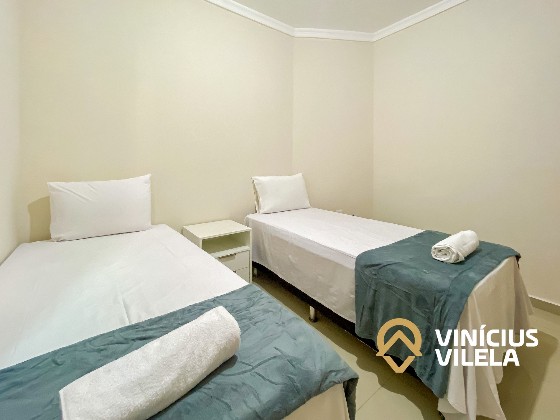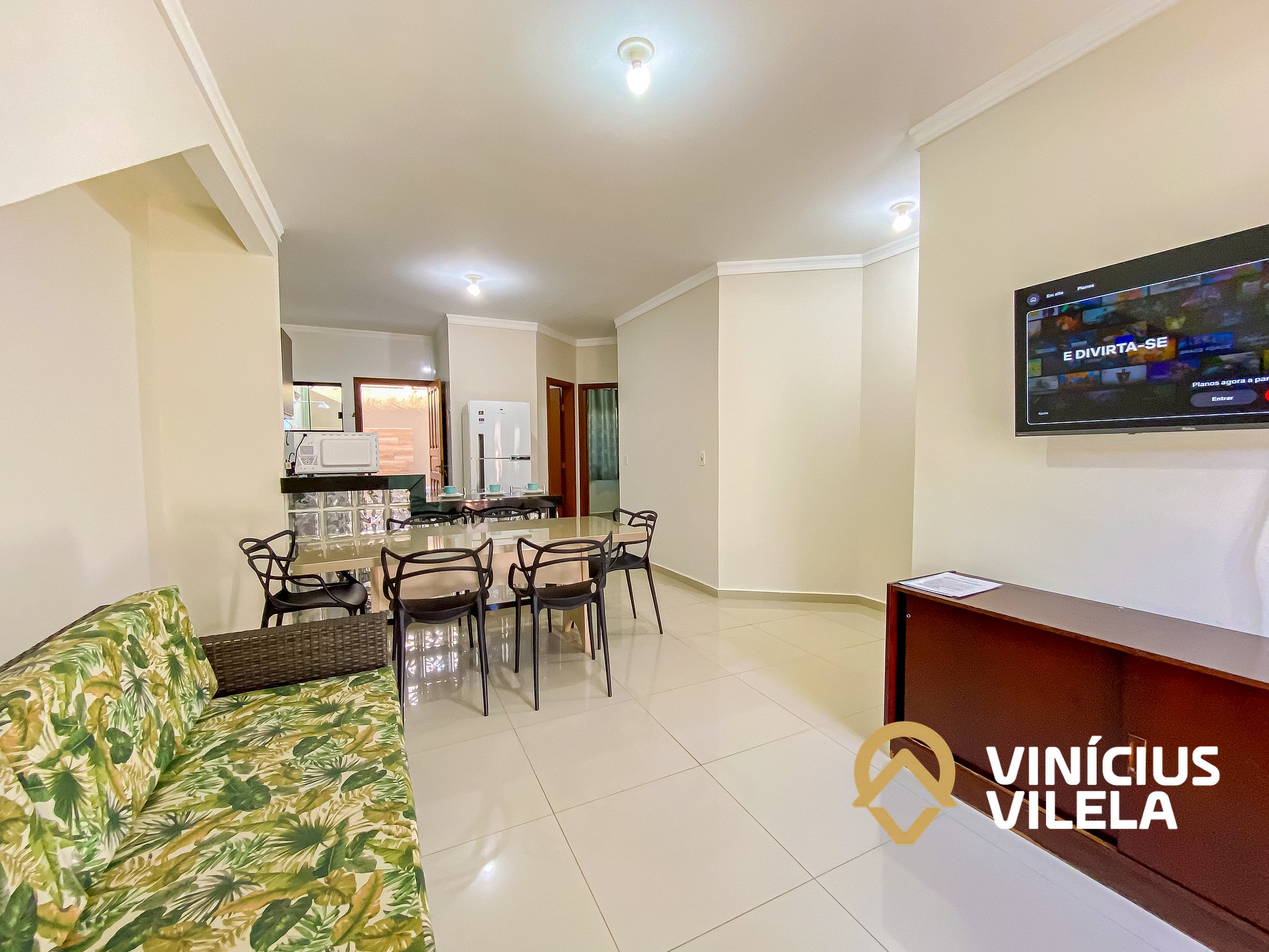 O apartamento conta com 3 quartos, sendo 1 suíte, todos com ar condicionado Split, roupas de cama e banho, na sala com rack, sofá e TV , internet Wi-fi 300MBPS exclusiva do apartamento. Sala de jantar com mesa, cozinha completa com armários , fogão, airfrier, micro ondas, forno elétrico e utensílios, além de área de serviço com maquina lavar.