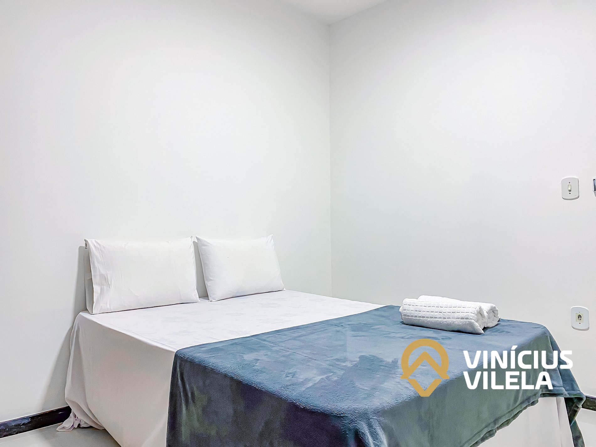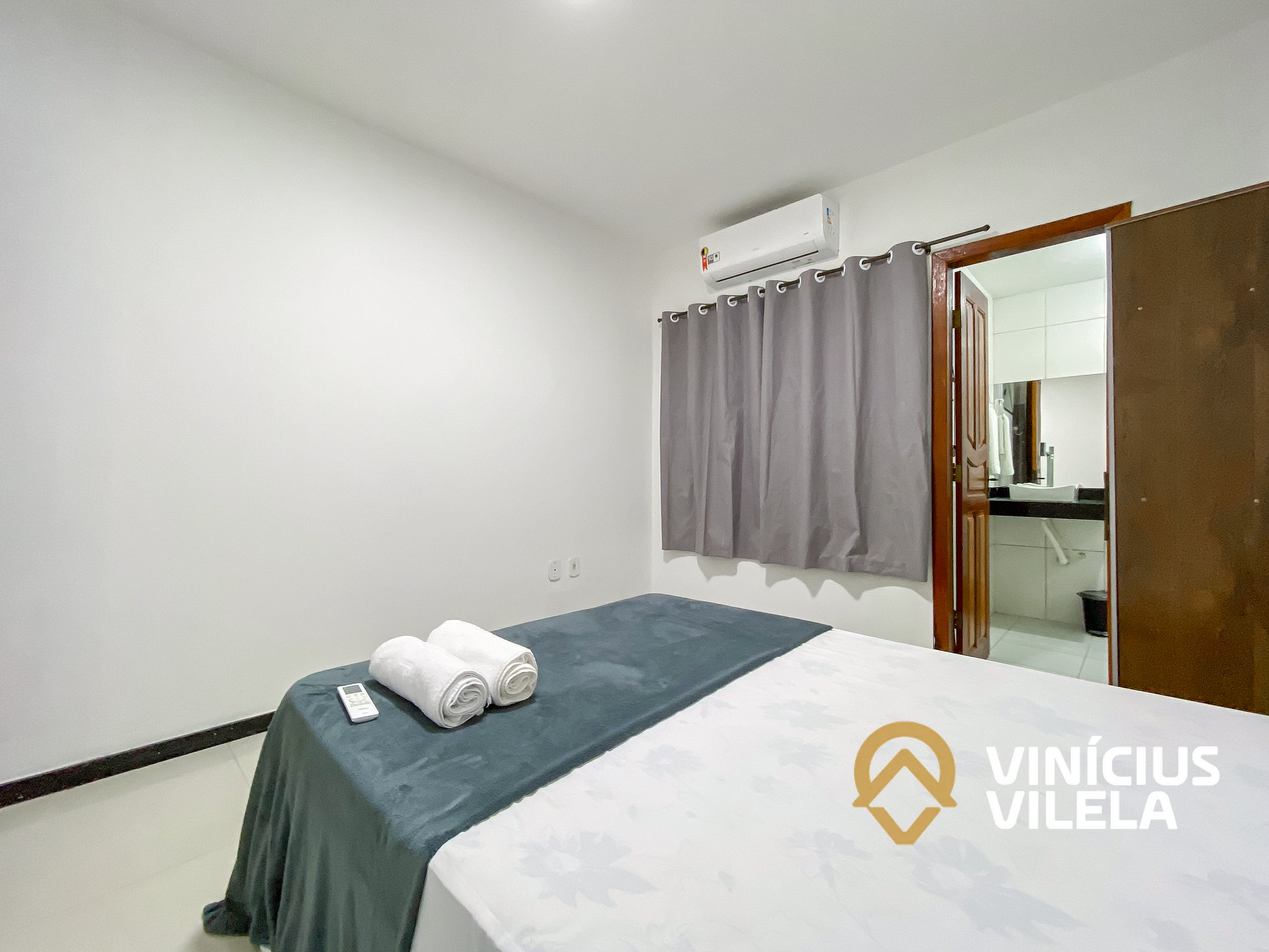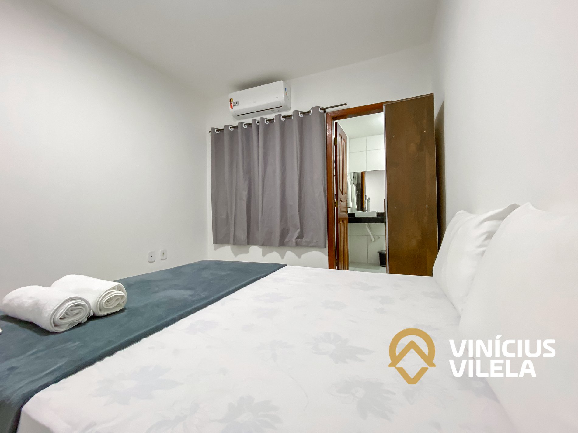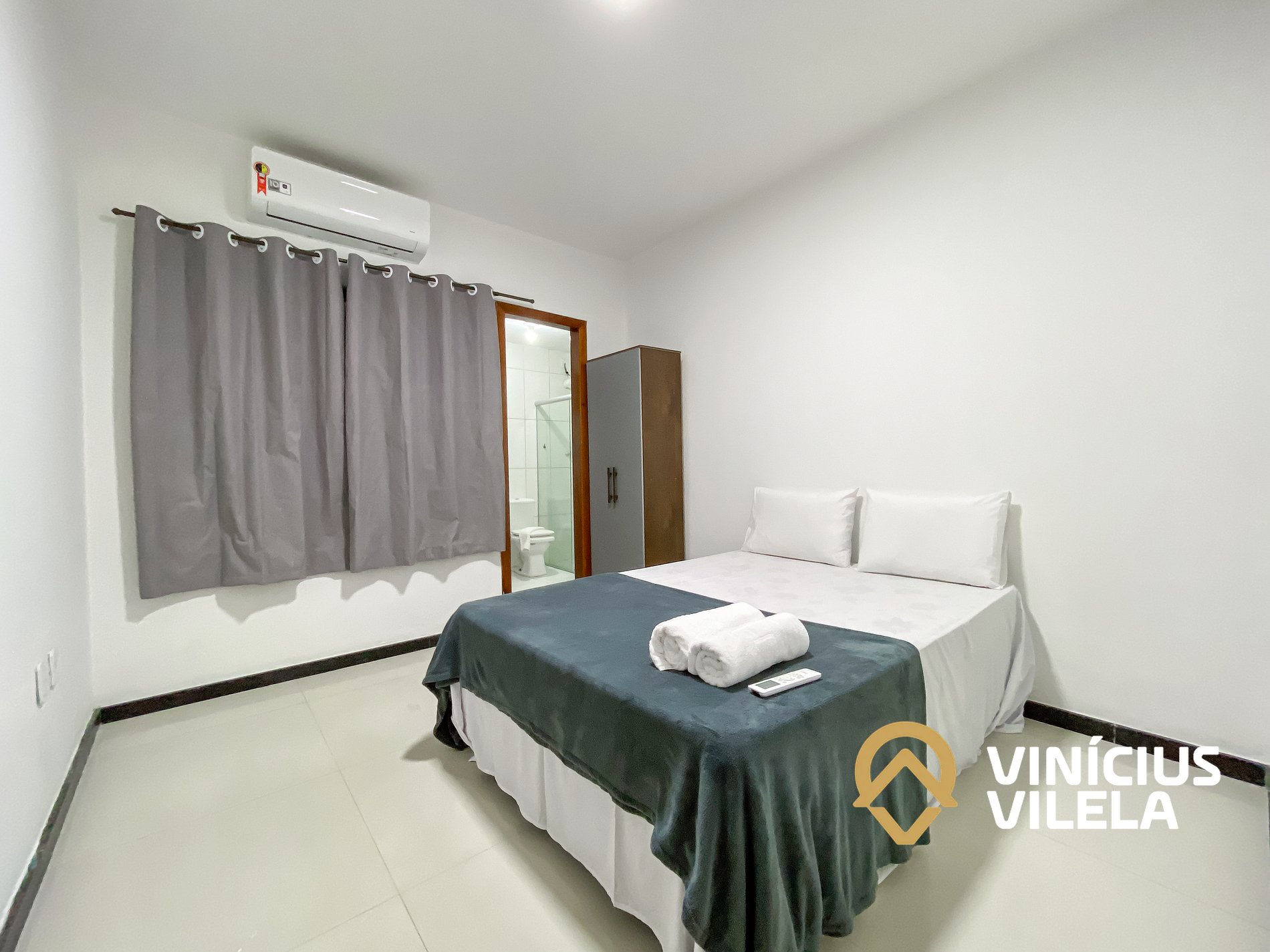 Um quarto (suíte) possui ar-condicionado, 01 cama de casal , travesseiros,. Oferecemos o enxoval de cama e banho (1 unidade para cada hospede conforme a contratação). No quarto você ainda terá um roupeiro e ferro de passar.