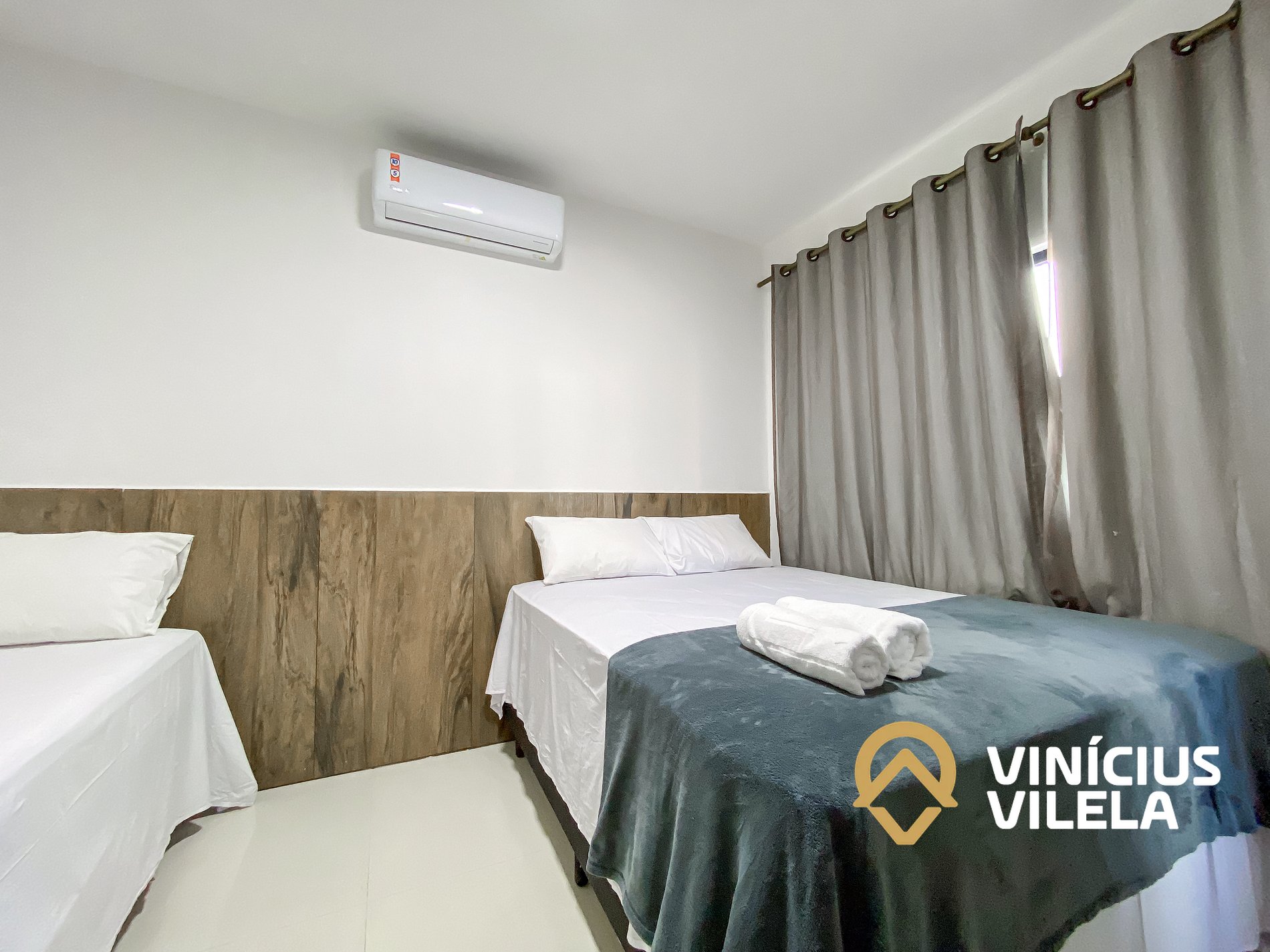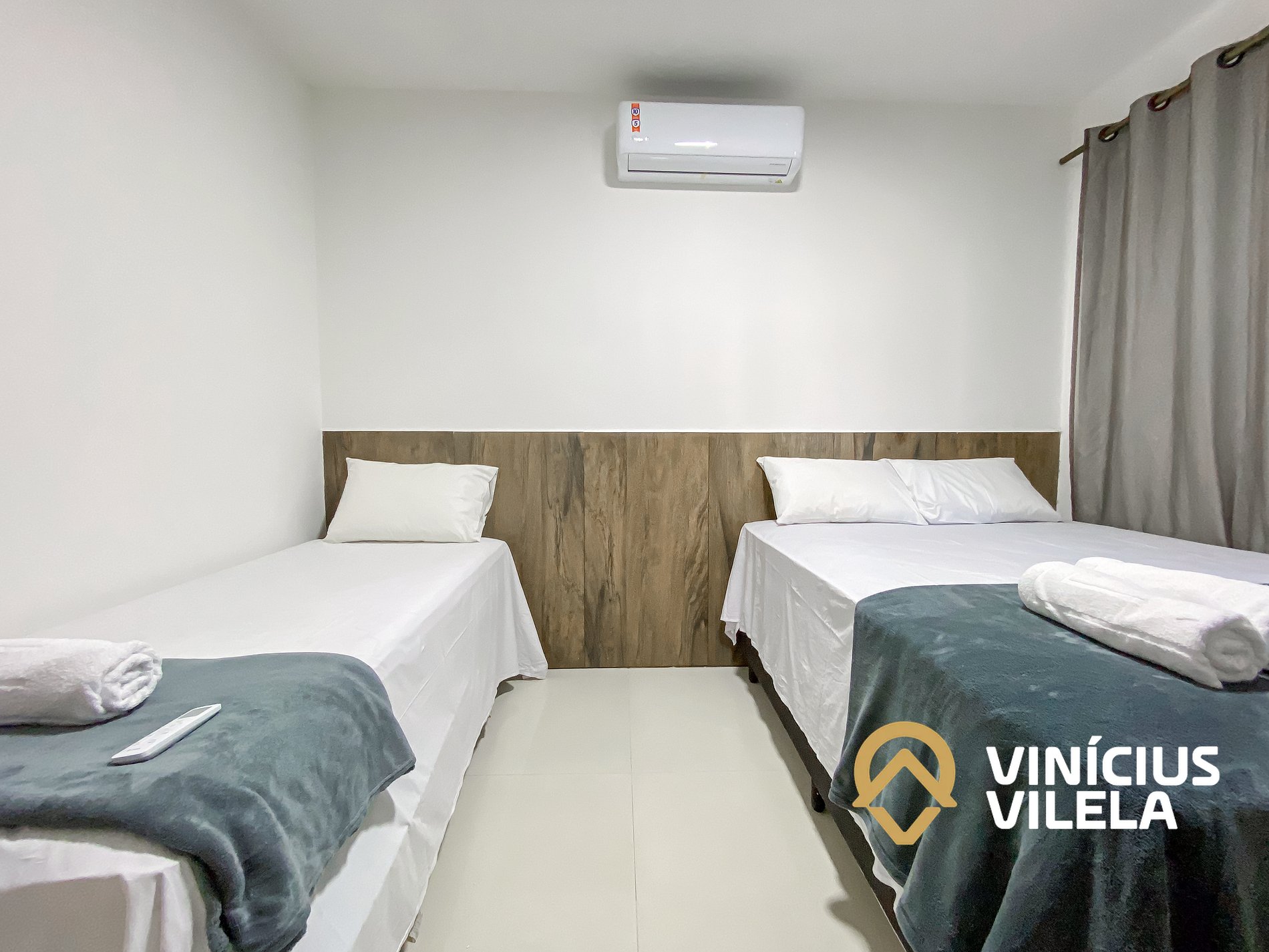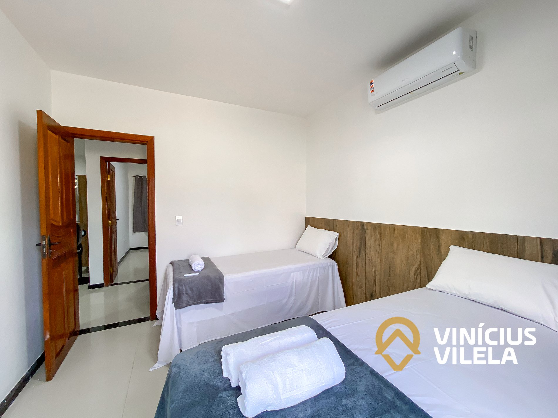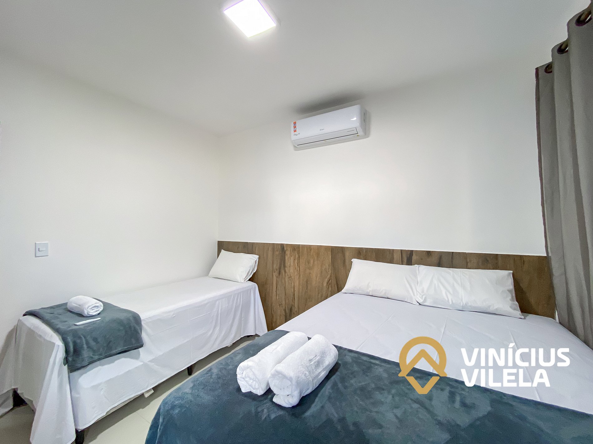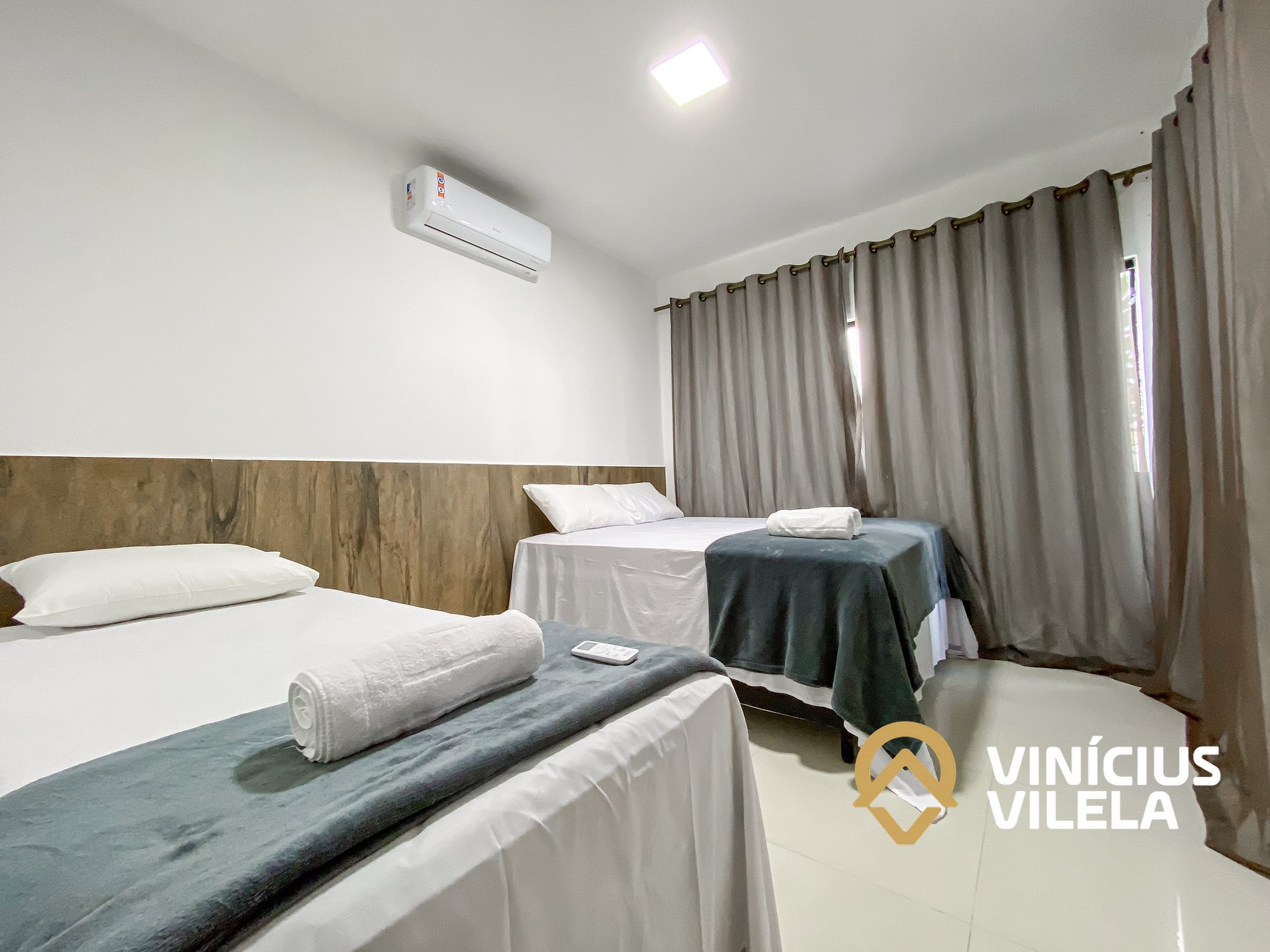 O outro quarto possui ar condicionado, 02 camas de solteiro, travesseiros ,enxoval de cama e banho(1 unidade para cada hospede conforme a contratação).