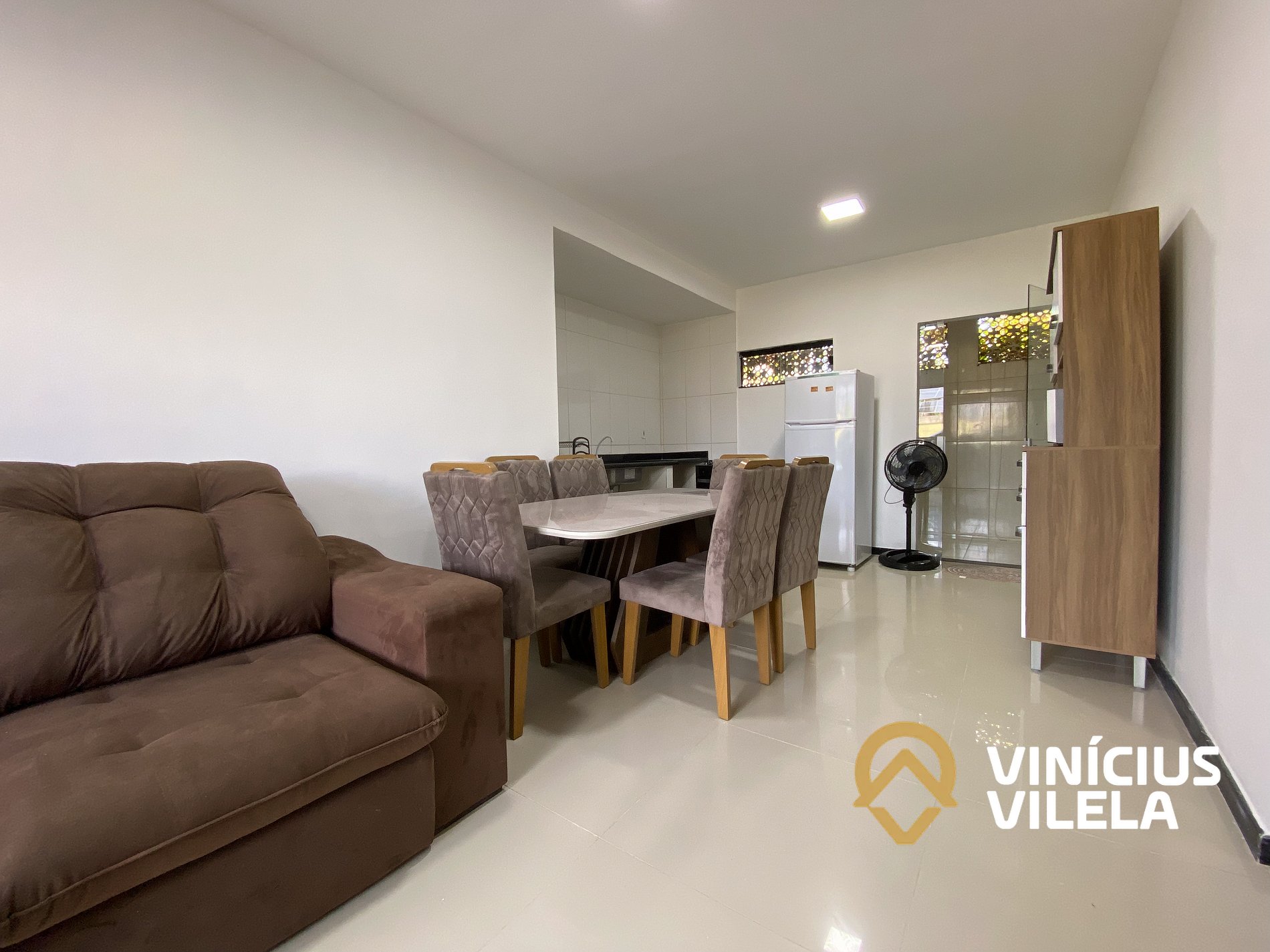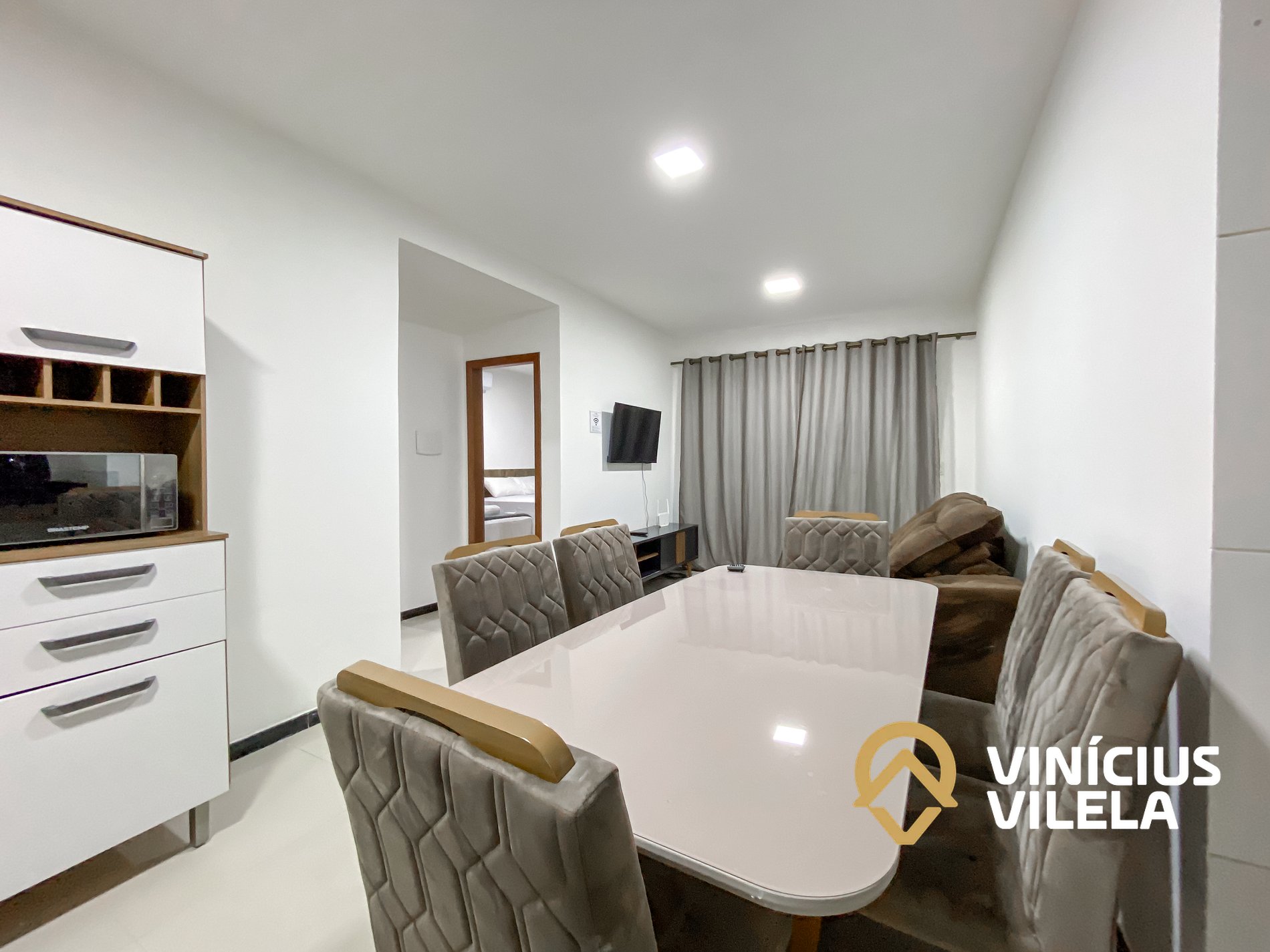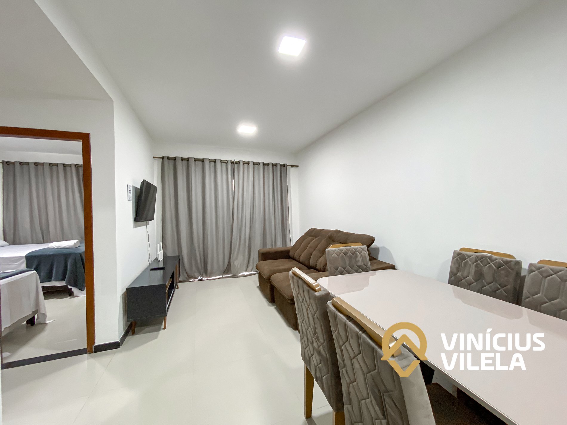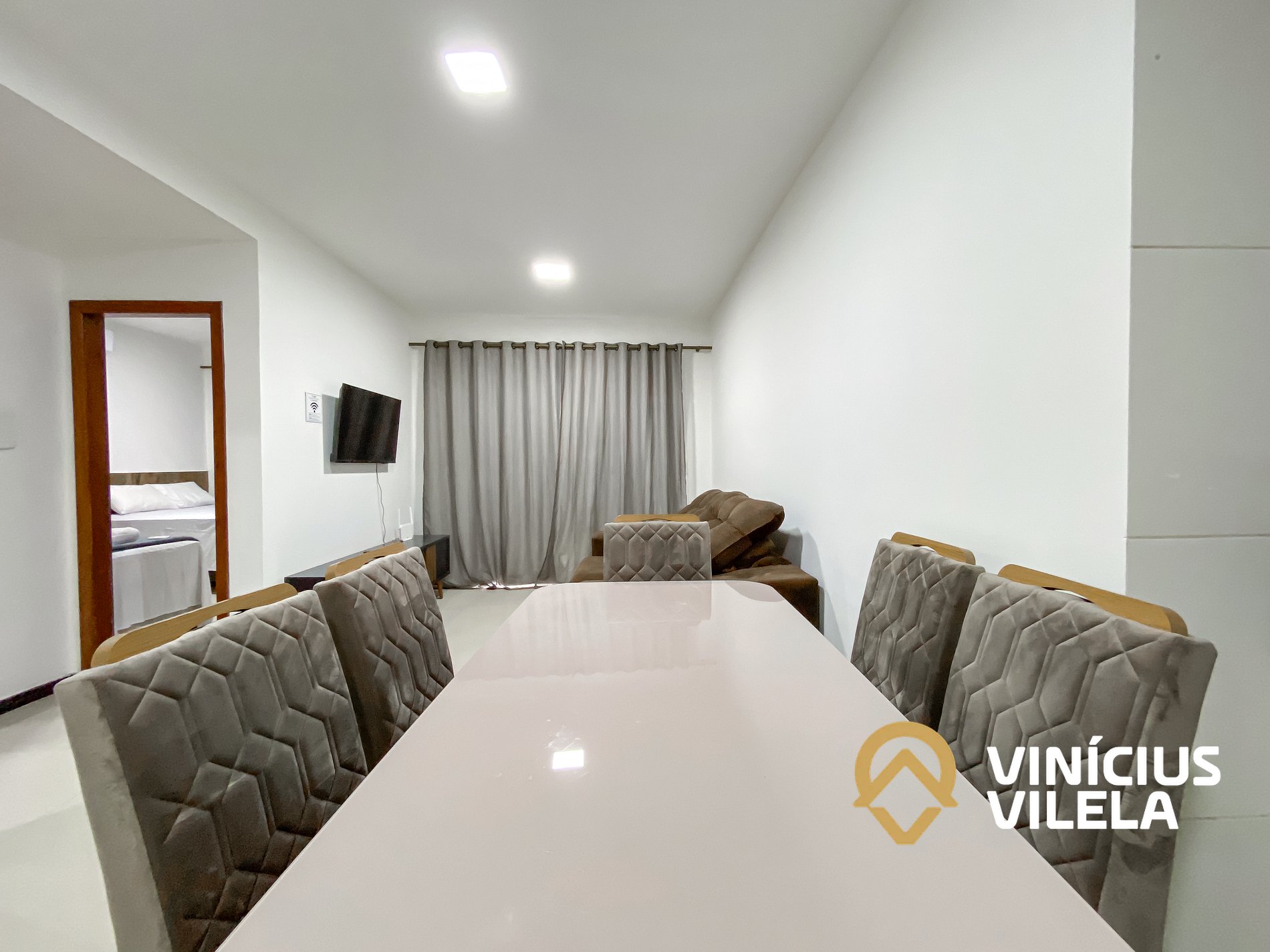 Logo na entrada possui uma sala com sofá cama , rack e TV tela plana, Mesa com 6 cadeiras.