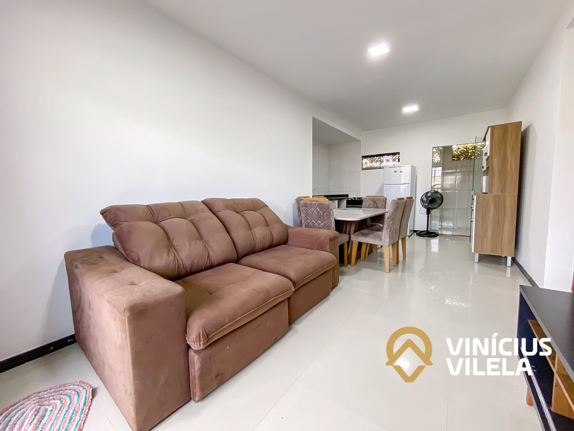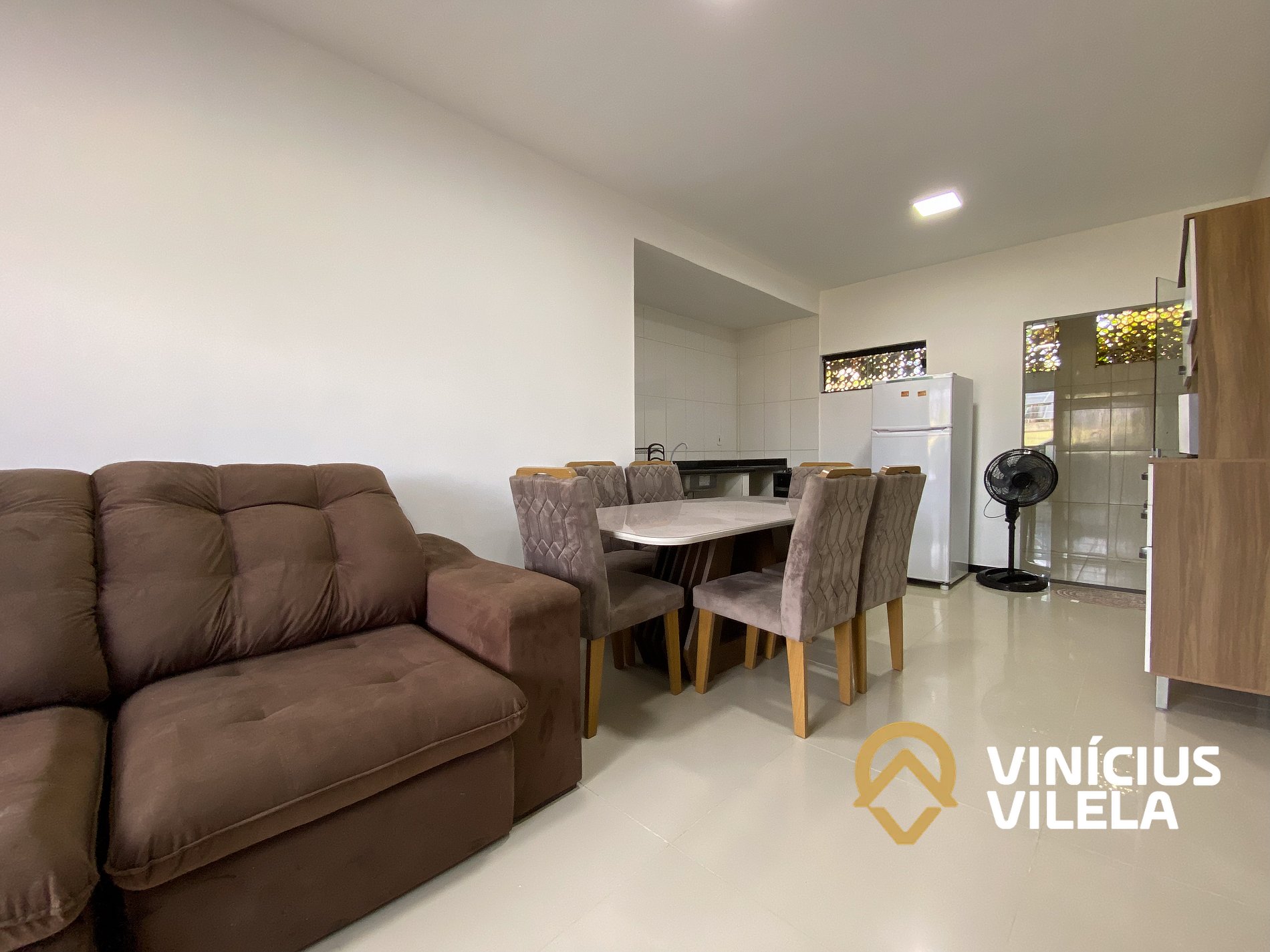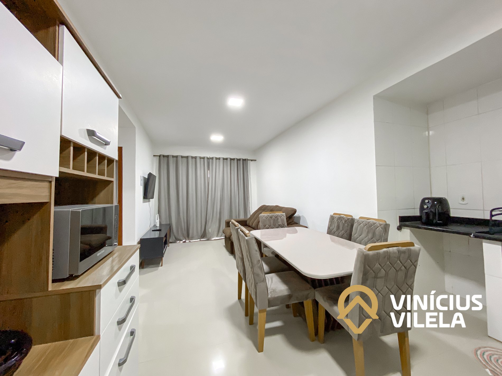 Logo na entrada possui uma sala com sofá cama , rack e TV tela plana, Mesa com 6 cadeiras.