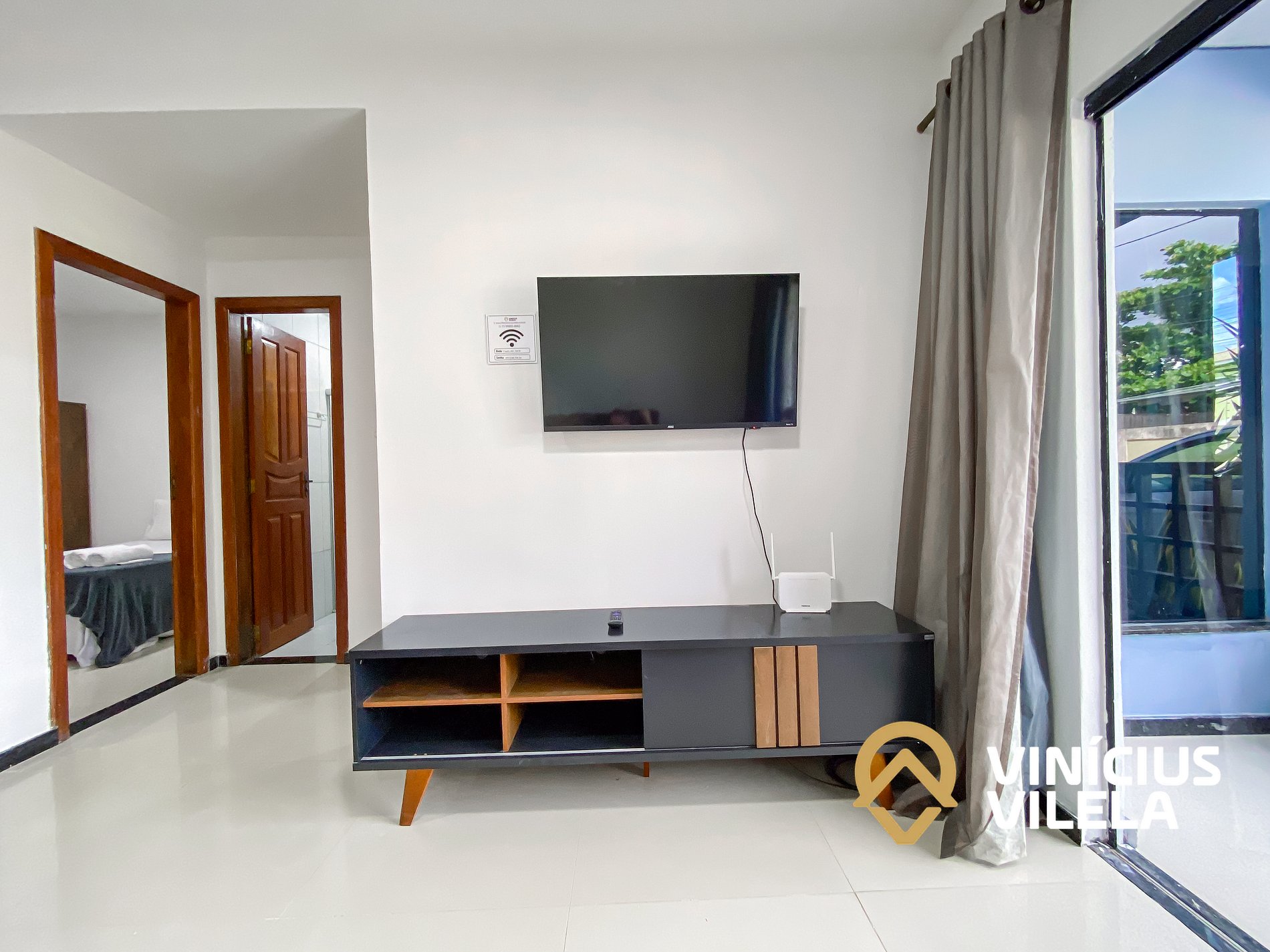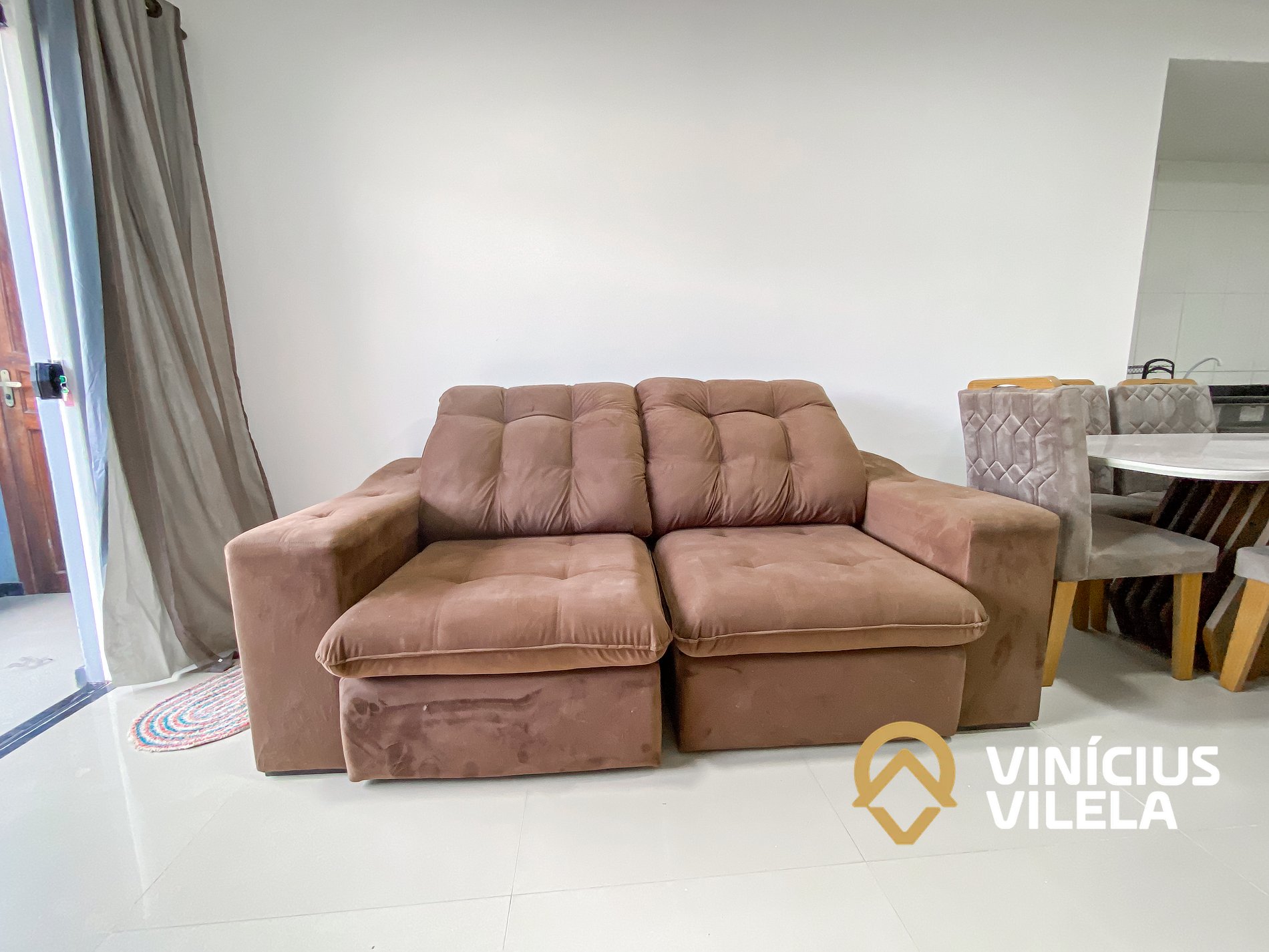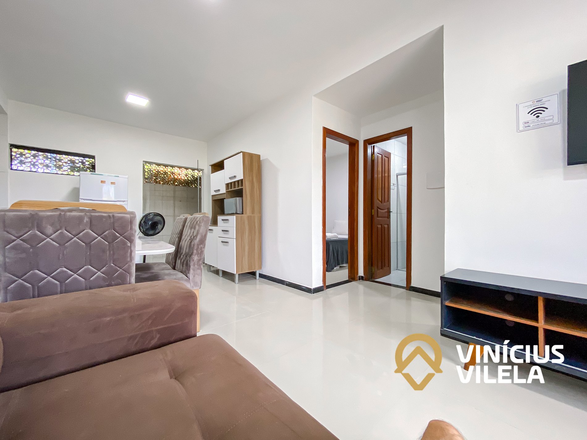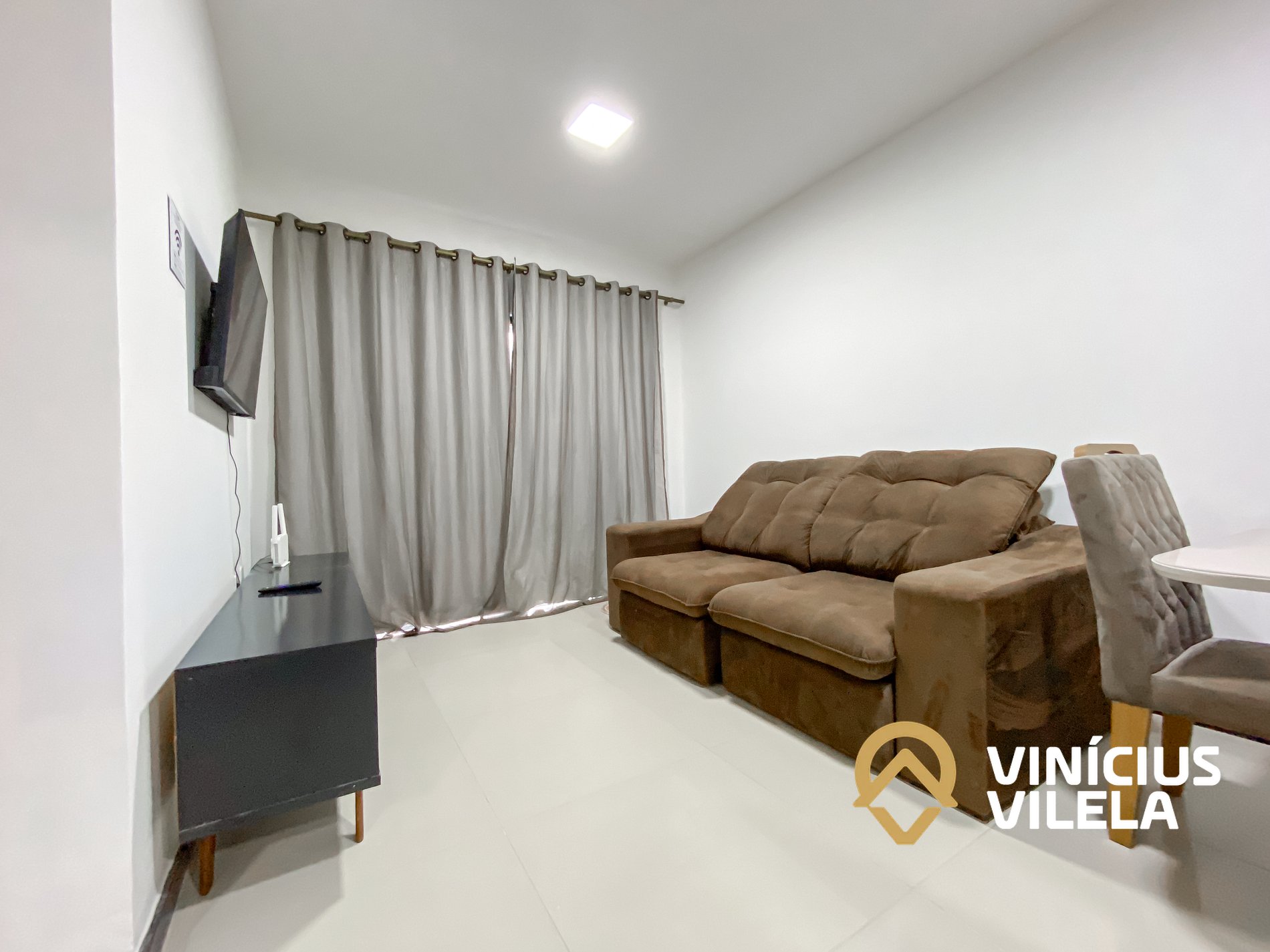 Logo na entrada possui uma sala com sofá cama , rack e TV tela plana, Mesa com 6 cadeiras.