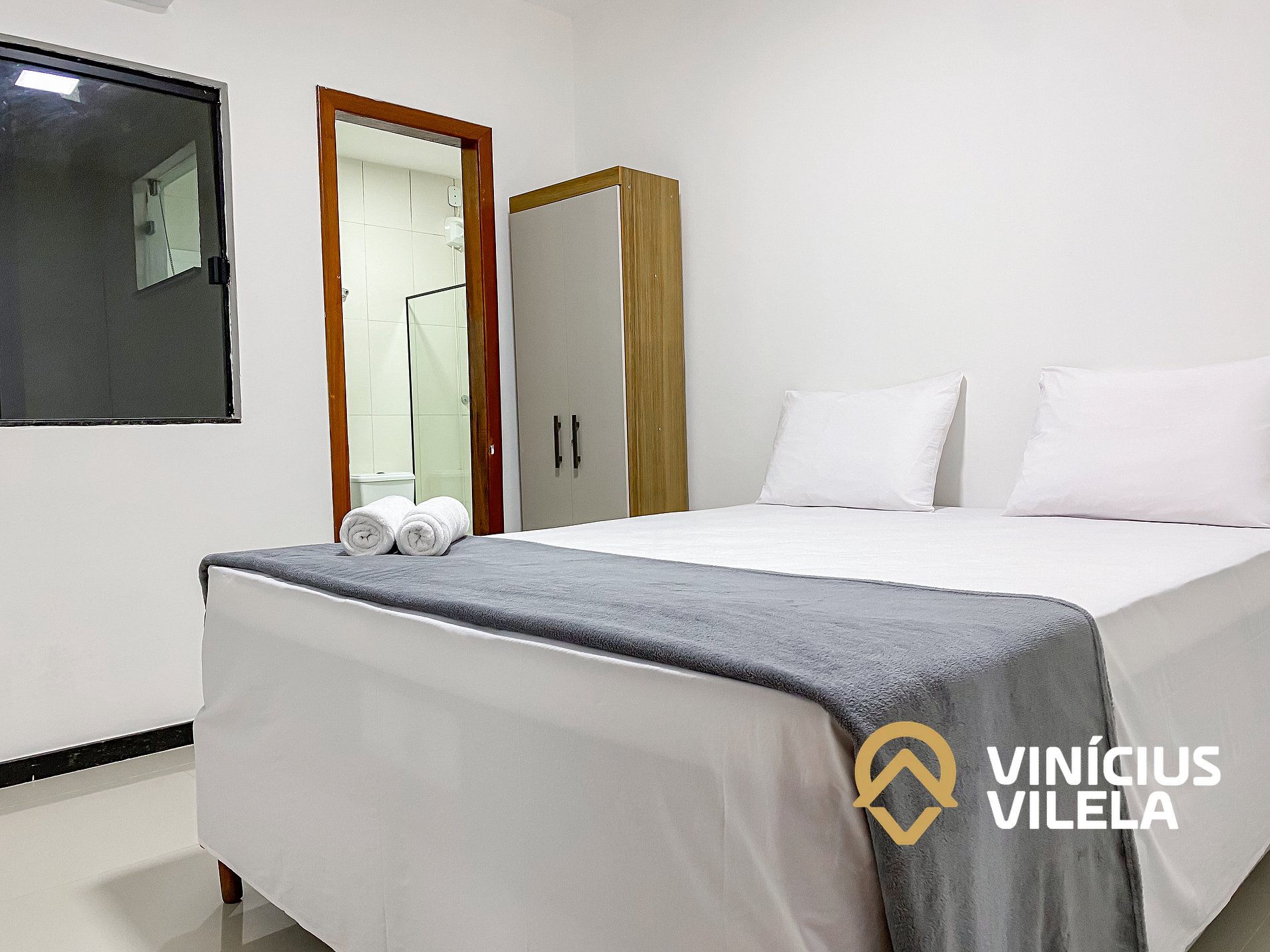 Um quarto (suíte) possui ar-condicionado, 01 cama de casal , travesseiros,. Oferecemos o enxoval de cama e banho (1 unidade para cada hospede conforme a contratação). No quarto você ainda terá um roupeiro.