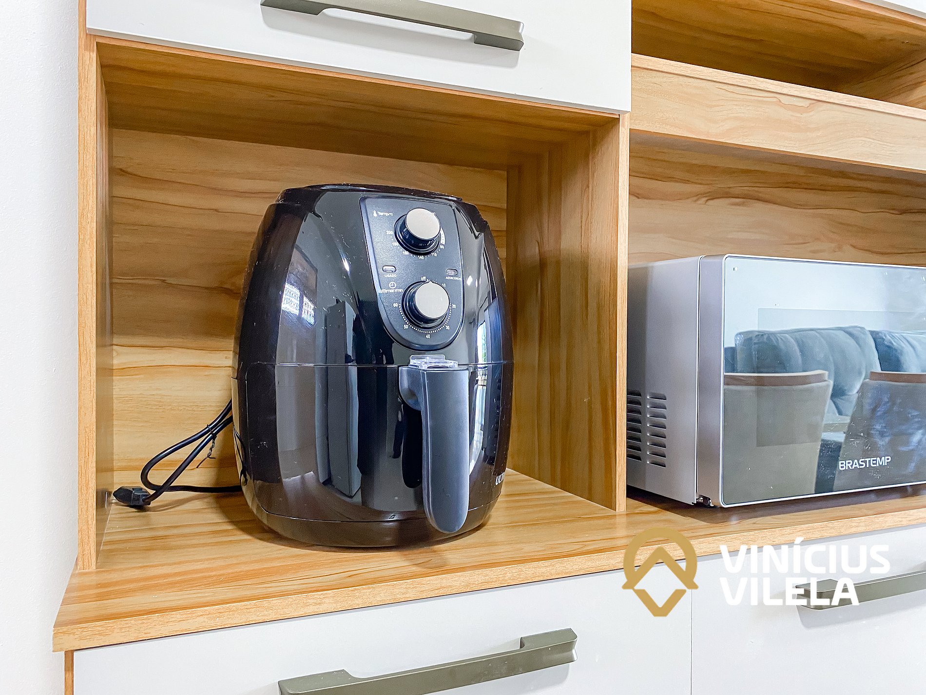 A cozinha oferece eletrodomésticos como, fogão, airfryer geladeira, utensílios, panelas, talheres, pratos, xícaras, garrafa térmica de café ,copos de vidro, e nas gavetas sempre você vai encontrar utensílios essenciais em uma cozinha.