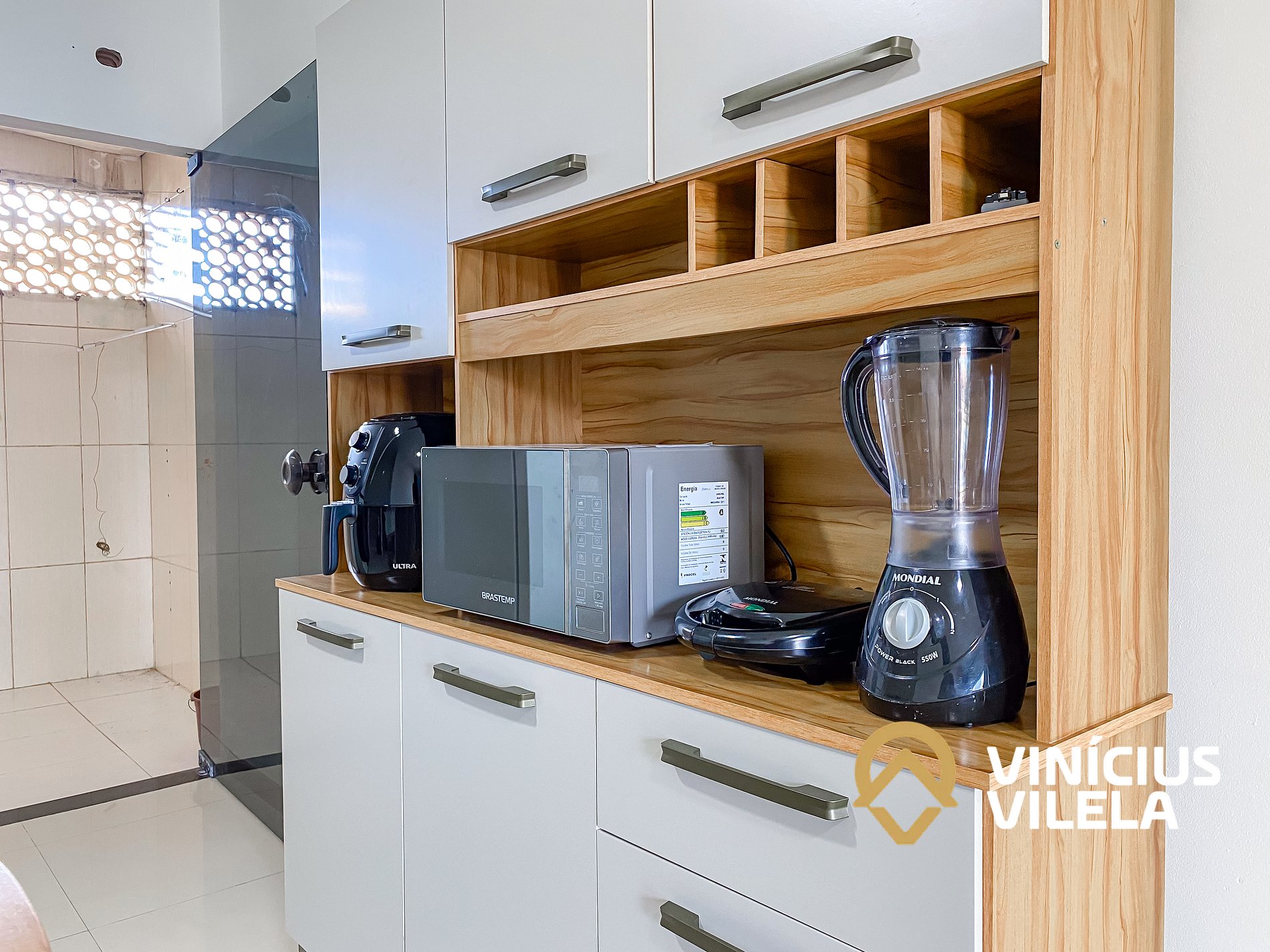 A cozinha oferece eletrodomésticos como, fogão, airfryer geladeira, utensílios, panelas, talheres, pratos, xícaras, garrafa térmica de café ,copos de vidro, e nas gavetas sempre você vai encontrar utensílios essenciais em uma cozinha.