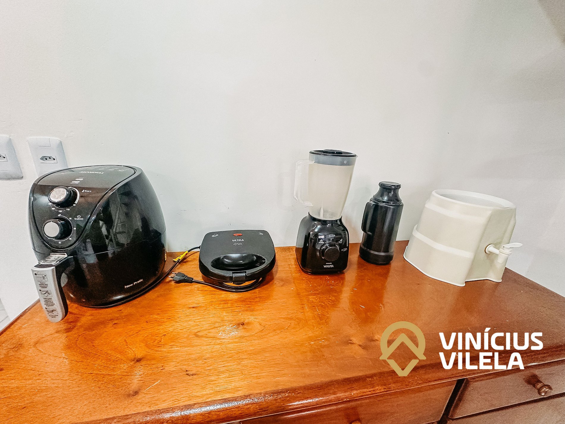 A cozinha é bem completa e oferece eletrodomésticos como liquidificador, micro-ondas,