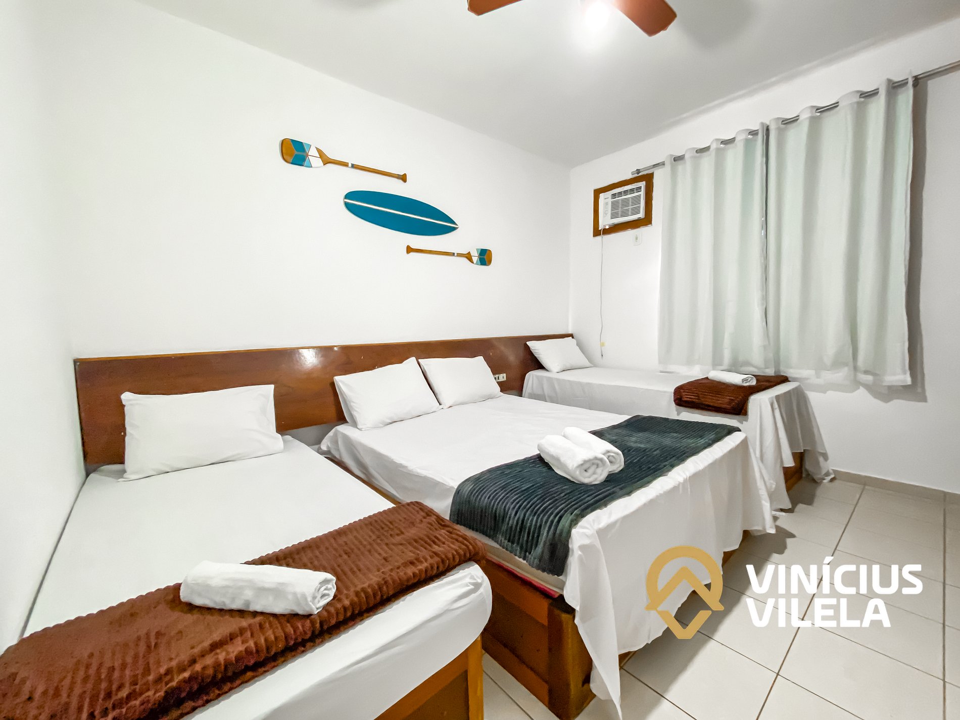 Apartamento no pavimento superior do Condomínio American Praia, em frente à Praia de Taperapuã, com acesso imediato ao mar, basta atravessar a rua. Possui 1 quarto com ar-condicionado, cama de casal e de solteiro, sala com sofá-cama e TV, cozinha completa e banheiro social. Condomínio com portaria 24h, piscina e 1 vaga de garagem, cercado por comércios e restaurantes acessíveis a pé.
