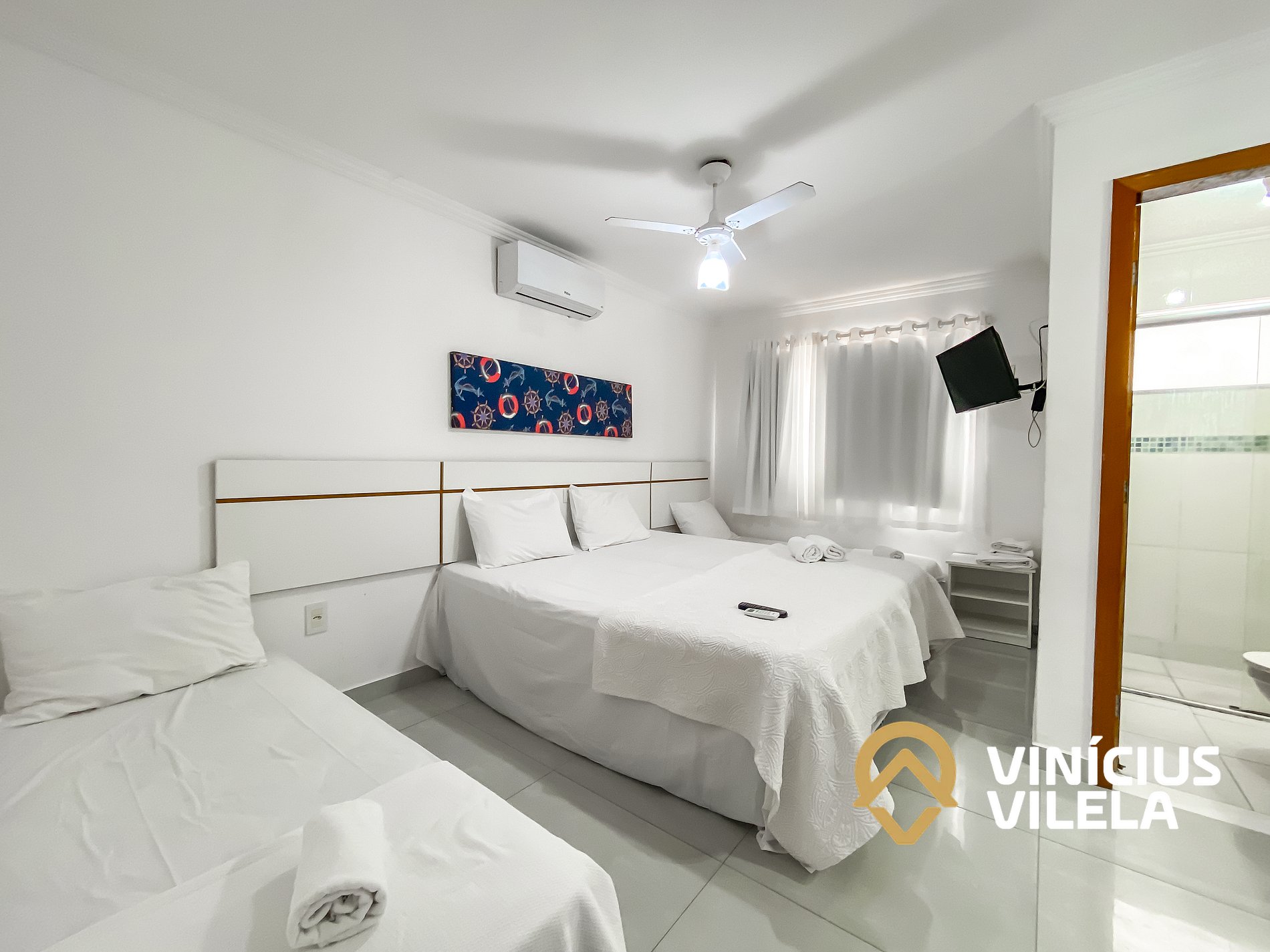 A suíte possui ar condicionado, ventilador de teto, TV, 1 cama de casal com 2 camas de solteiro, travesseiros ,enxoval de cama e banho, roupeiro para armazenar suas bagagens.