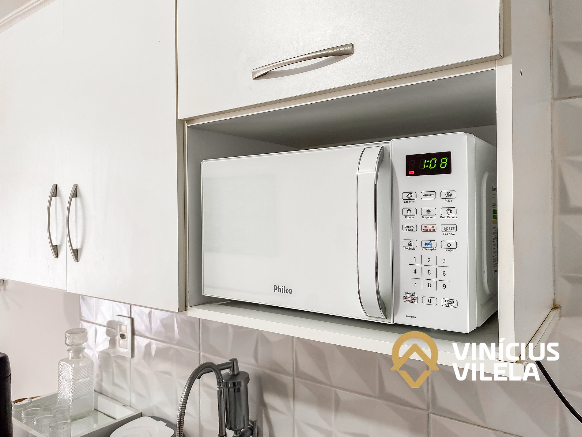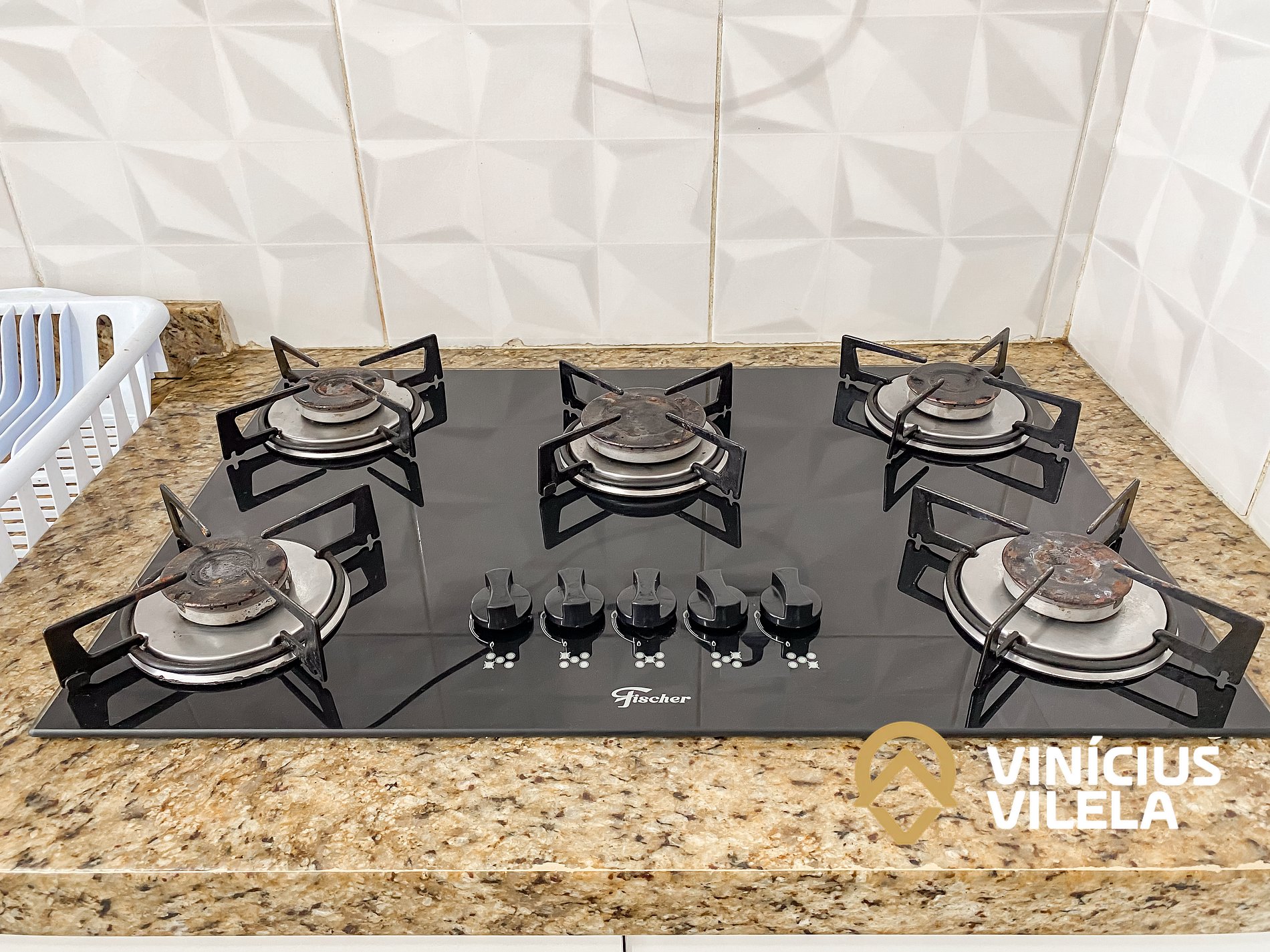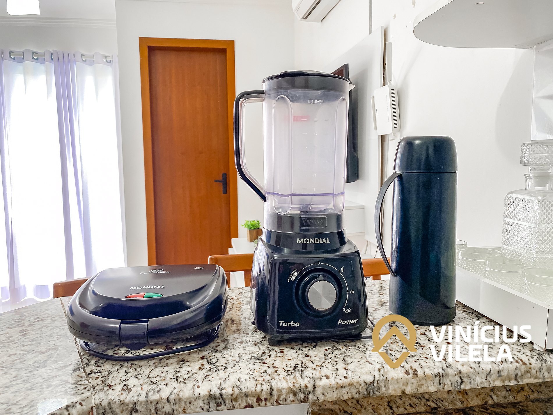 A cozinha é bem completa e oferece eletrodomésticos como liquidificador, micro-ondas, sanduicheira, voltou, airfryer, geladeira, forno, utensílios, panelas, talheres, pratos, xícaras, garrafa térmica de café ,copos de vidro, e nas gavetas sempre você vai encontrar pano de prato e outros utensílios essenciais em uma cozinha.