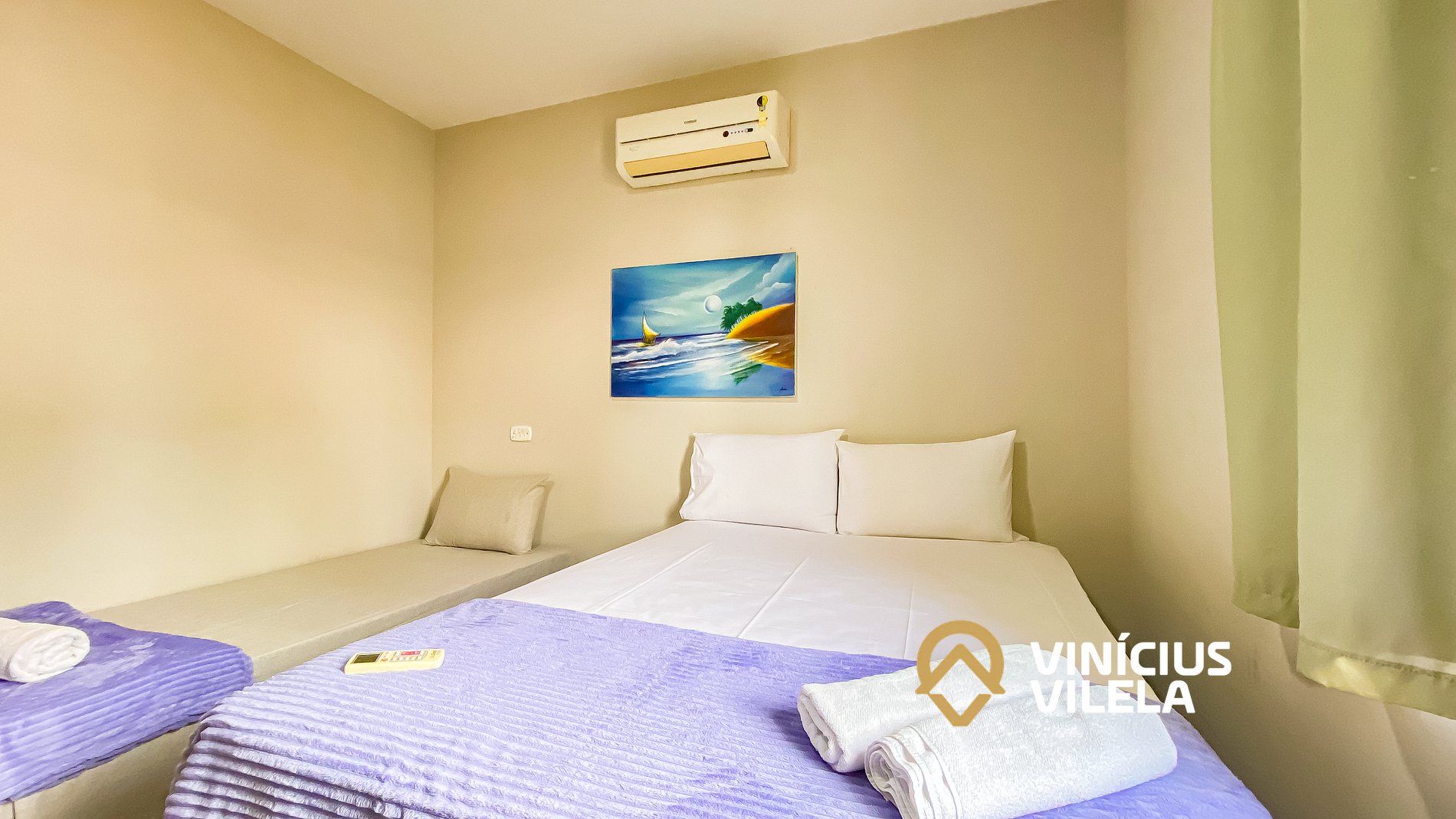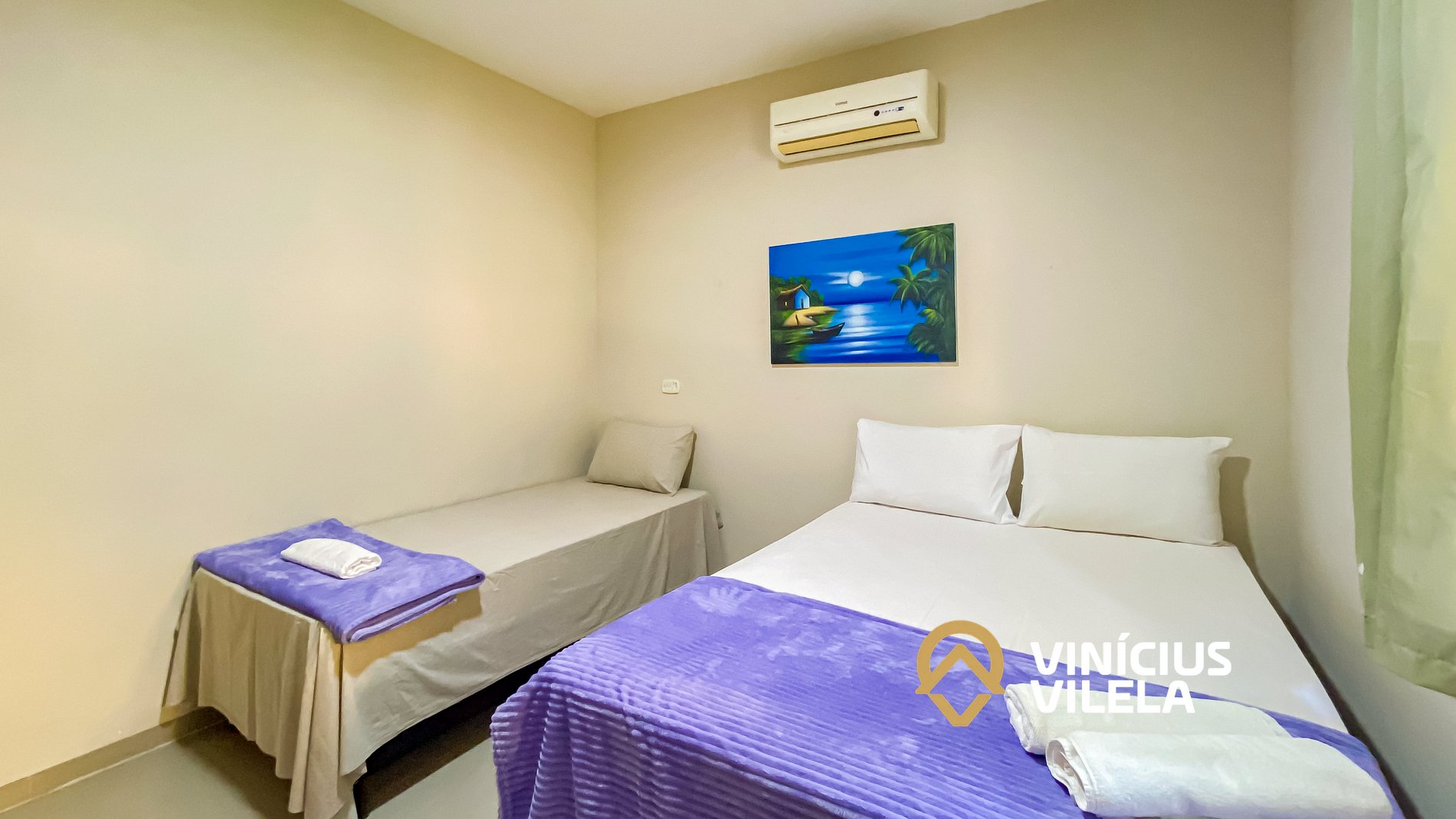 A suíte possui ar-condicionado, 01 cama de casal e uma de solteiro, travesseiros,. Oferecemos o enxoval de cama e banho (1 unidade para cada hospede conforme a contratação). No quarto você ainda terá um roupeiro.