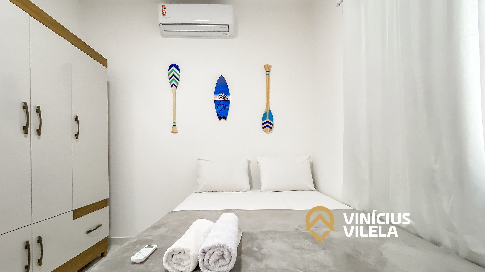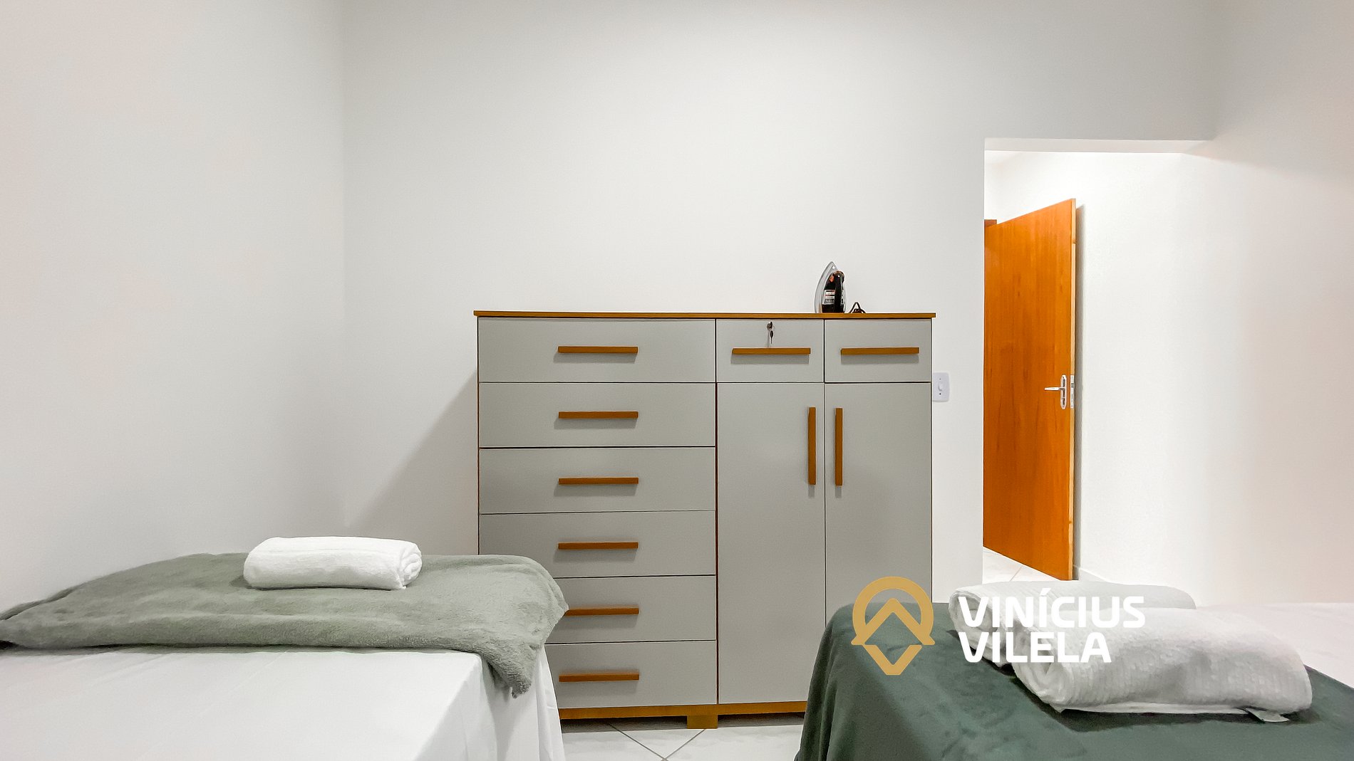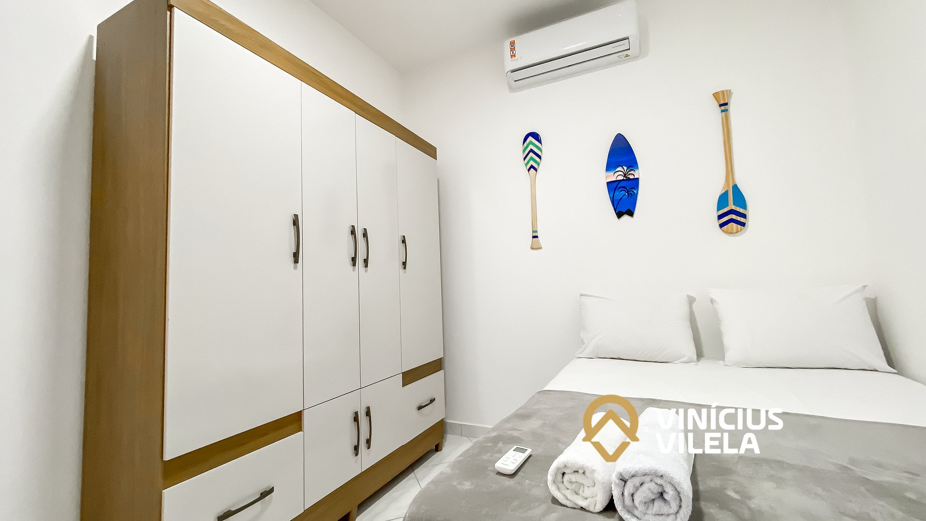 A suíte possui ar-condicionado, 01 cama de casal e uma de solteiro, travesseiros,. Oferecemos o enxoval de cama e banho (1 unidade para cada hospede conforme a contratação). No quarto você ainda terá um roupeiro.