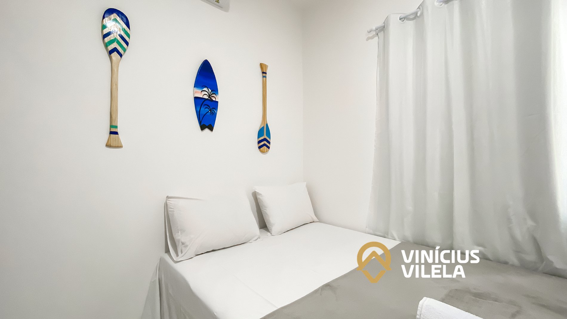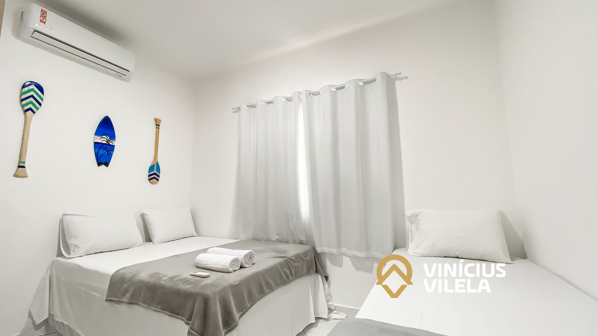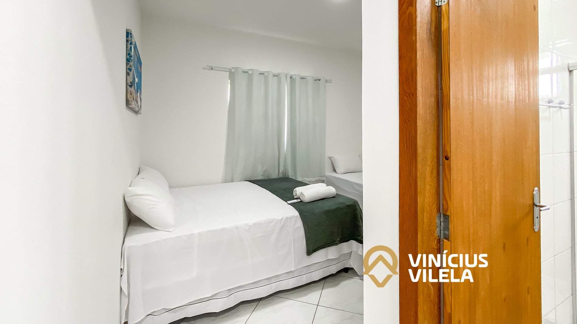 A suíte possui ar-condicionado, 01 cama de casal e uma de solteiro, travesseiros,. Oferecemos o enxoval de cama e banho (1 unidade para cada hospede conforme a contratação). No quarto você ainda terá um roupeiro.