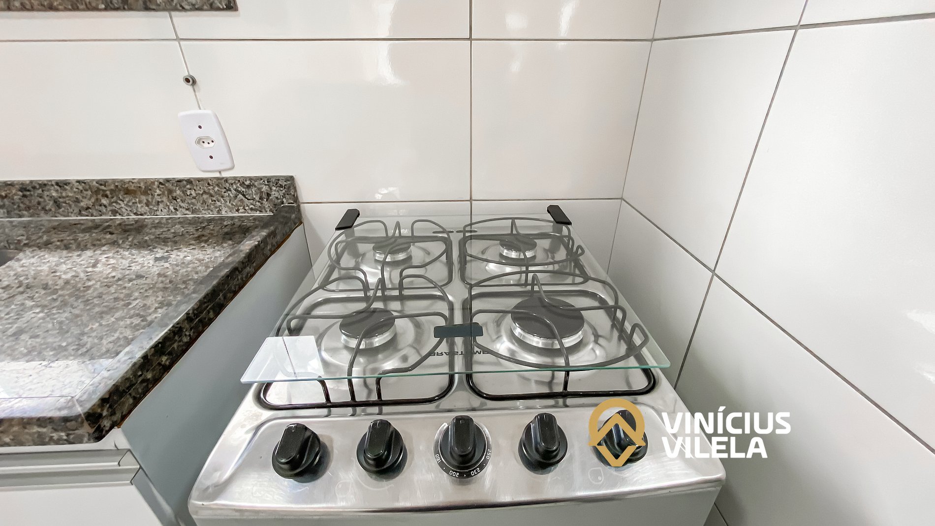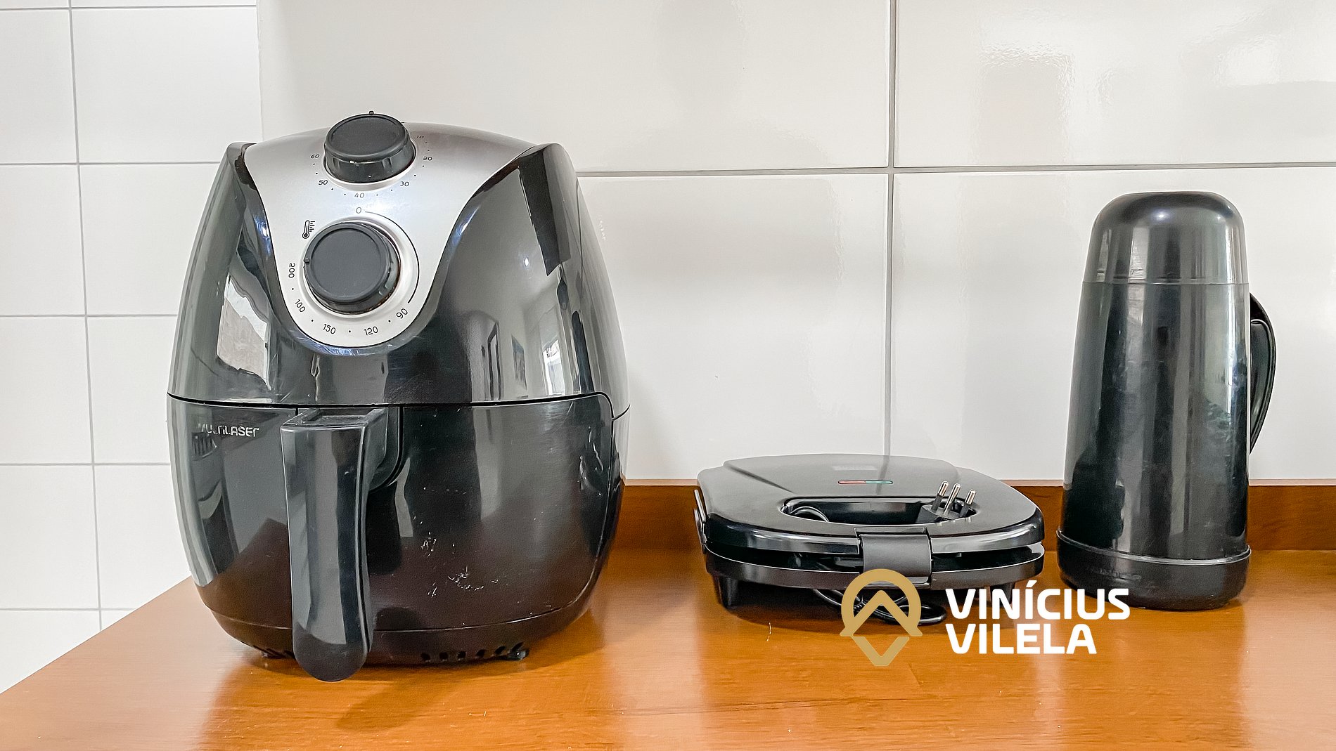 A cozinha oferece eletrodomésticos como, fogão, geladeira, airfryer, utensílios, panelas, talheres, pratos, xícaras, garrafa térmica de café ,copos de vidro, e nas gavetas sempre você vai encontrar utensílios essenciais em uma cozinha.