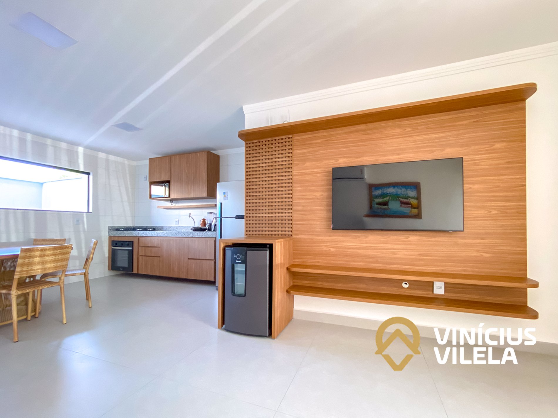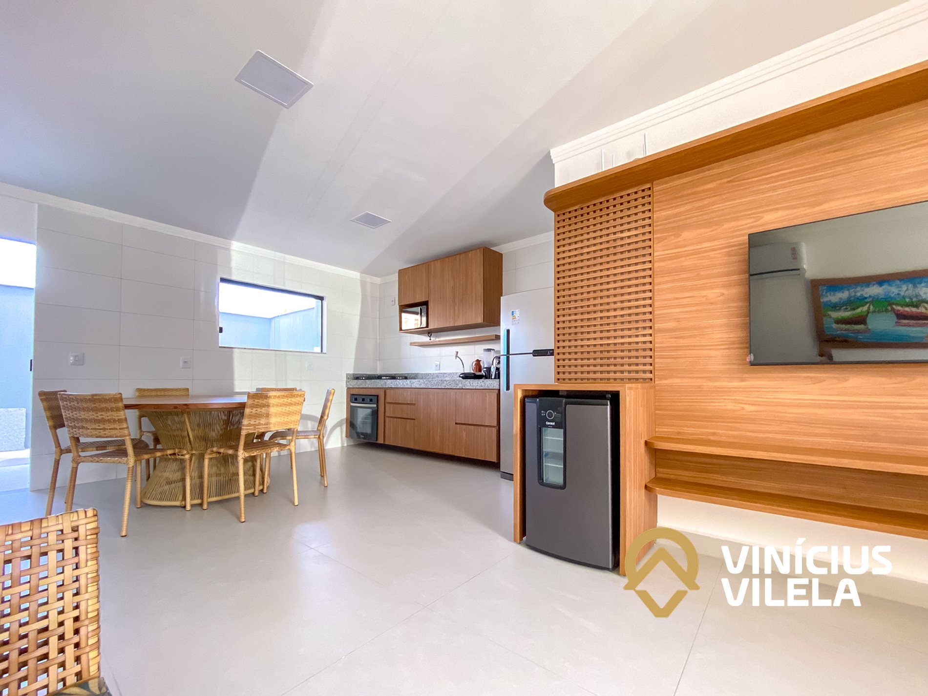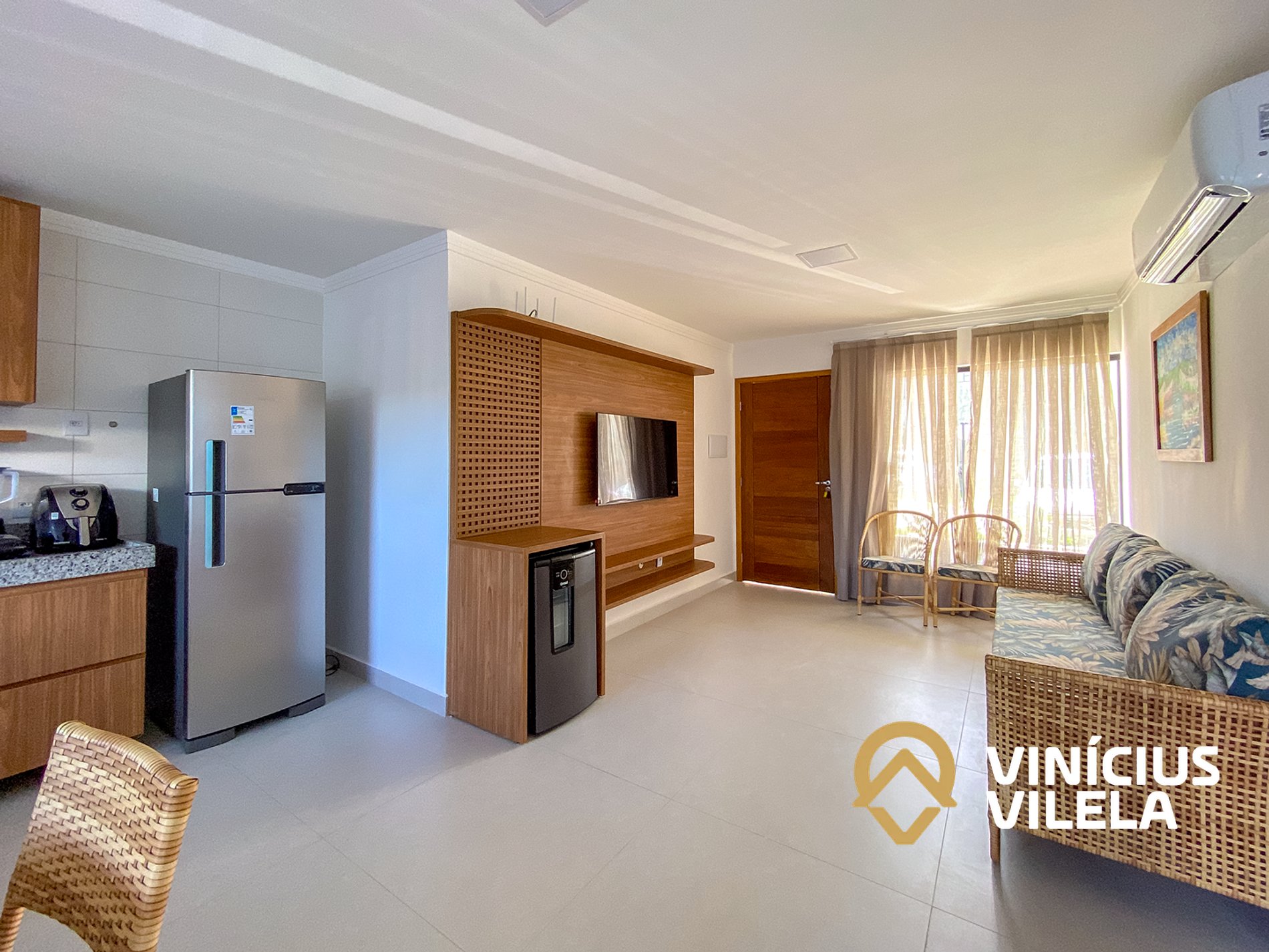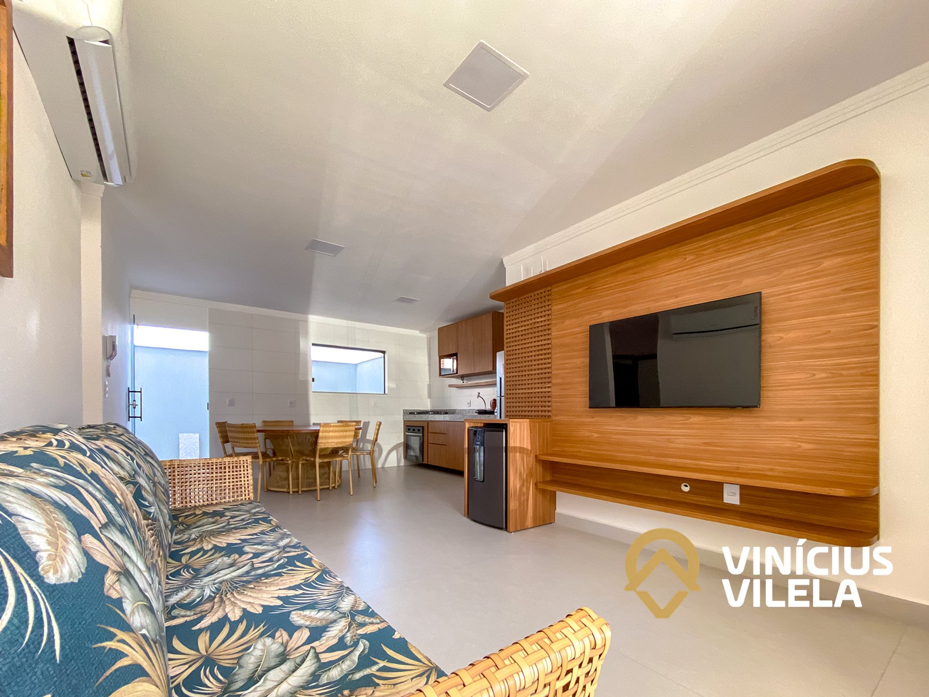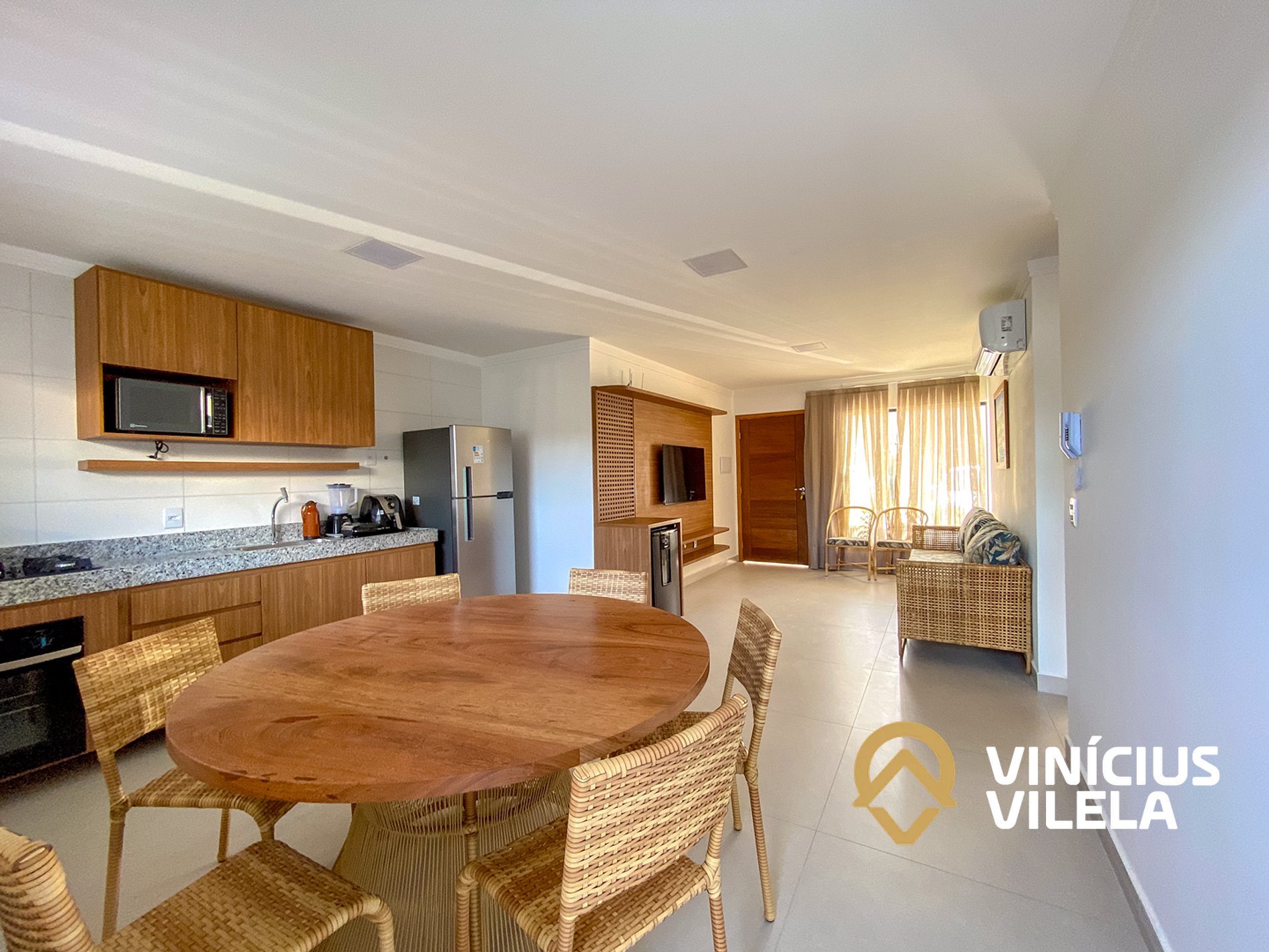 O apartamento 100% térreo conta com 3 quartos, sendo 1 suíte, todos com ar condicionado Split, ambos com 1 cama de casal e 2 de solteiro (cada), roupas de cama e banho, a sala climatizada com sofá, TV e cervejeira , internet Wi-fi 300MBPS exclusiva do apartamento. Sala de jantar com mesa, cozinha completa com armários , coktop, forno, airfrier, micro ondas e utensílios, área gourmet privativa, além de área de serviço .