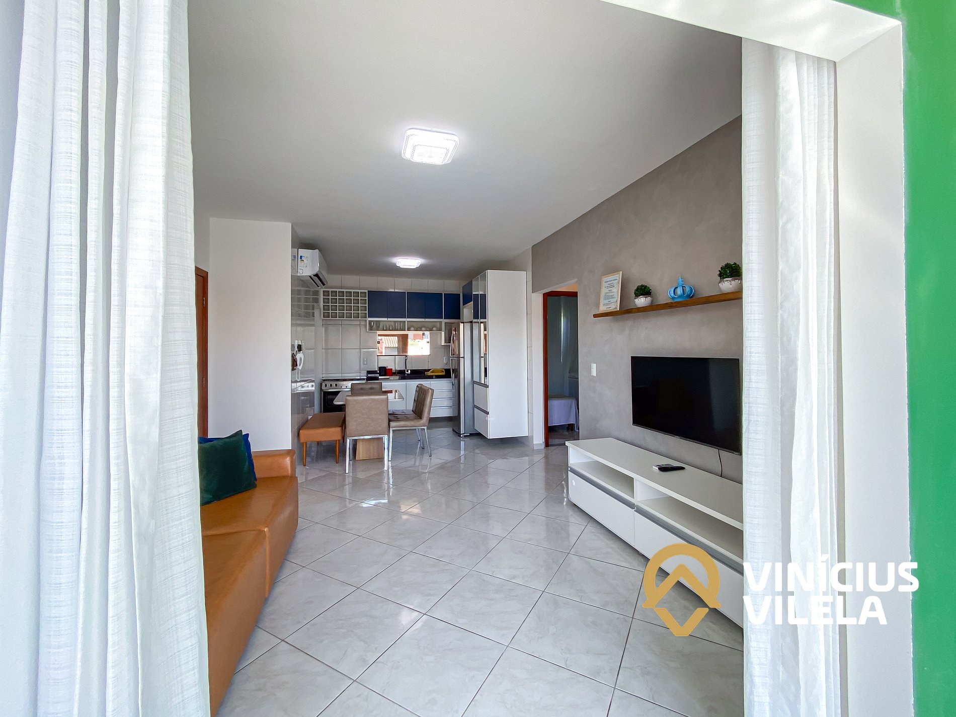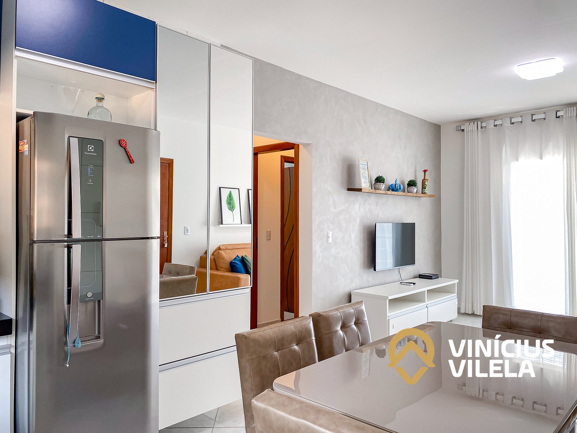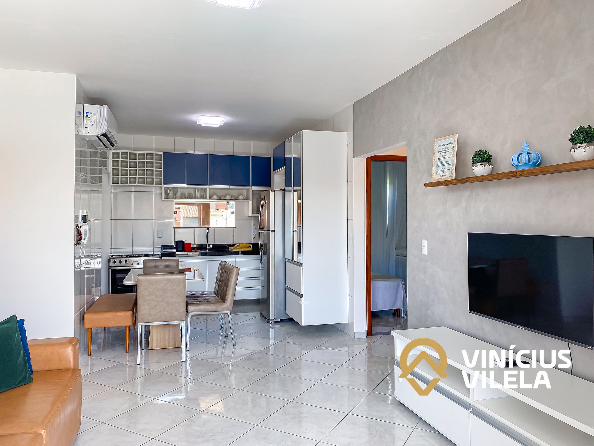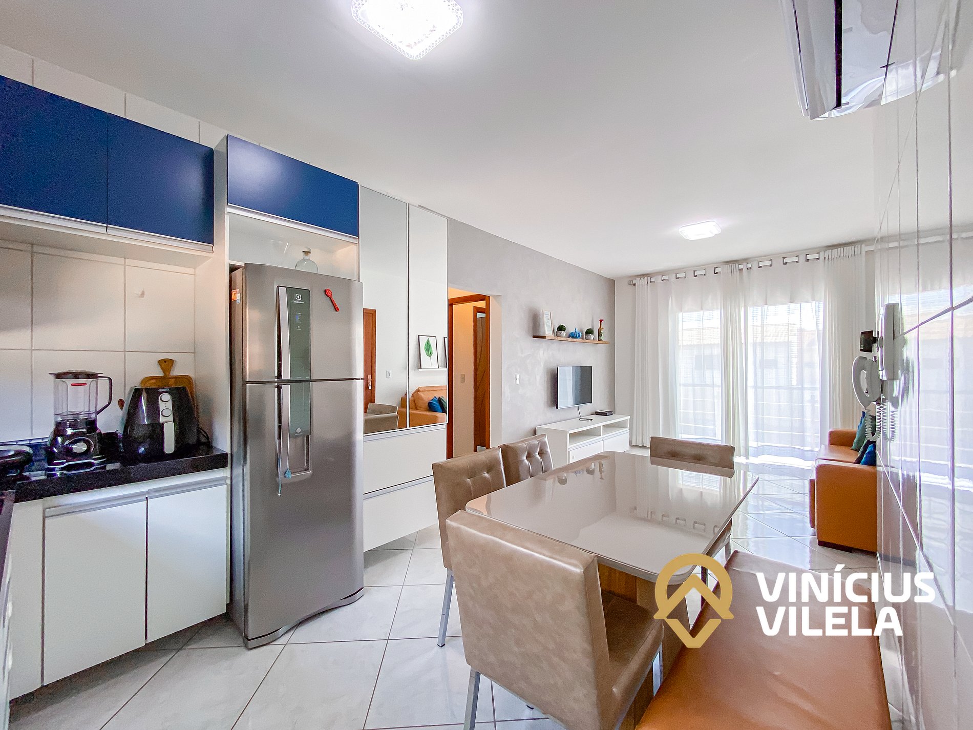 Logo na entrada, o apartamento conta com uma sala integrada à copa, equipada com: