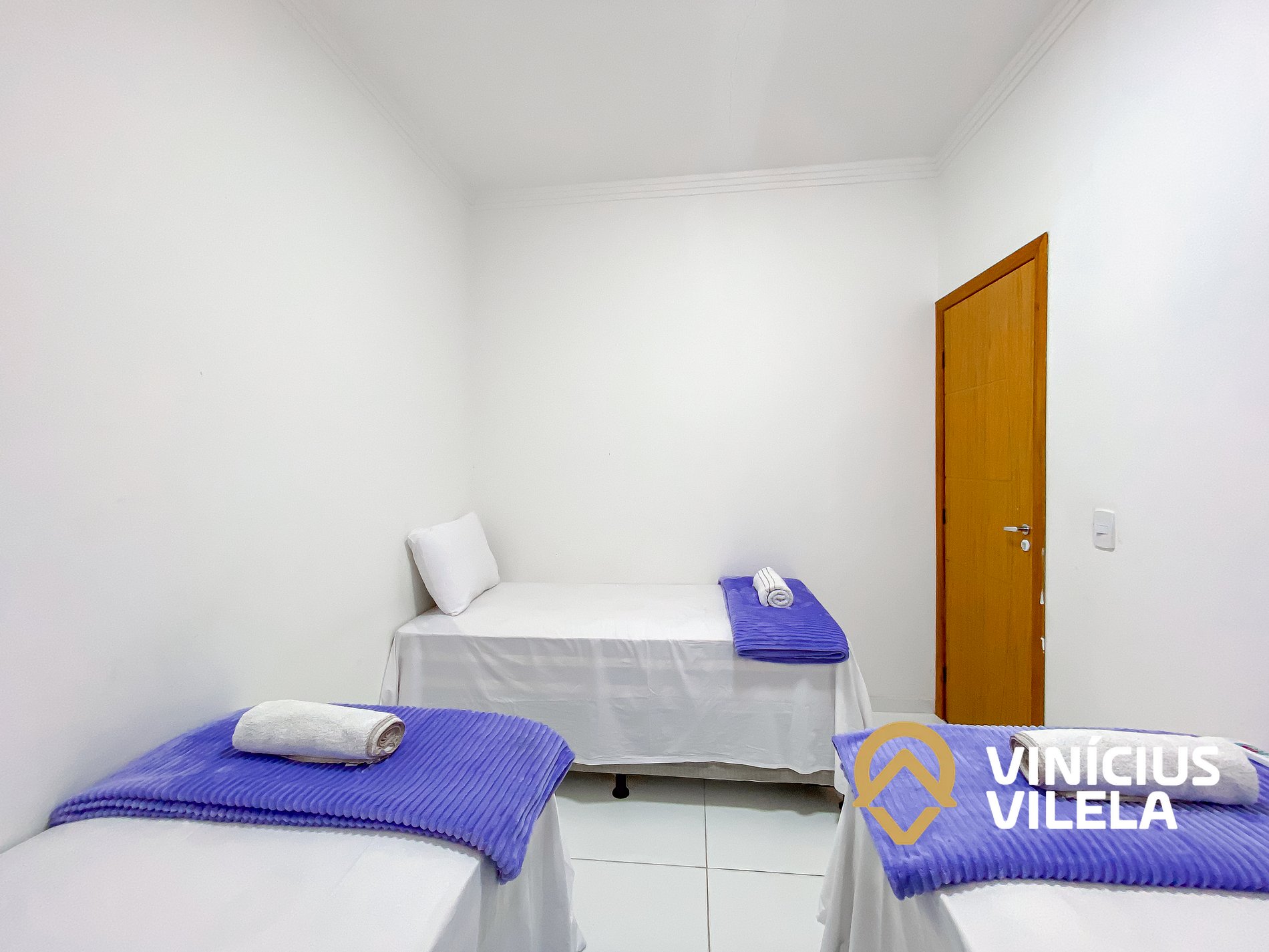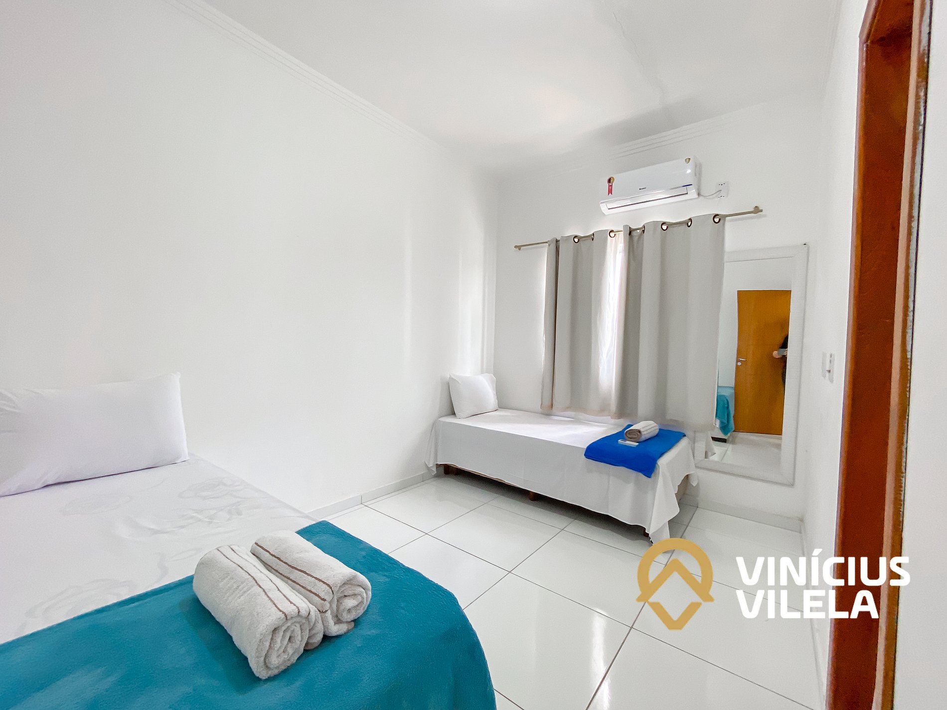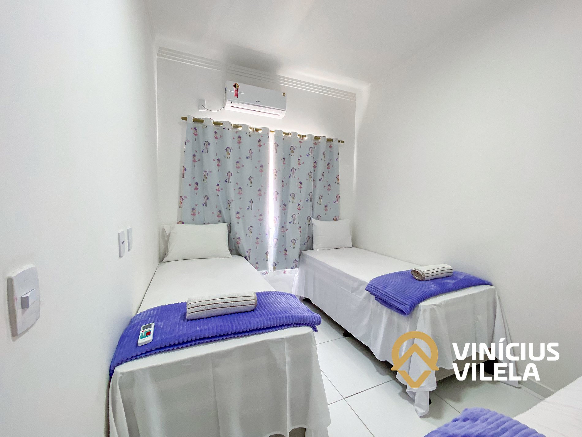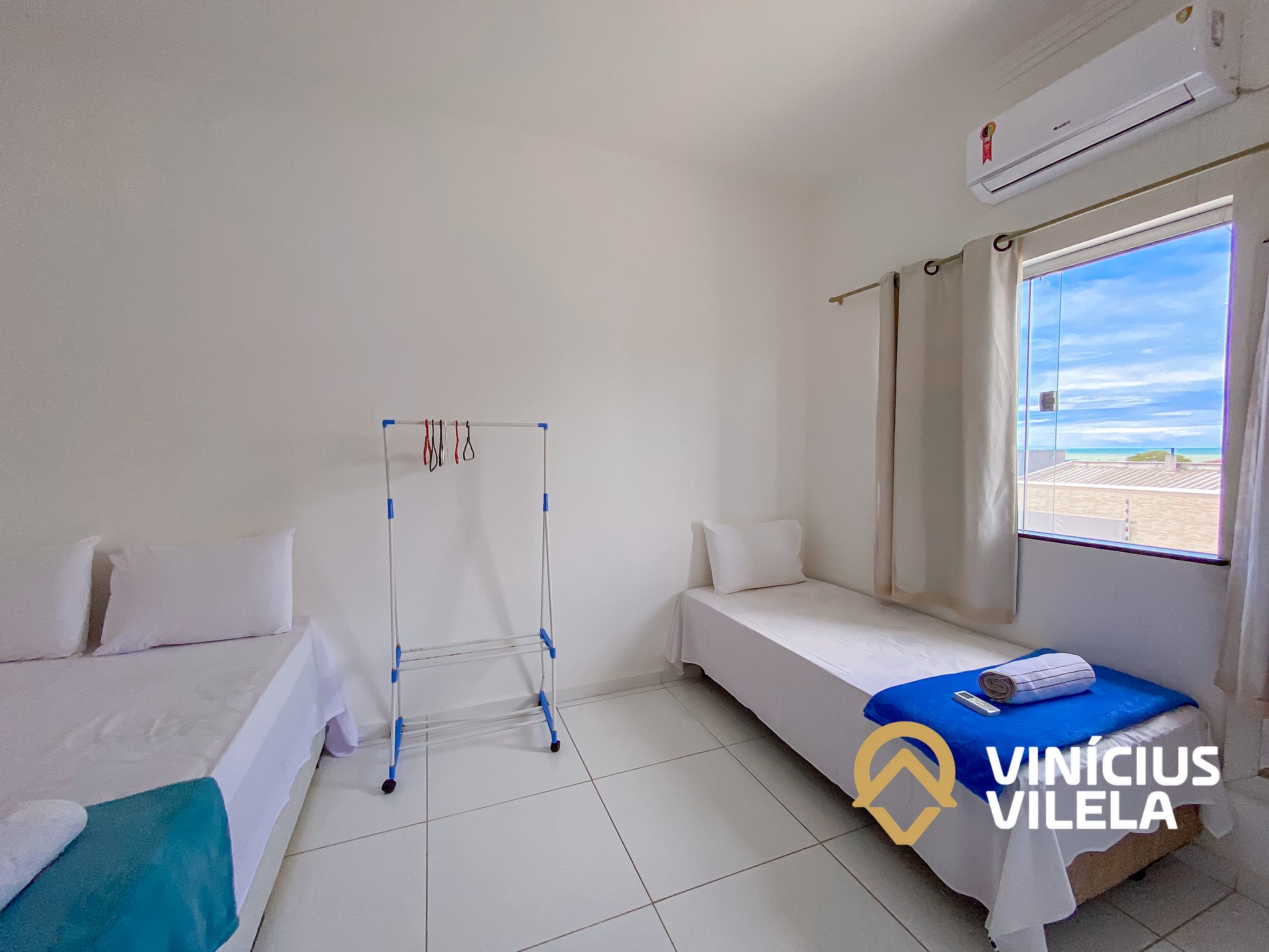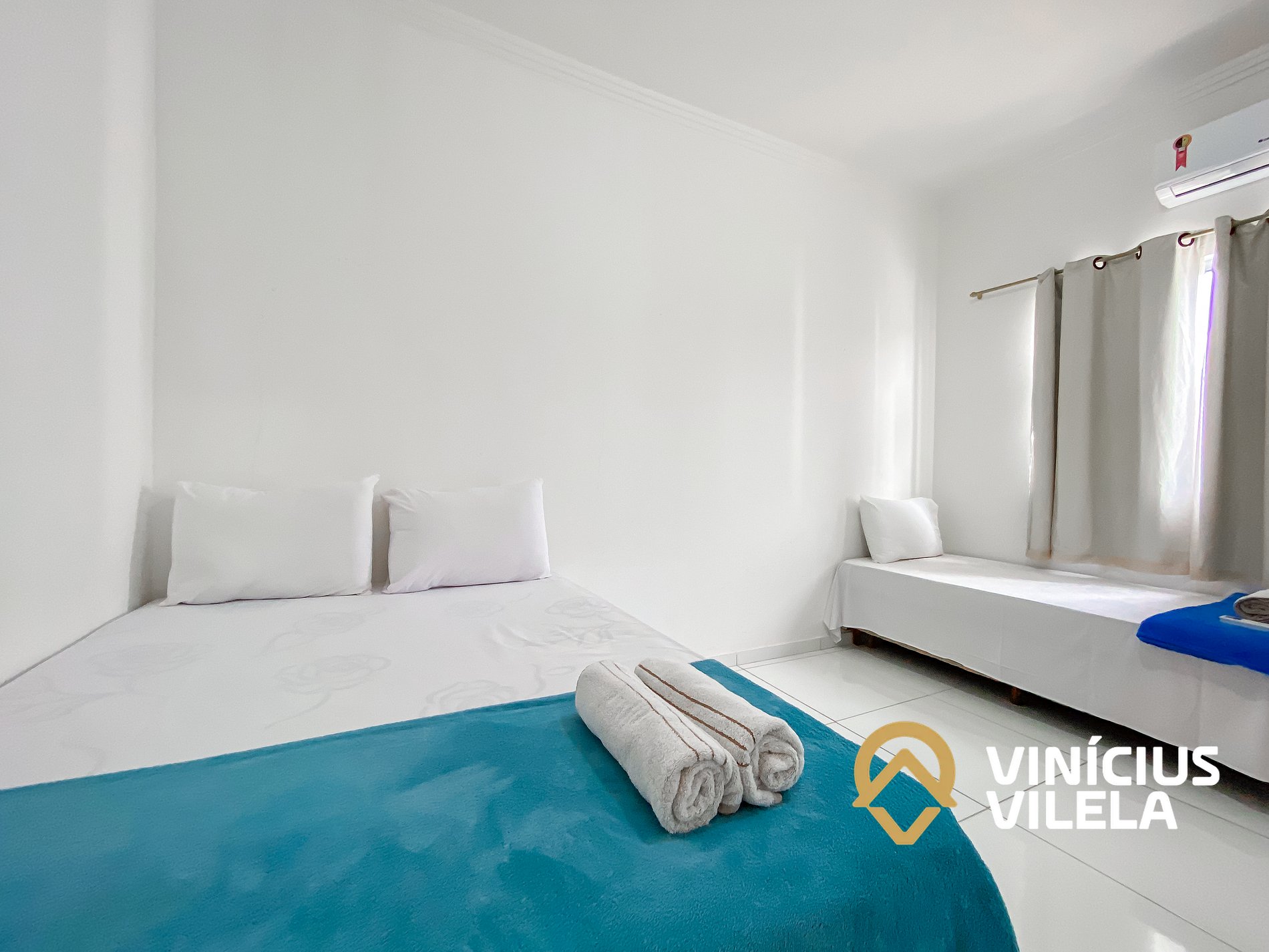 O quarto possui ar condicionado, 3 camas de solteiro, travesseiros ,enxoval de cama e banho(1 unidade para cada hospede conforme a contratação).