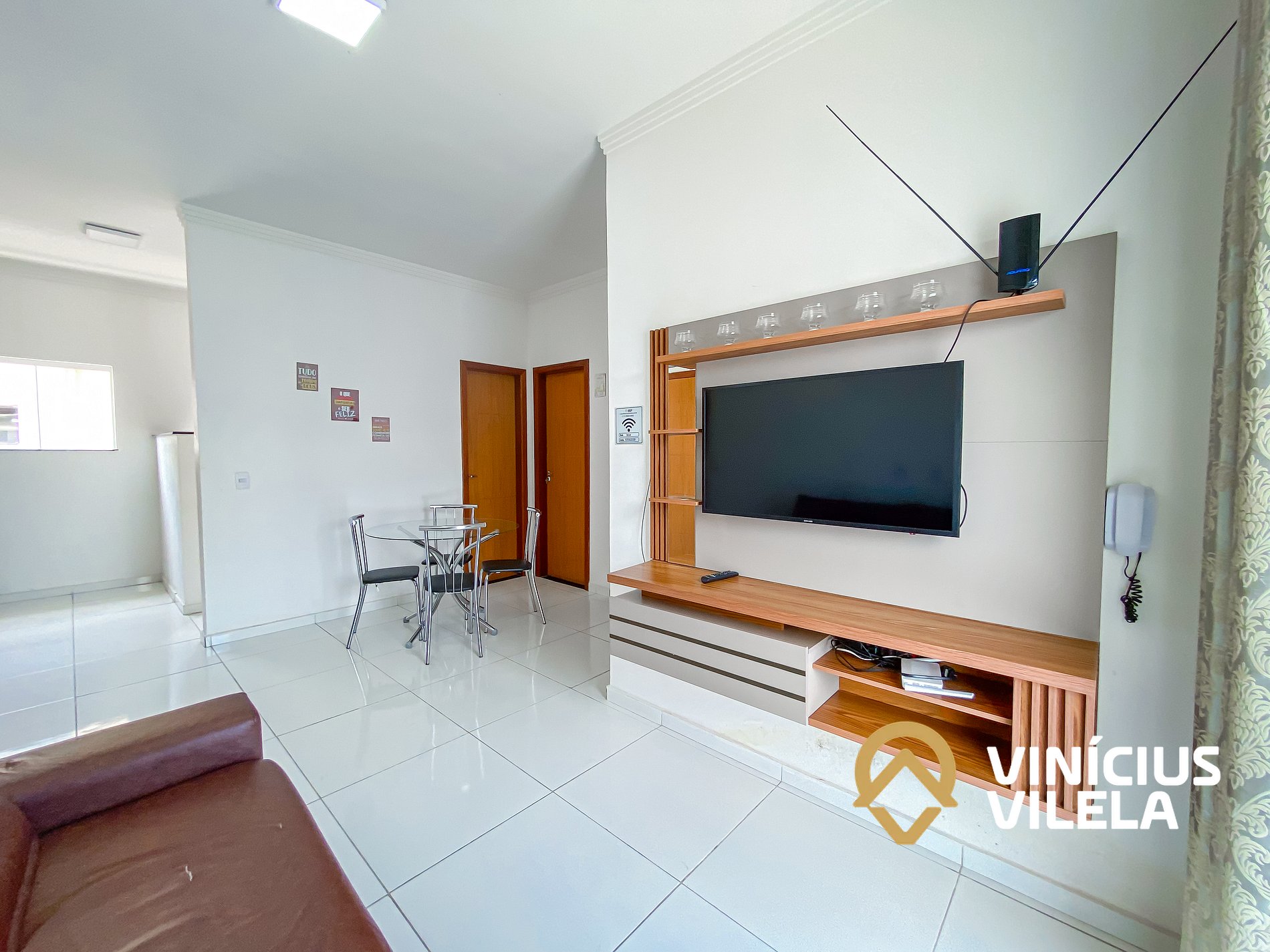 Logo na entrada possui uma sala conjugada com a copa com sofá cama, rack e TV tela plana. Mesa de vidro com 4 cadeiras.