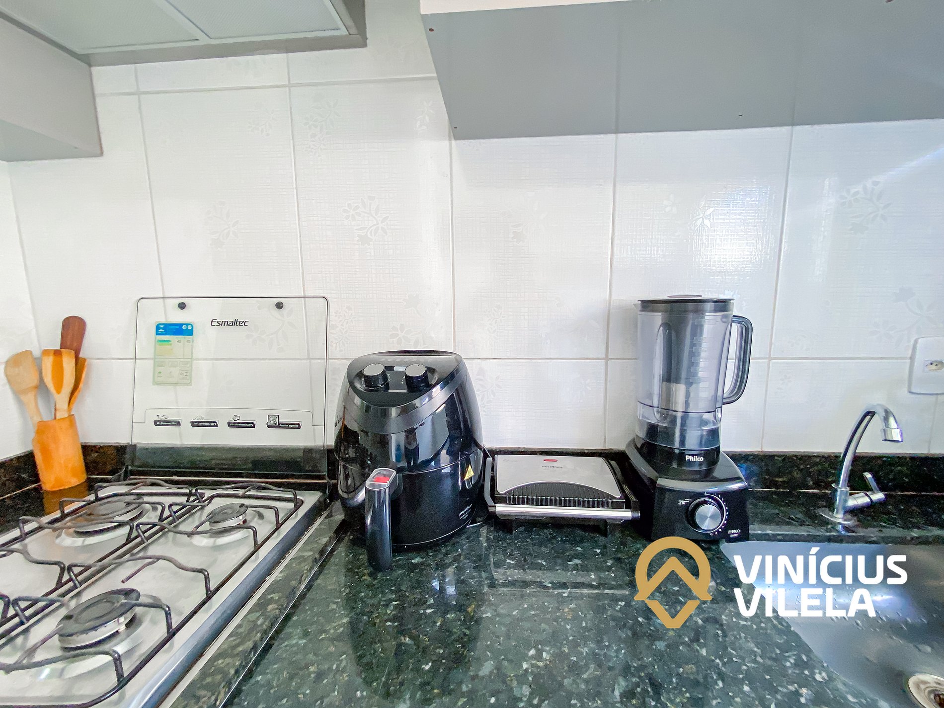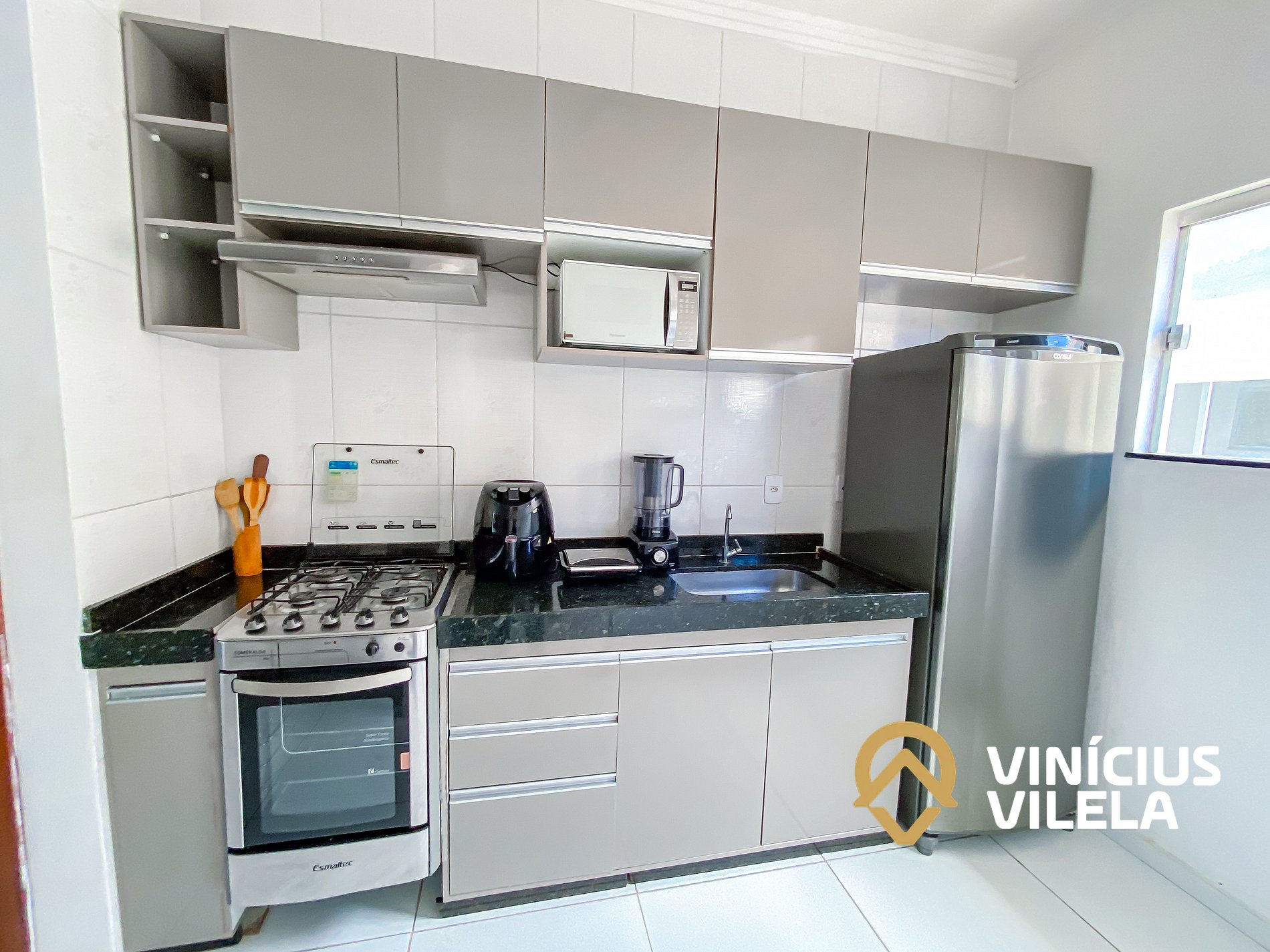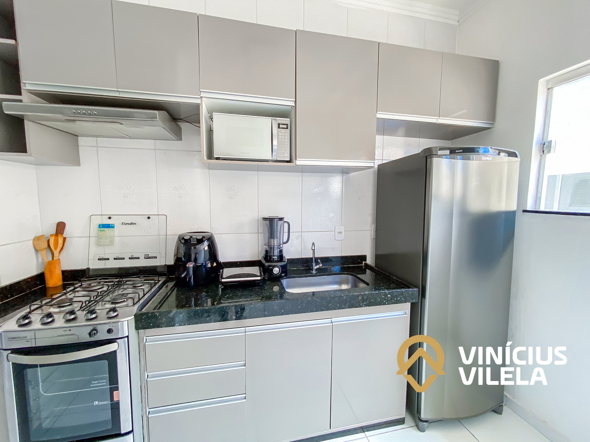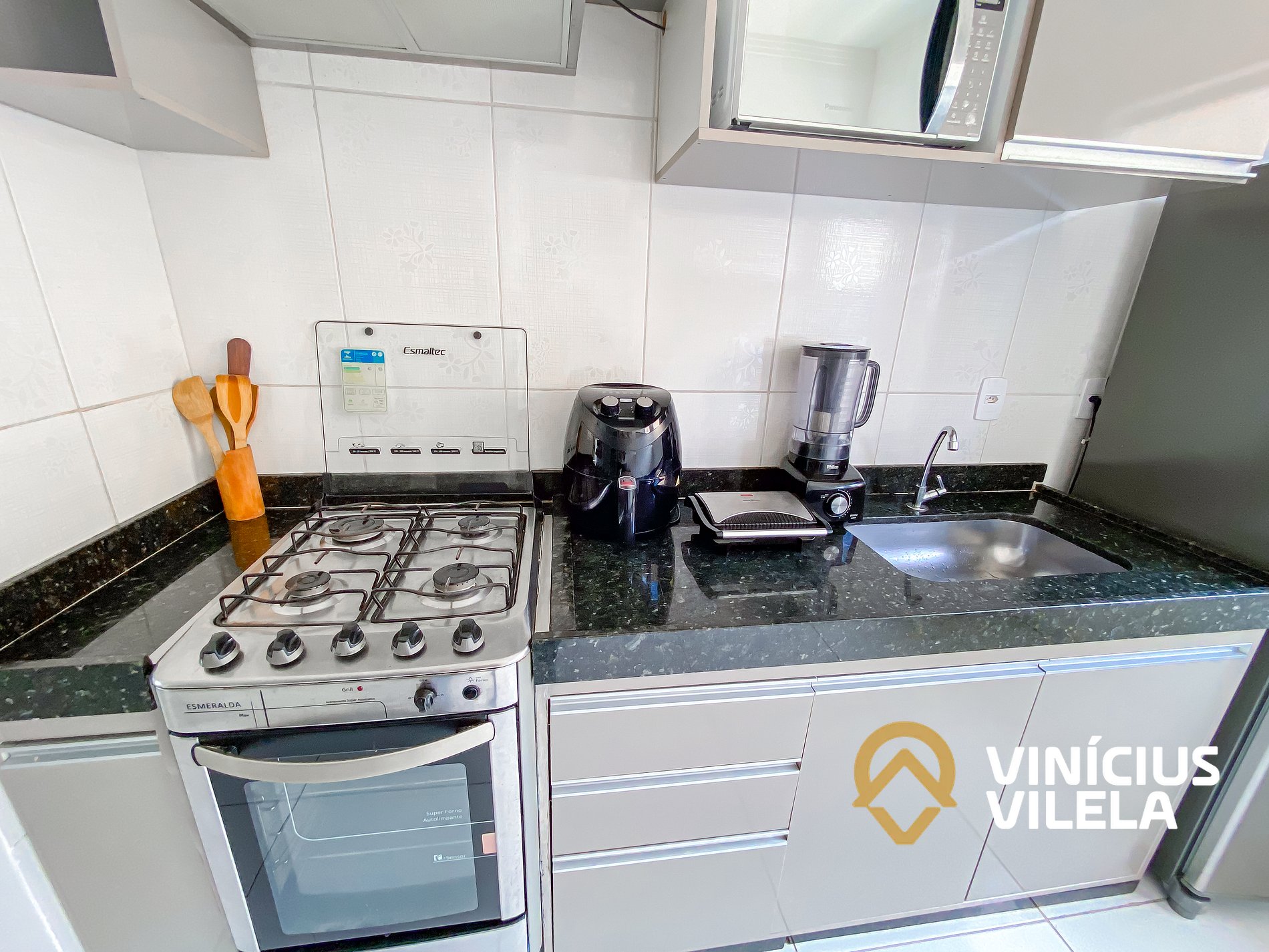 A cozinha é bem completa e oferece eletrodomésticos como liquidificador, micro-ondas, sanduicheira, airfryer, fogão, geladeira, utensílios, panelas, talheres, pratos, xícaras, garrafa térmica de café ,copos de vidro, e nas gavetas sempre você vai encontrar utensílios essenciais em uma cozinha.