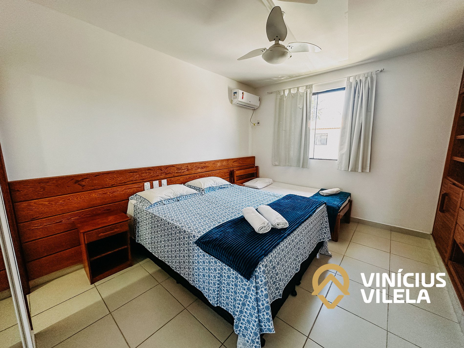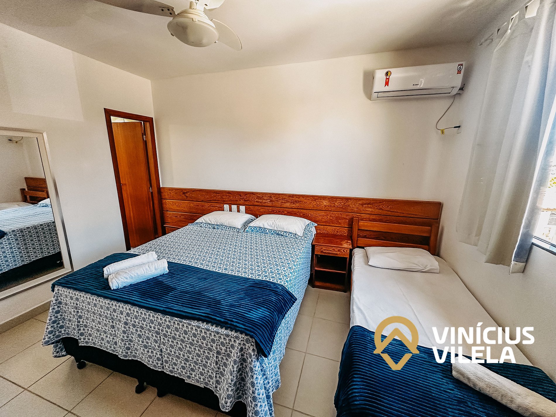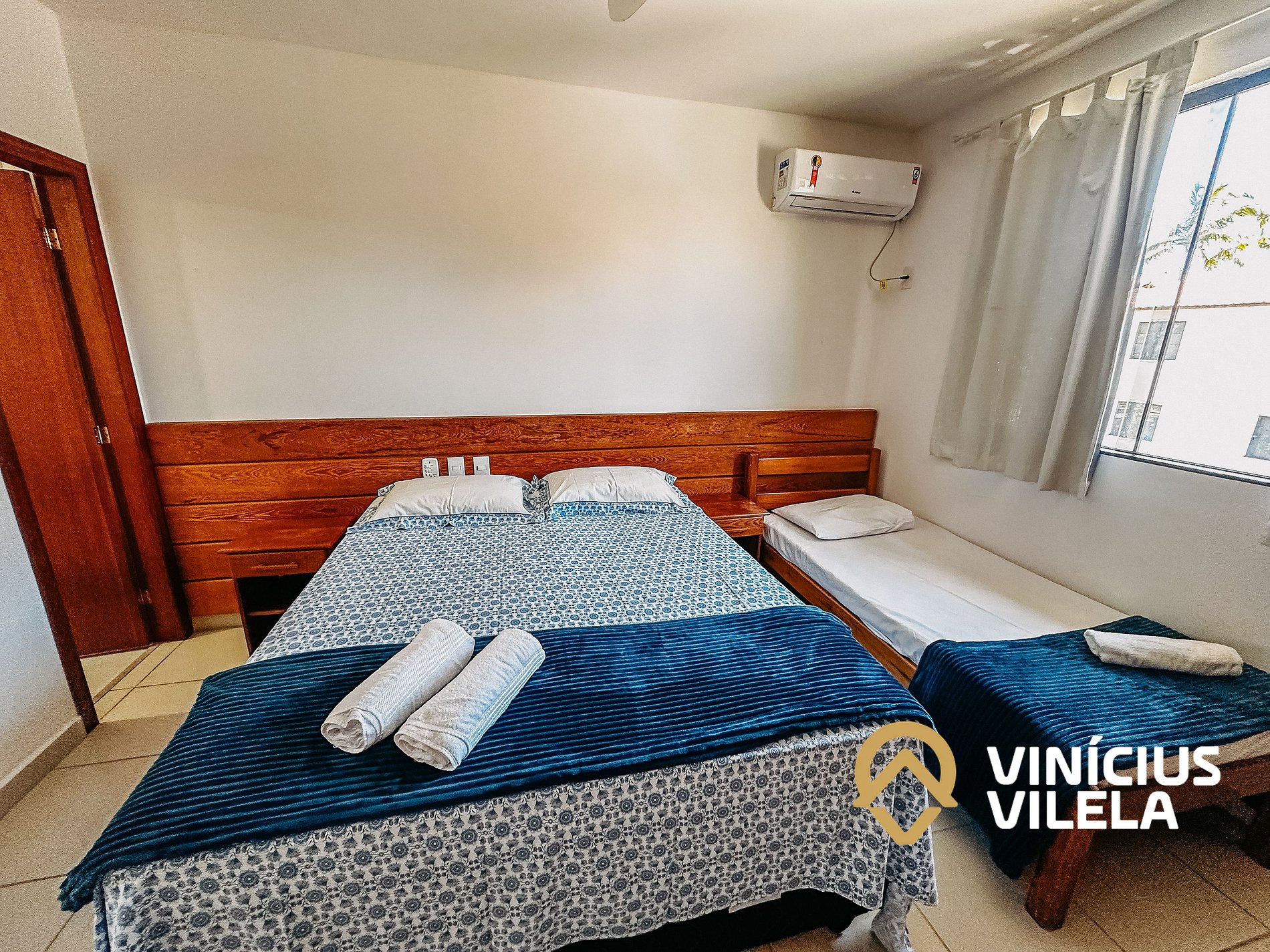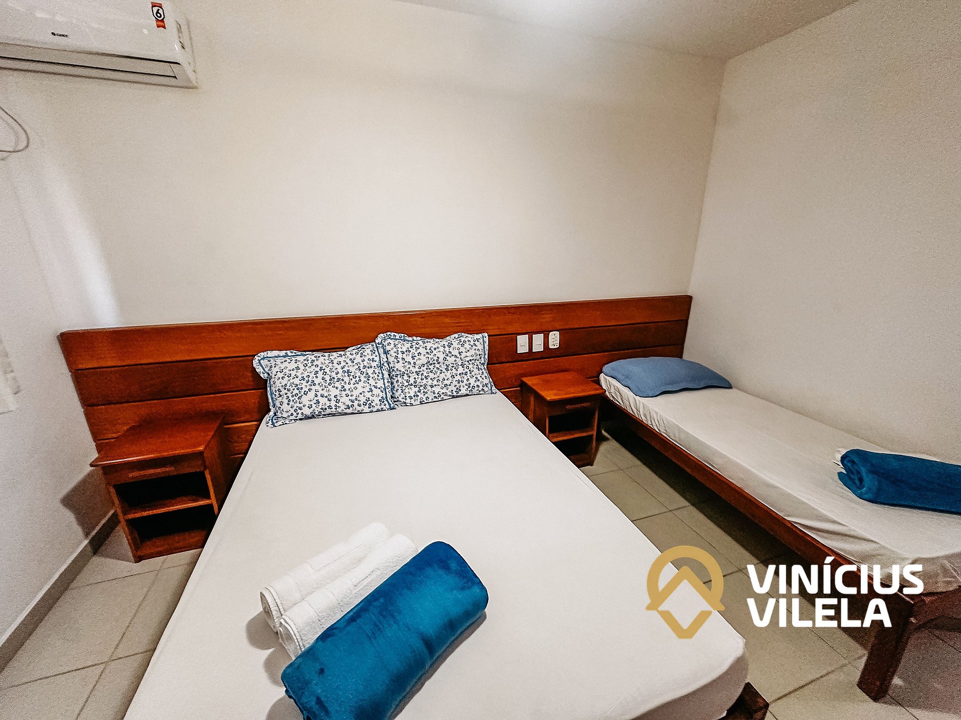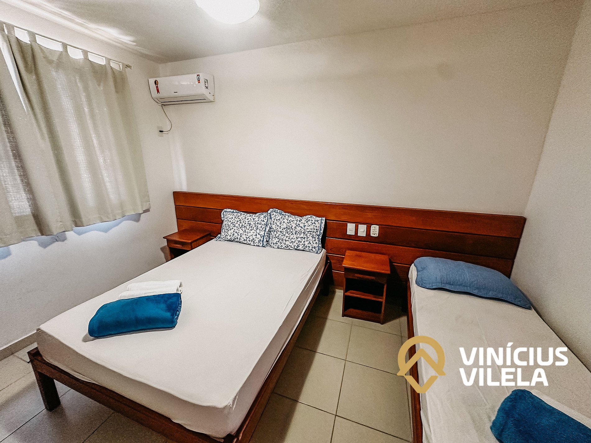 O quarto possui ar condicionado, 01 cama de casal e 01 cama de solteiro, travesseiros ,enxoval de cama e banho.