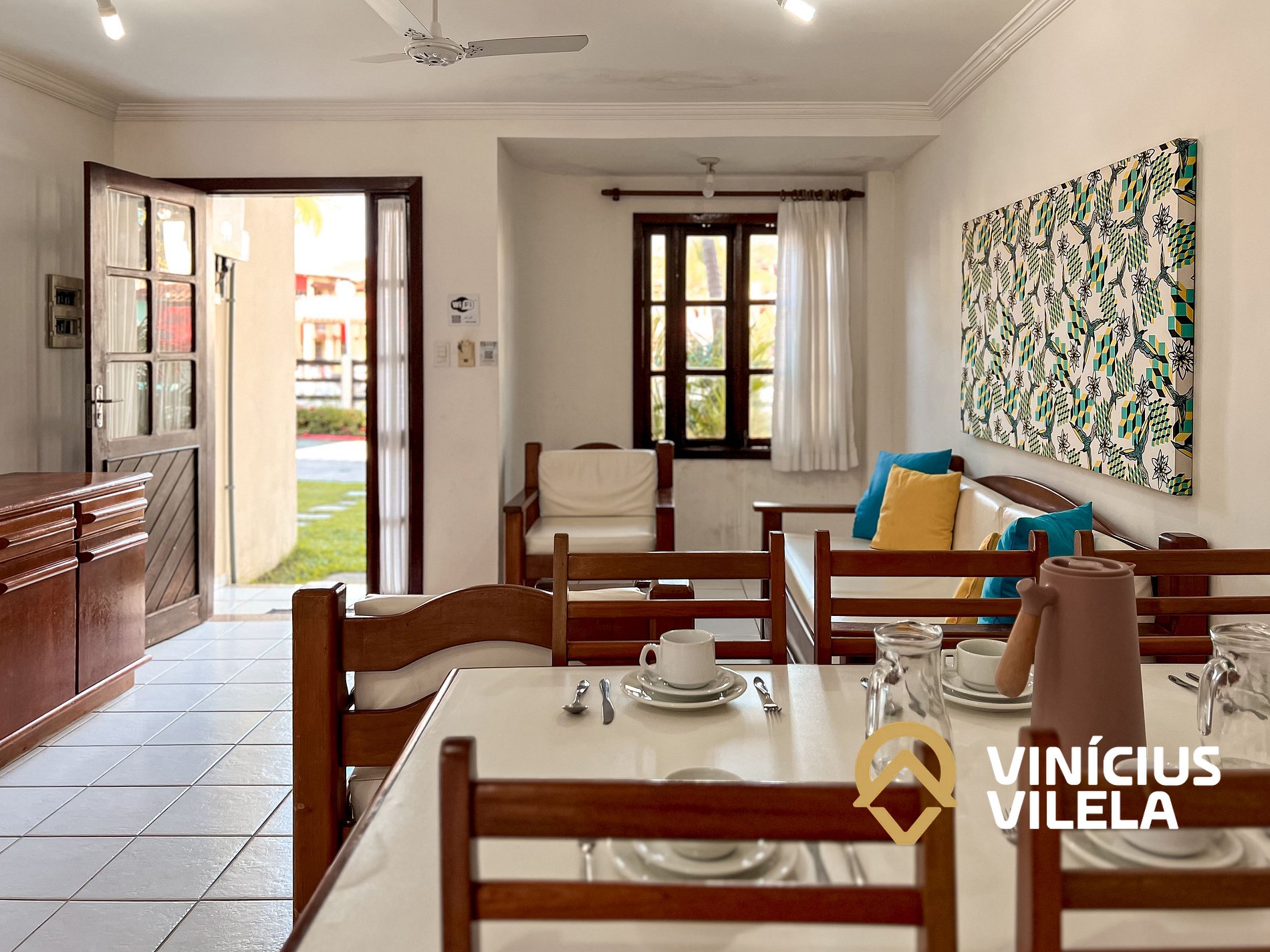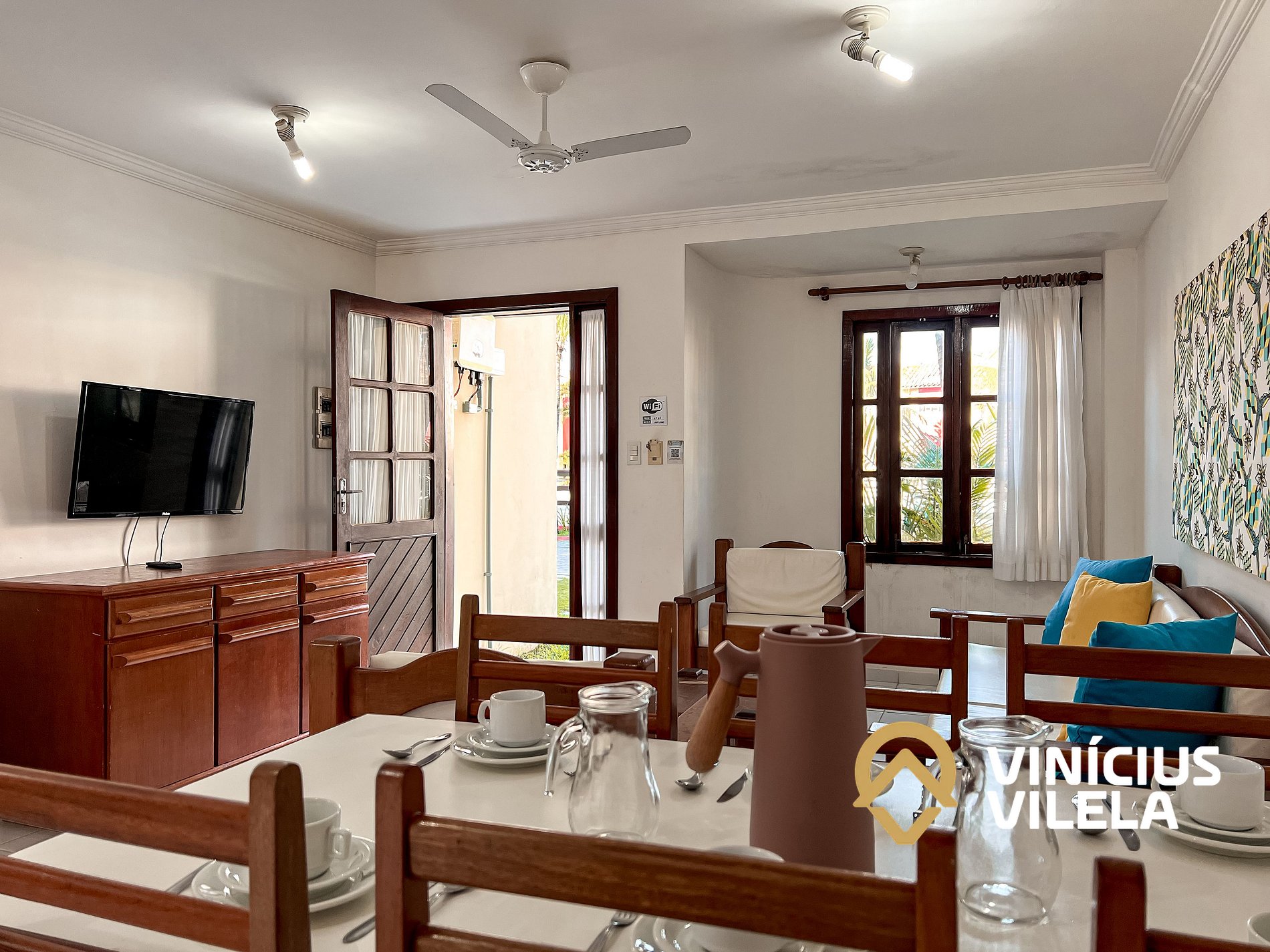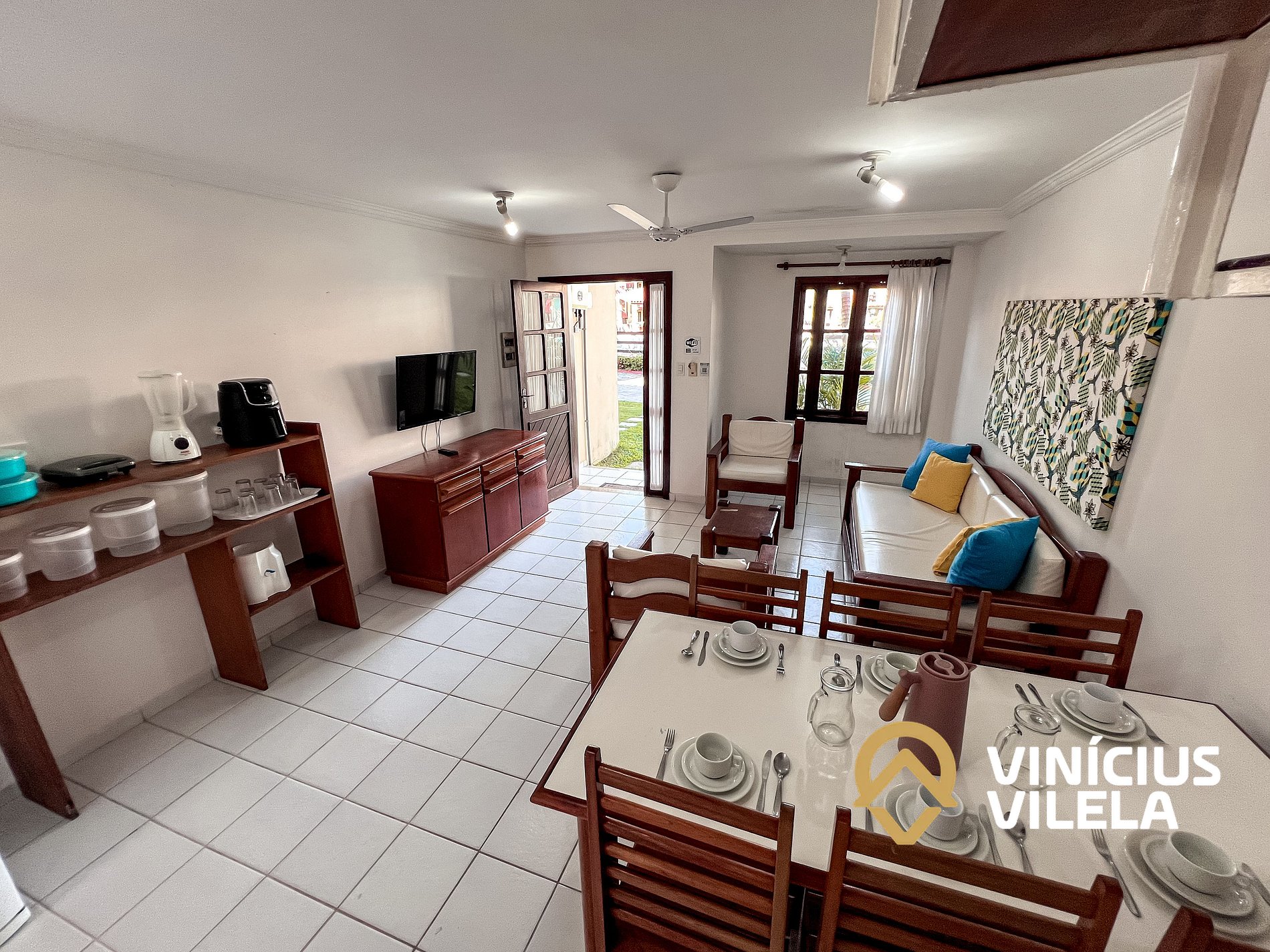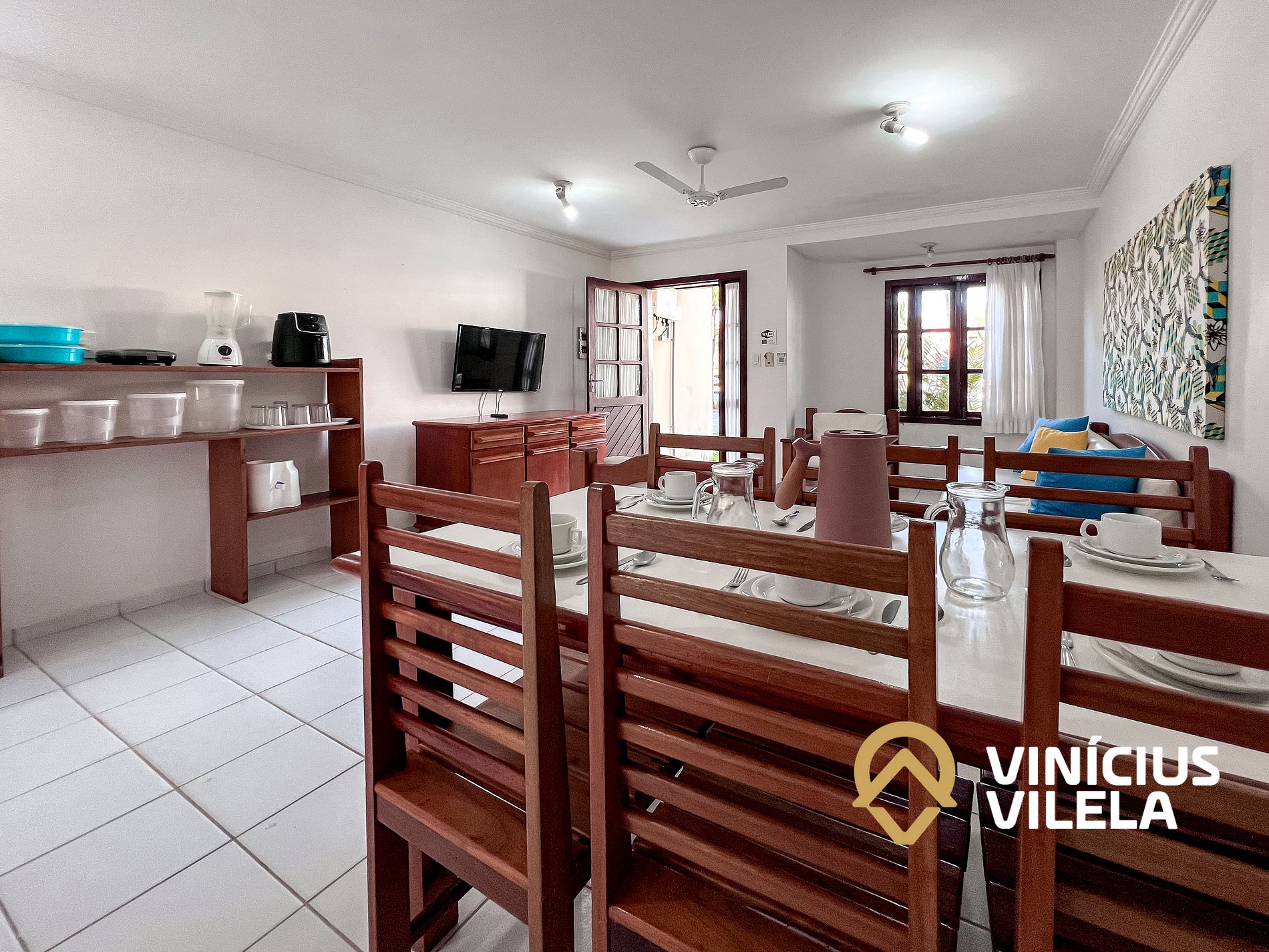 Logo na entrada possui uma ampla sala conjugada com a copa, no qual são compostas com sofá cama, 2 poltronas e almofadas, ventilador de teto, rack e TV tela plana. Mesa de madeira com 6 cadeiras.