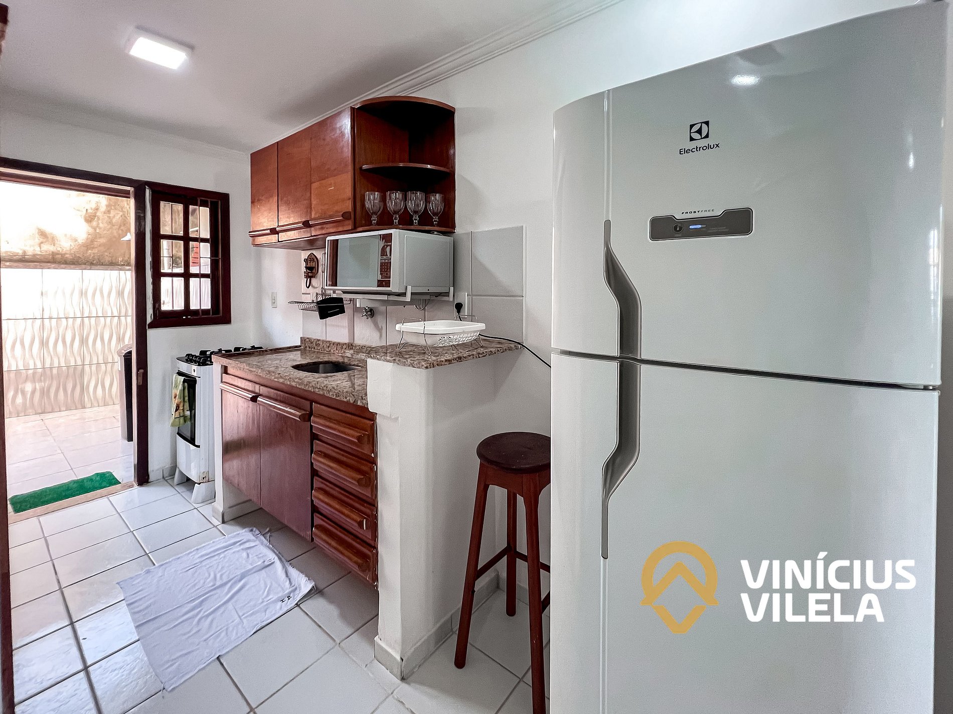 A cozinha é bem completa e oferece eletrodomésticos como liquidificador, micro-ondas,