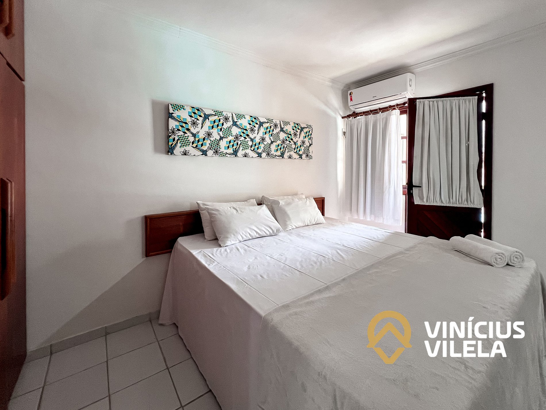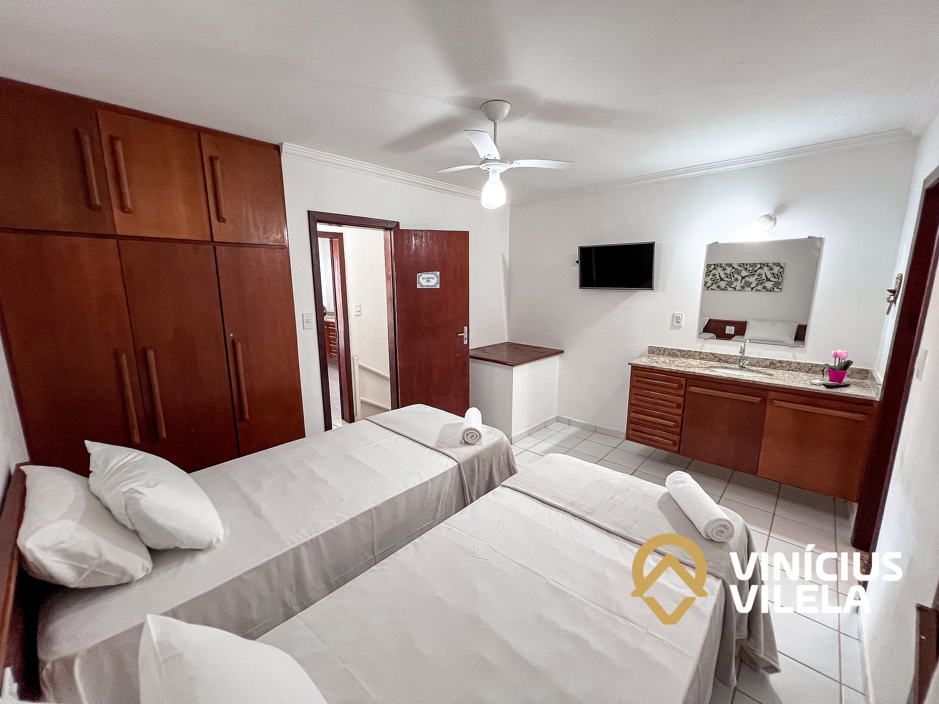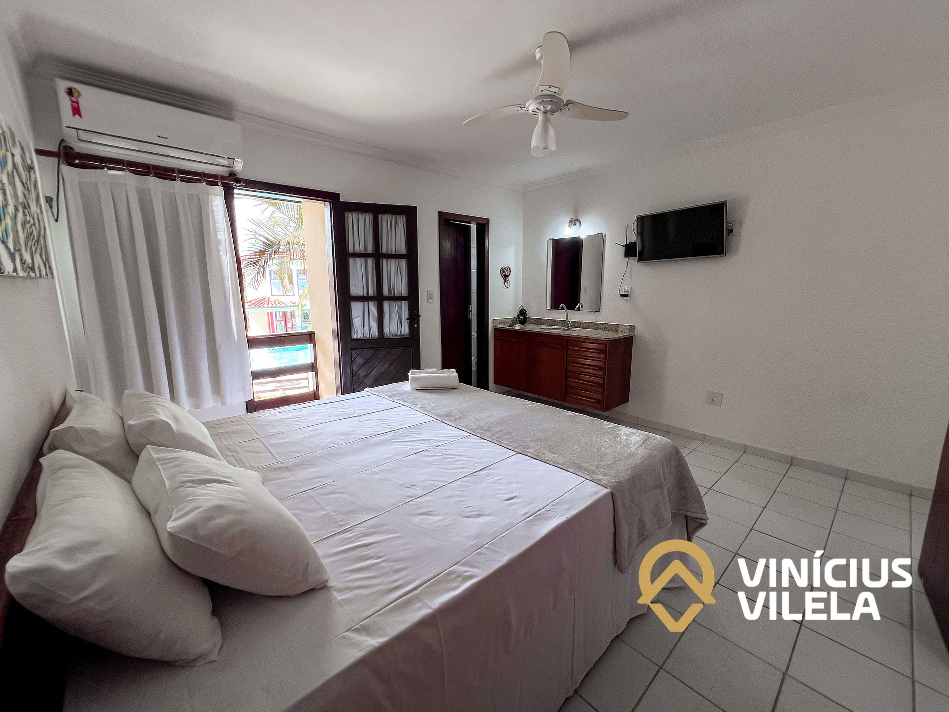 As 2 suítes no pavimento superior possuem ar condicionado, ventilador de teto,