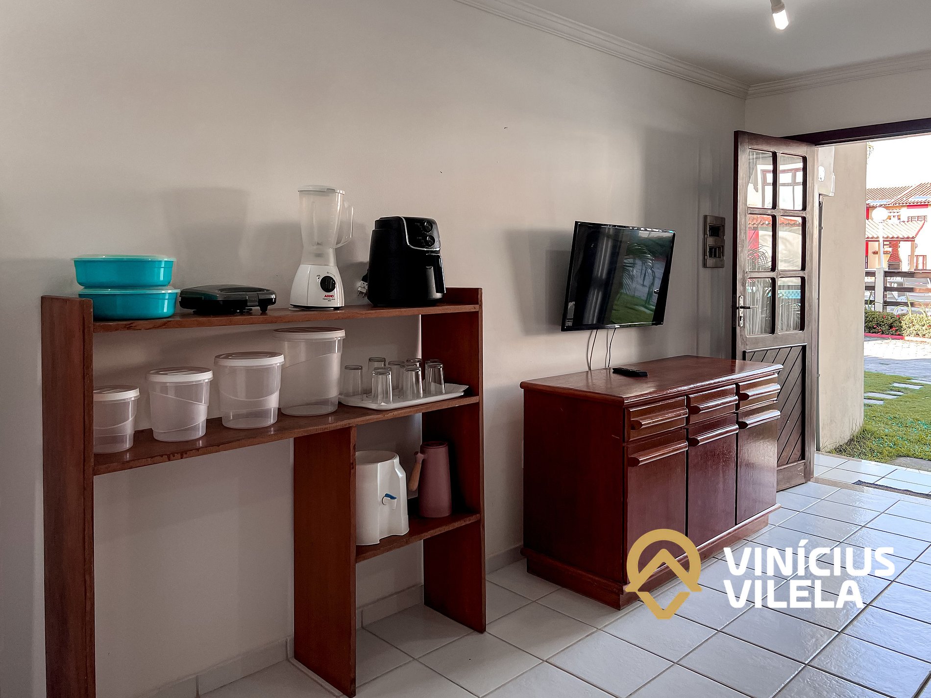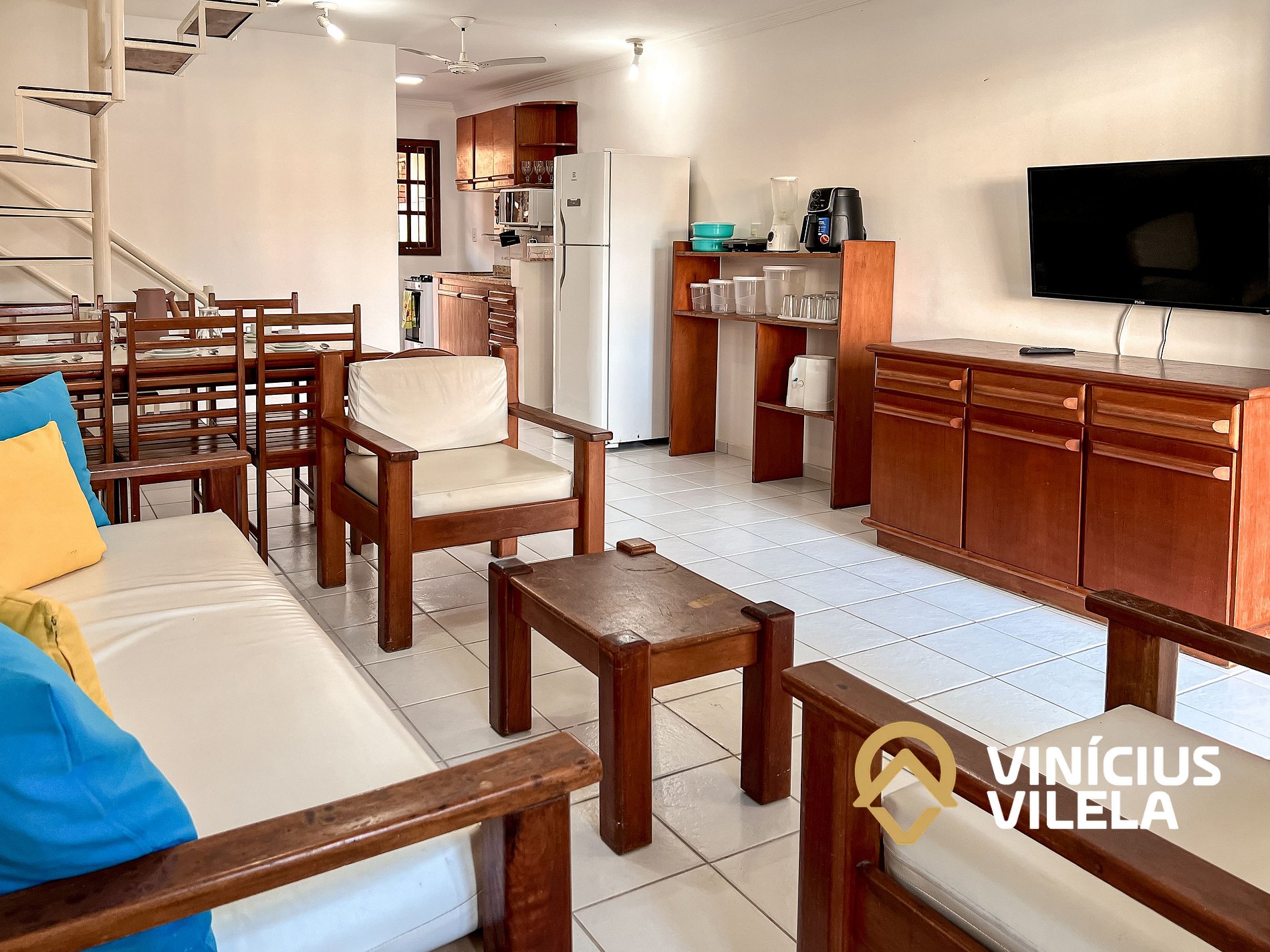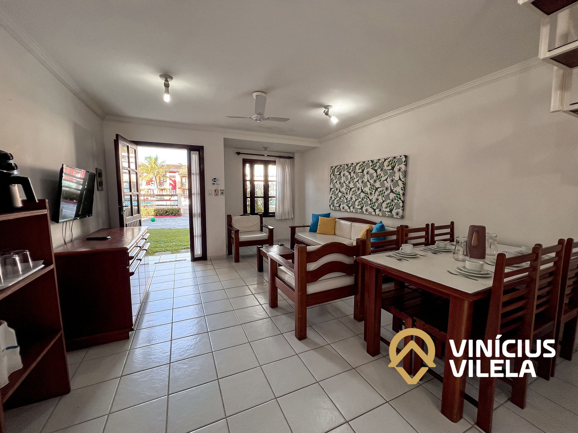 Logo na entrada possui uma ampla sala conjugada com a copa, no qual são compostas com sofá cama, 2 poltronas e almofadas, ventilador de teto, rack e TV tela plana. Mesa de madeira com 6 cadeiras.