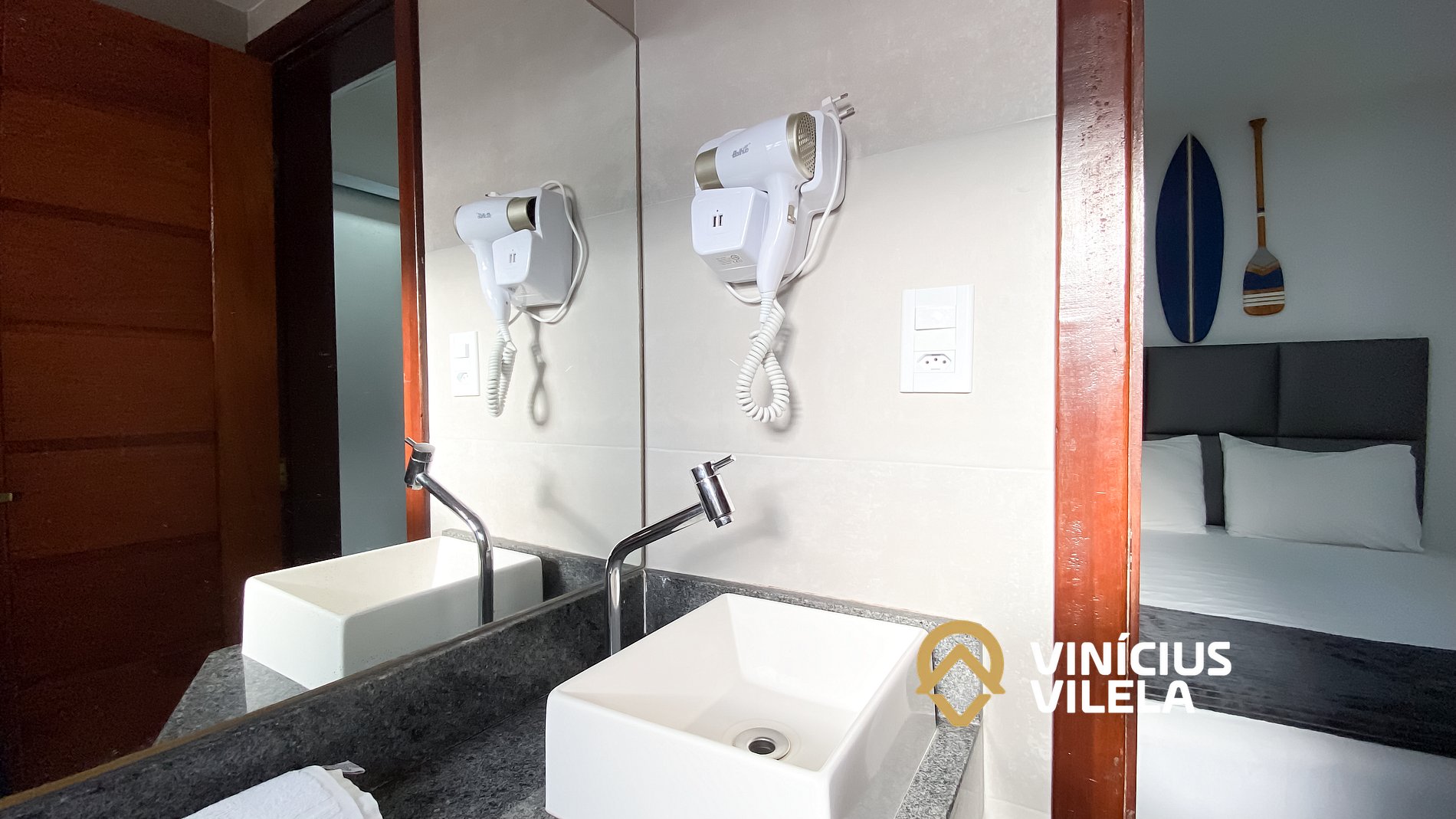 As 2 suítes no pavimento superior possuem ar condicionado, ventilador de teto,