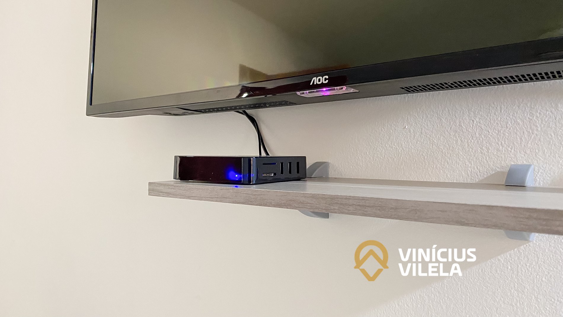 Logo na entrada possui uma ampla sala conjugada com a copa, no qual são compostas com sofá cama e almofadas, ventilador de teto, rack e TV tela plana. Mesa de madeira com bancos almofadados.