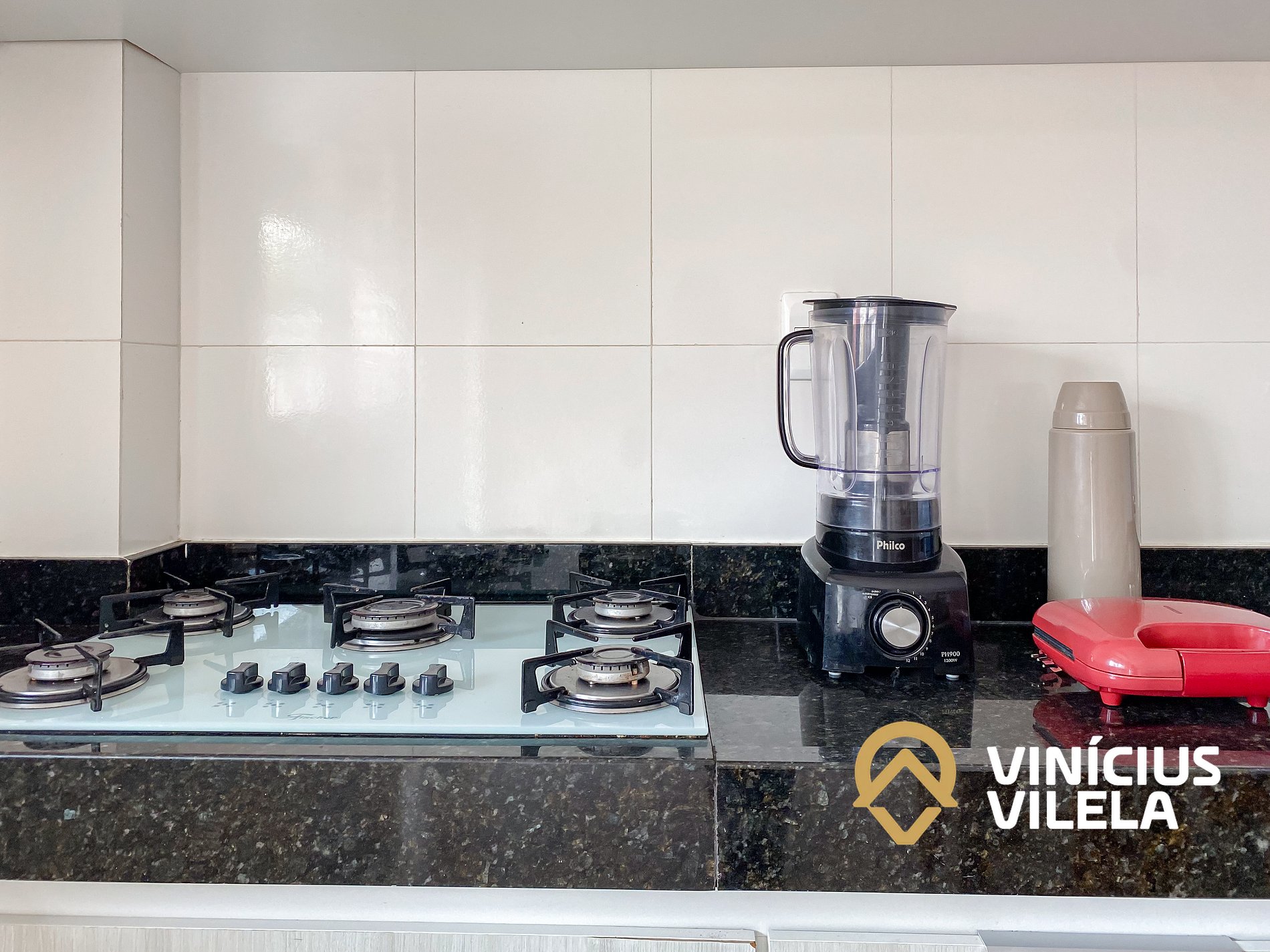 A cozinha é bem completa e oferece eletrodomésticos como liquidificador, micro-ondas, forno eletríco, sanduicheira fogão, geladeira duplex, utensílios, panelas, talheres, pratos, xícaras, garrafa térmica de café ,copos de vidro, e nas gavetas sempre você vai encontrar pano de prato e outros utensílios essenciais em uma cozinha.