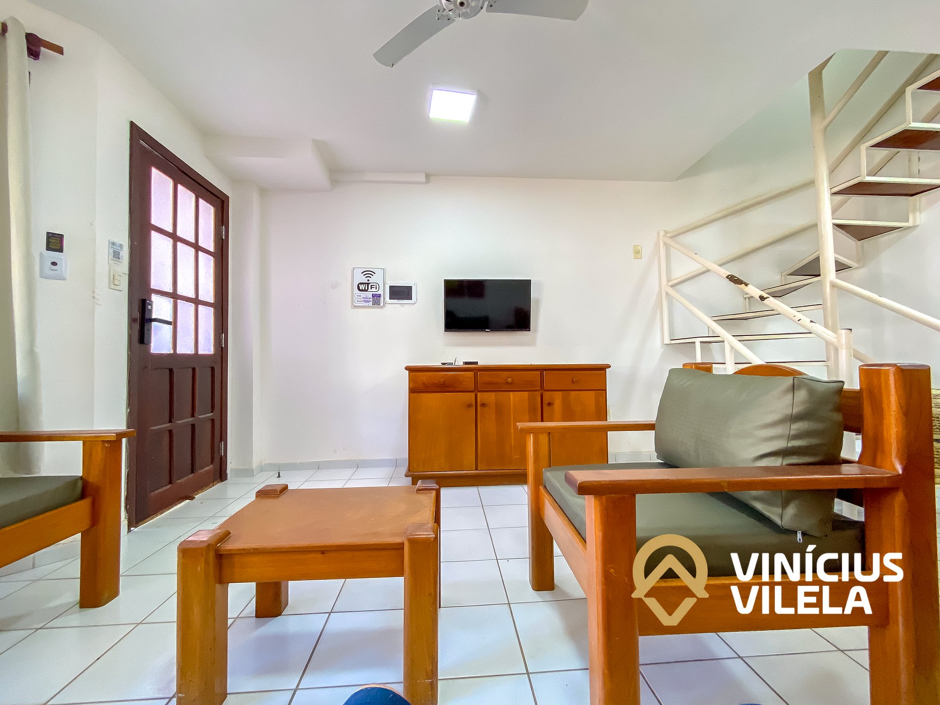 Logo na entrada possui uma ampla sala conjugada com a copa, no qual são compostas com sofá cama, 2 poltronas e almofadas, ventilador de teto, rack e TV tela plana. Mesa de madeira com 6 cadeiras.