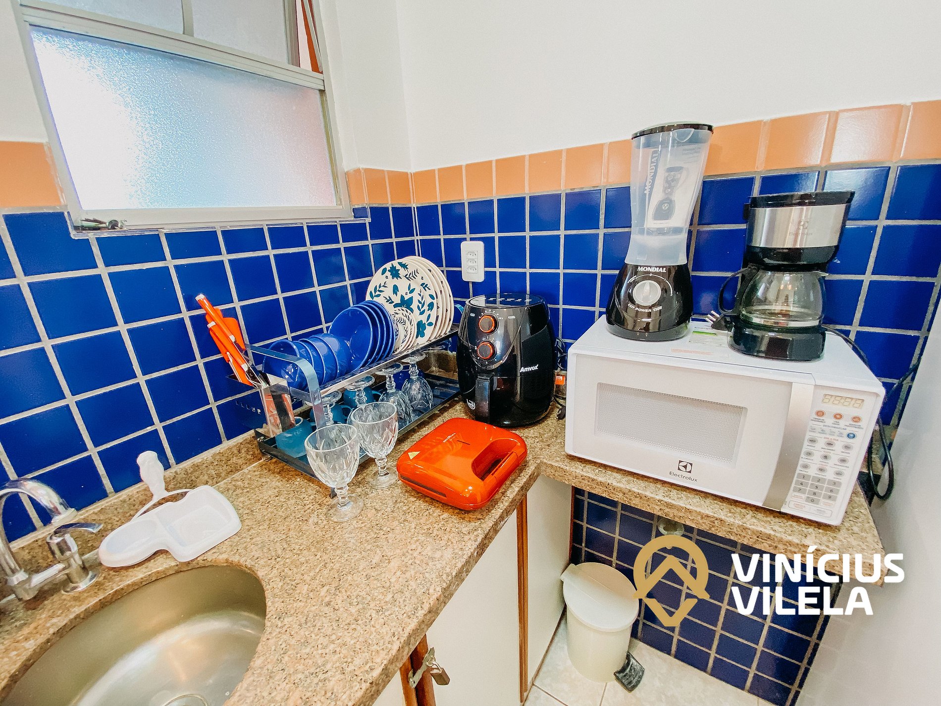01 quarto com ar condicionado (1 de casal e 1 de solteiro), sala de estar com sofá cama, cozinha compacta com microondas, geladeira, air fryer sanduicheira, liquidificador, cafeteira, 1 banheiro. Toalhas e roupas de cama são fornecidas (com trocas a cada 2 dias caso seja solicitado pelo hospede).