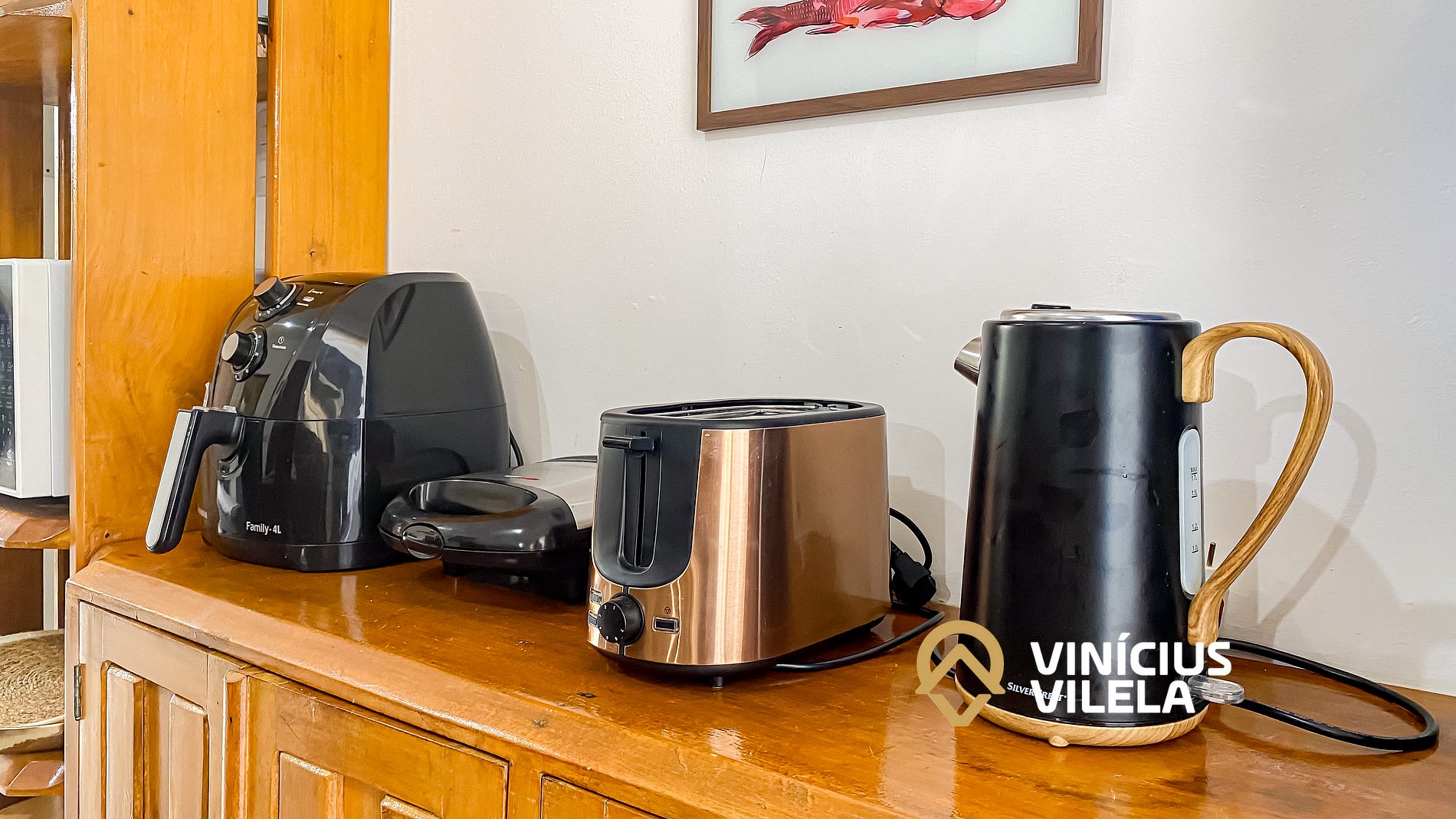 O apartamento conta com 3 quartos, sendo 1 suíte todos com ar condicionado Split, roupas de cama e banho, na sala temos sofá e TV , internet Wi-fi 300MBPS exclusiva do apartamento, Sala de jantar com mesa 6 cadeiras, cozinha completa com armários , fogão, airfryer e utensílios.