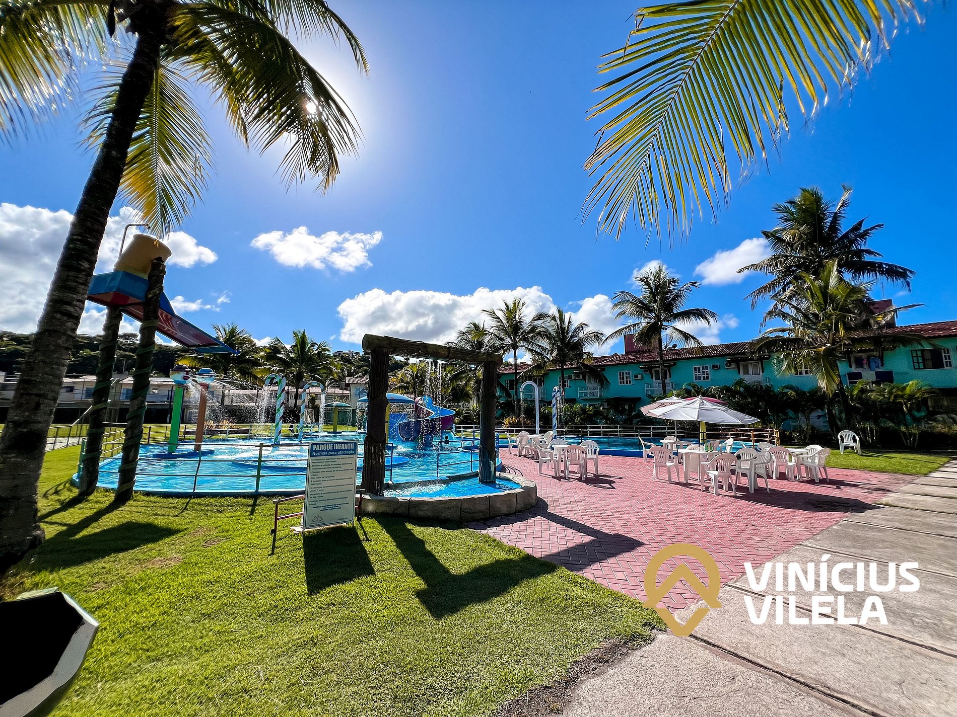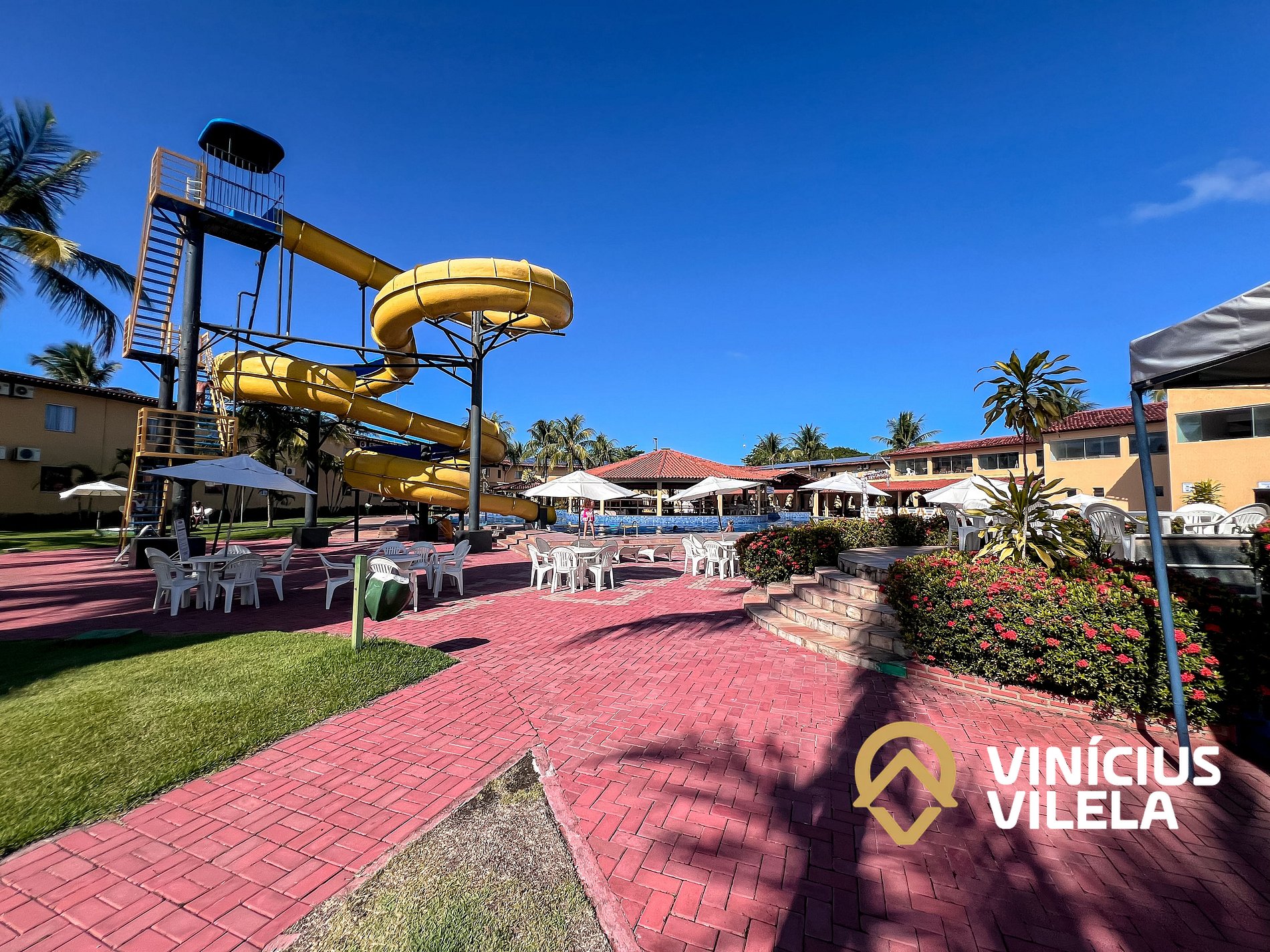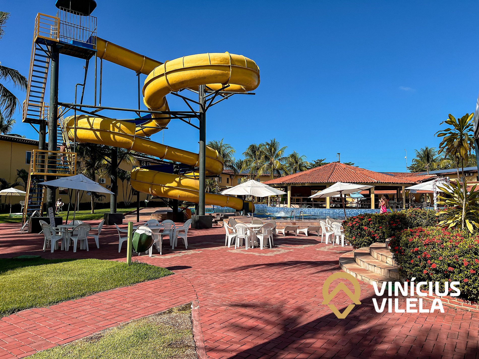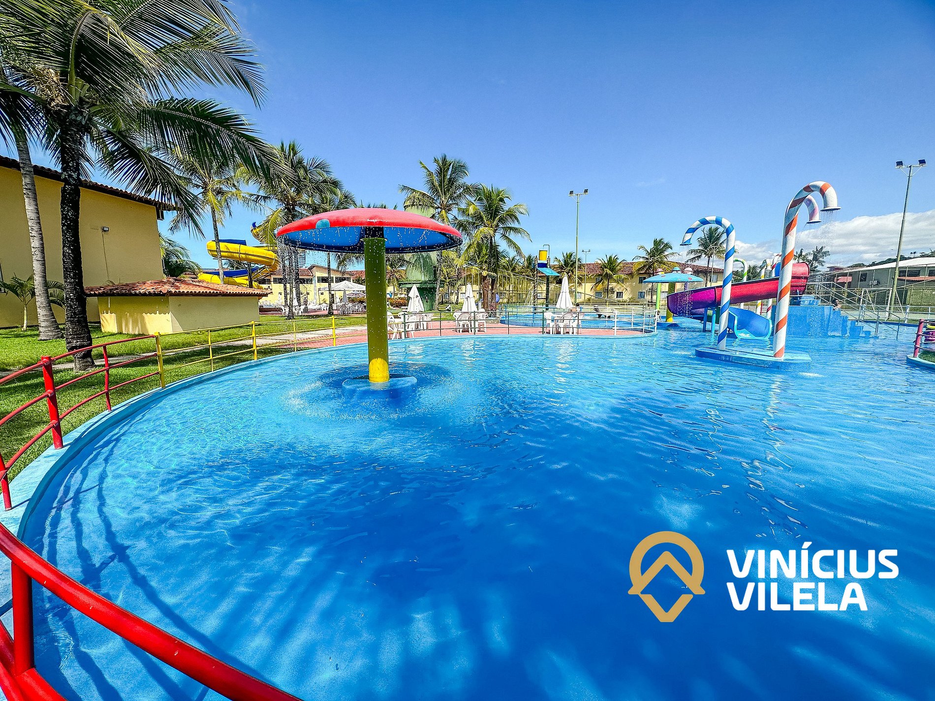 Parque aquático com toboáguas e vários brinquedos nas piscinas, ideal para quem tem crianças.