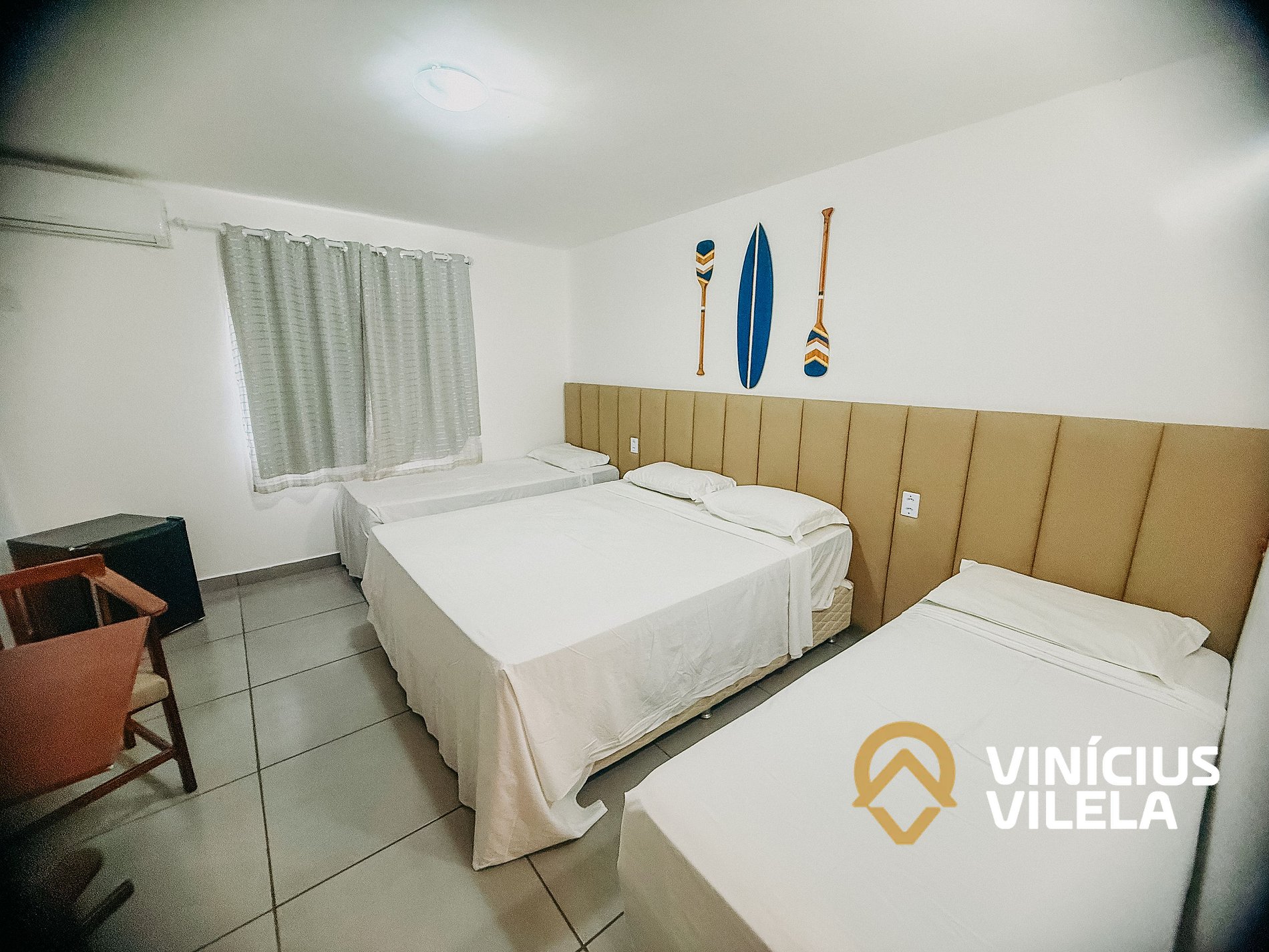 Suíte particular com uma cama de casal e 2 de solteiro, mesa para trabalho, frigobar, ar condicionado, TV tela plana e internet WI-FI