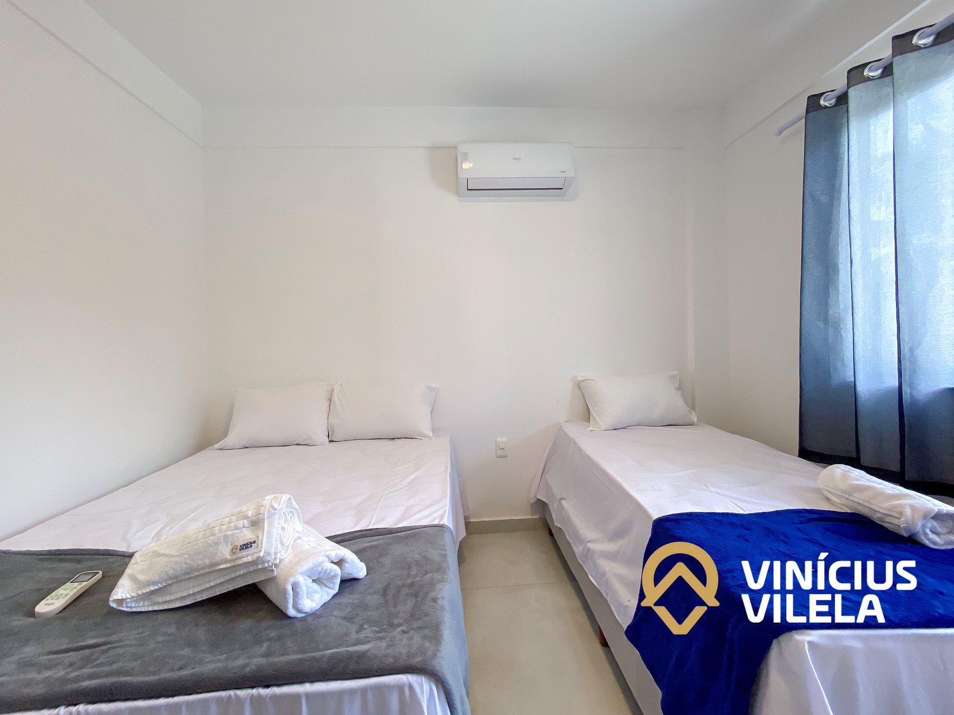 O quarto possui ar condicionado, 03 camas de solteiro , travesseiros ,enxoval de cama e banho (1 unidade para cada hospede conforme a contratação).