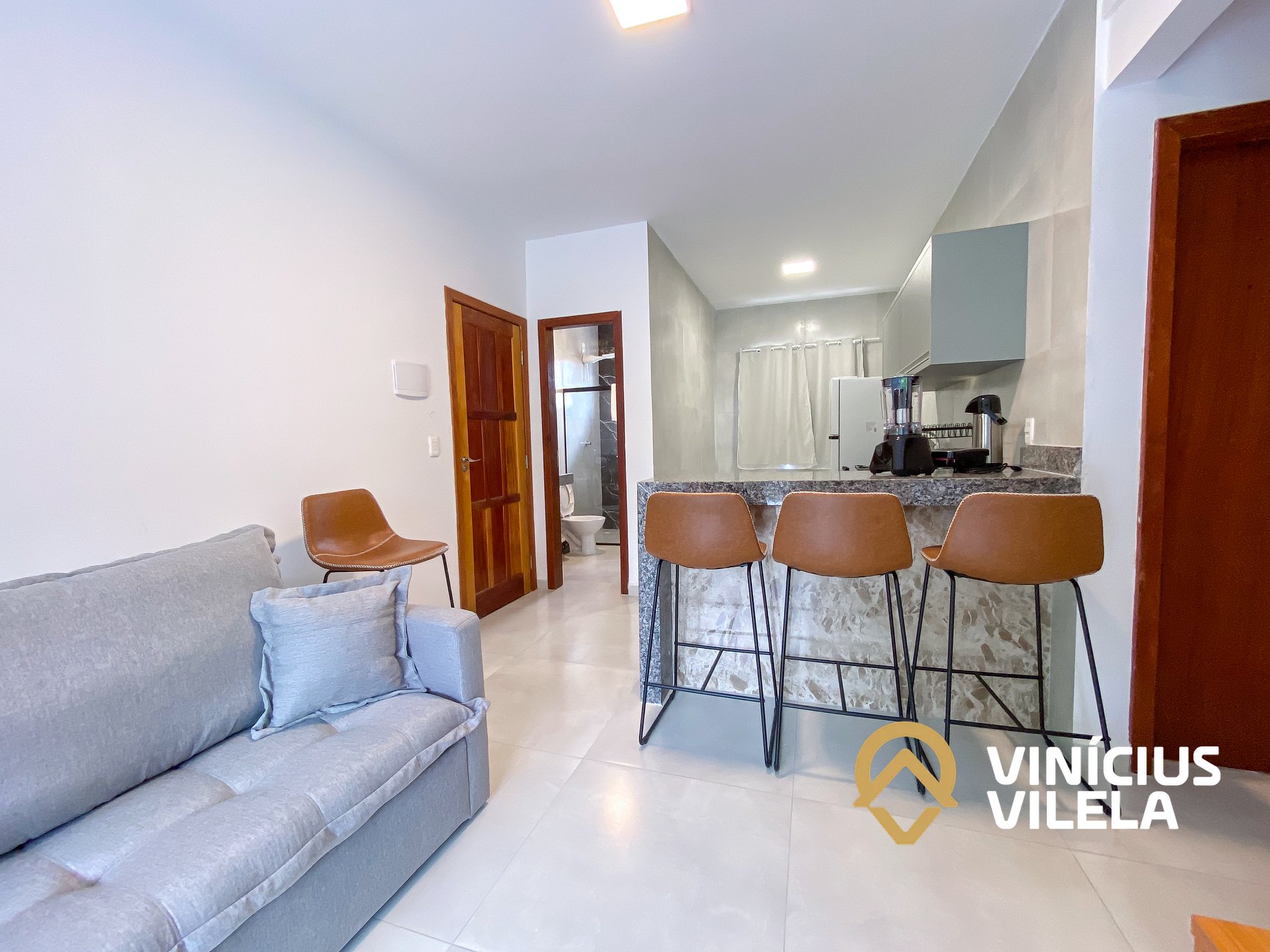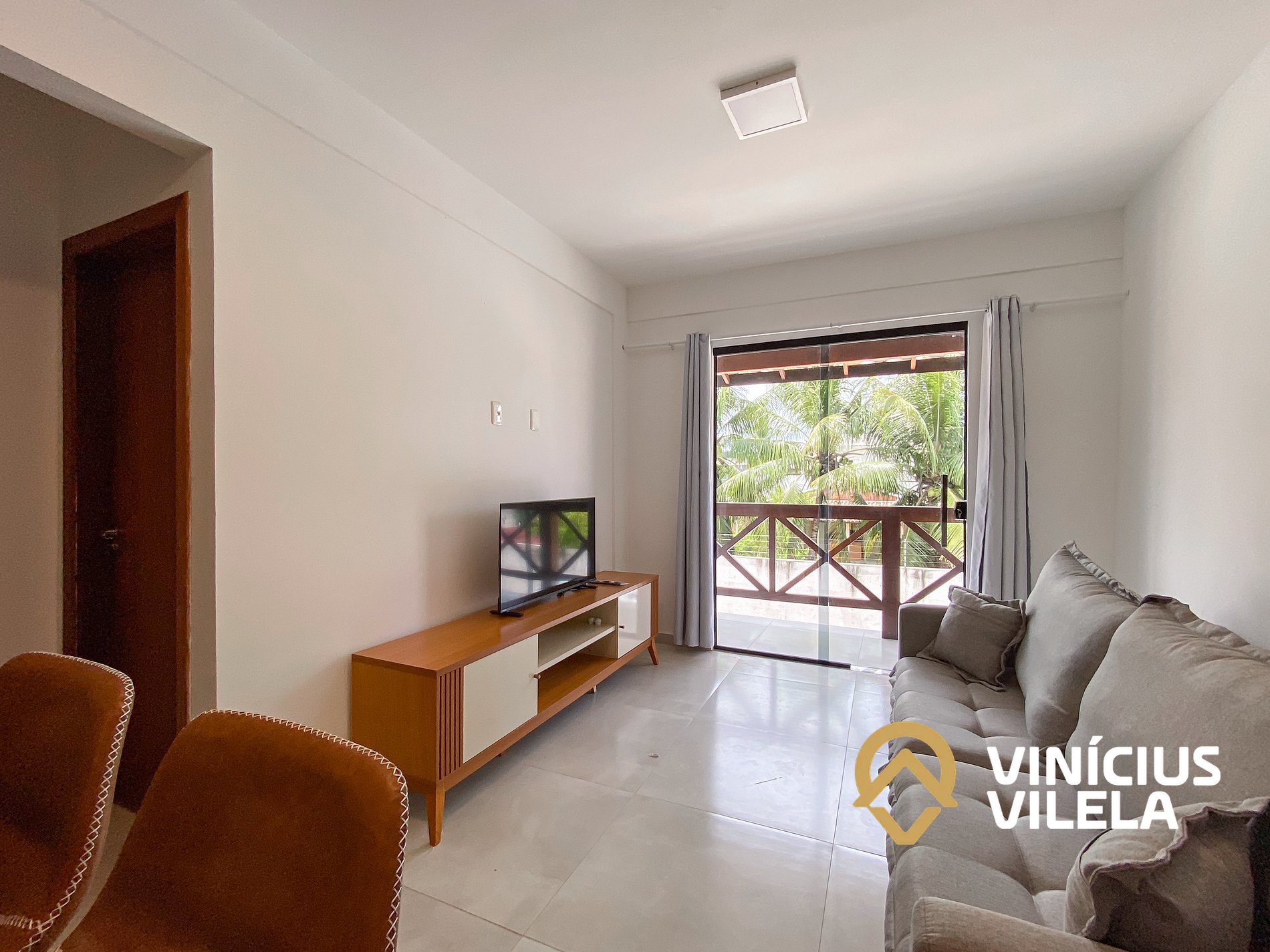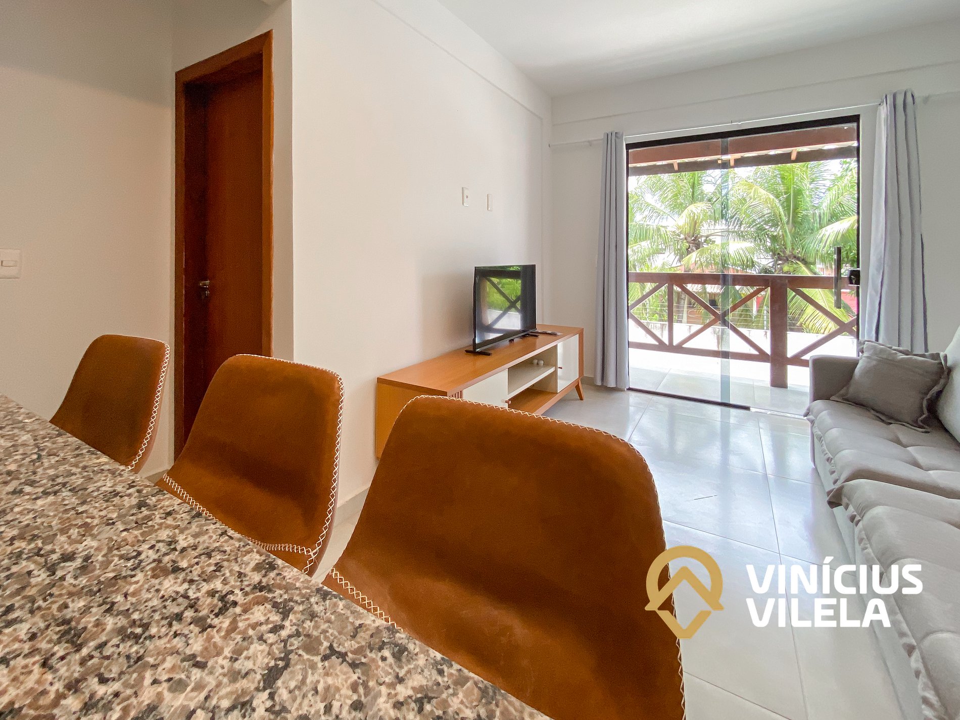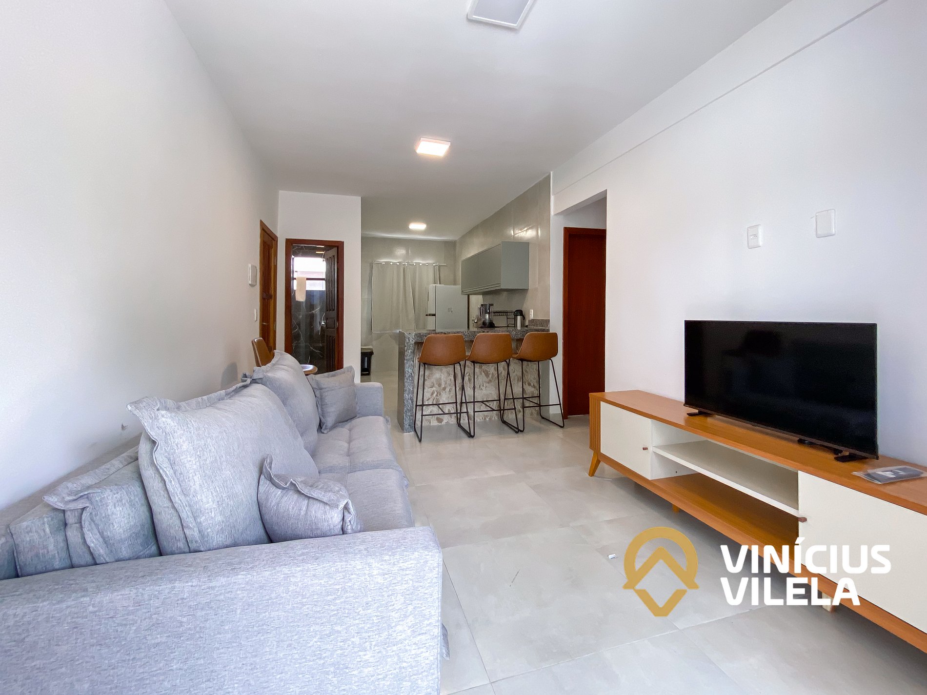 Logo na entrada possui uma sala conjugada com a copa com sofá , rack e TV tela plana. Mesa com 4 cadeiras.