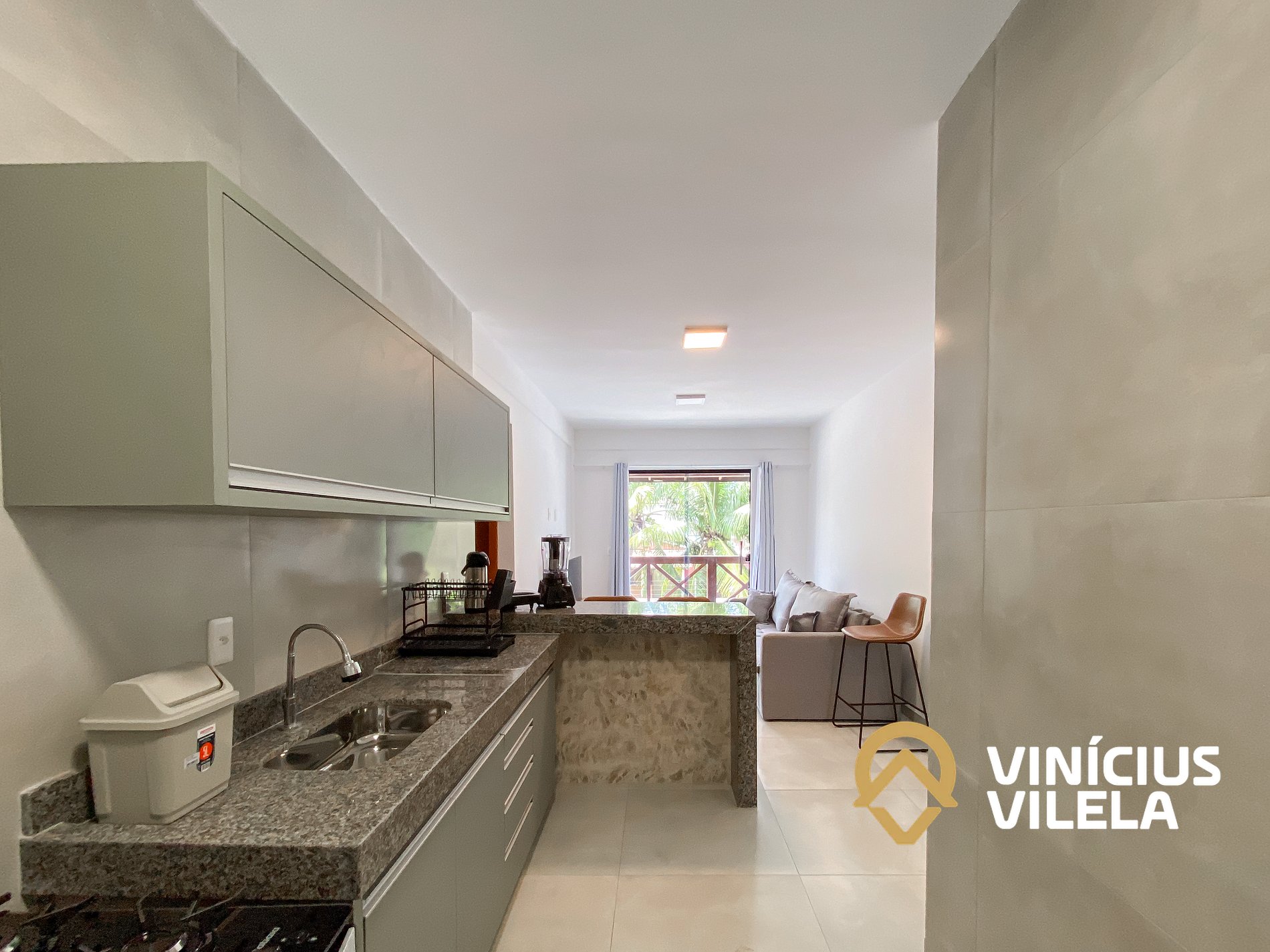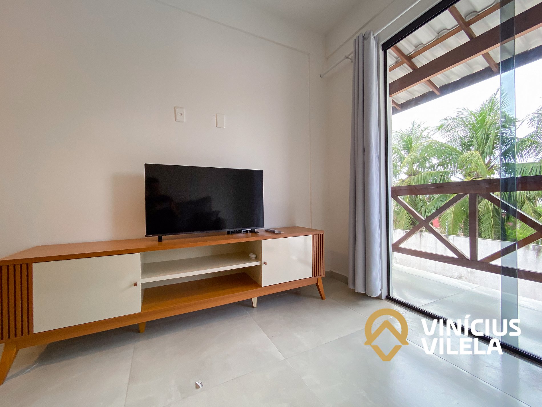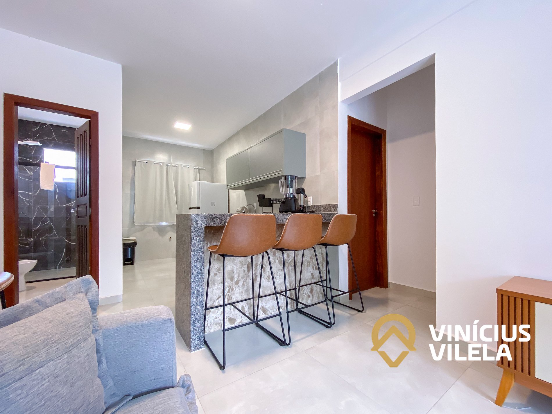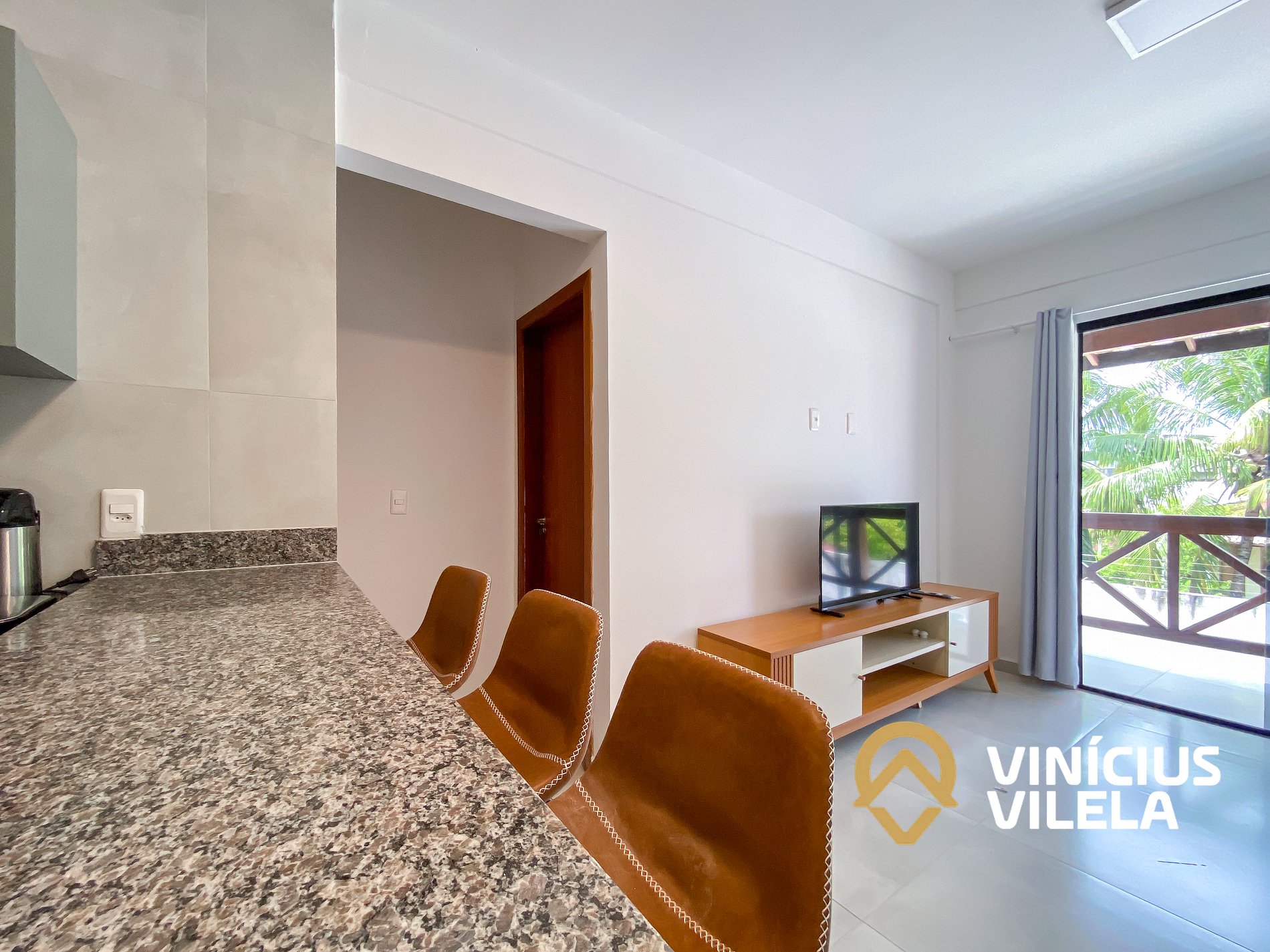 Logo na entrada possui uma sala conjugada com a copa com sofá , rack e TV tela plana. Mesa com 4 cadeiras.