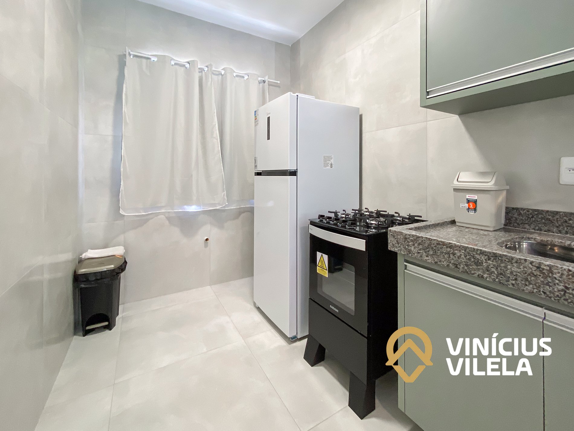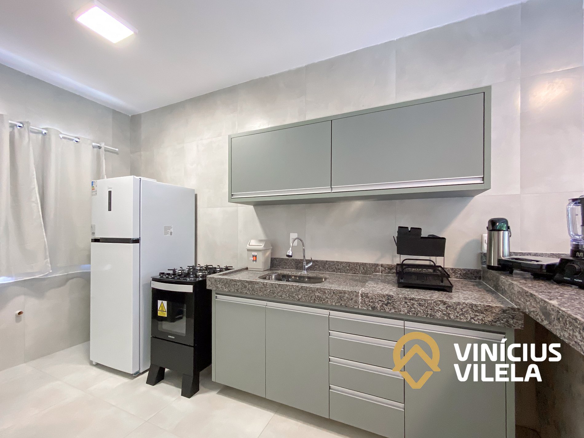 A cozinha oferece eletrodomésticos como, fogão, geladeira, utensílios, panelas, talheres, pratos, xícaras, garrafa térmica de café ,copos de vidro, e nas gavetas sempre você vai encontrar utensílios essenciais em uma cozinha.