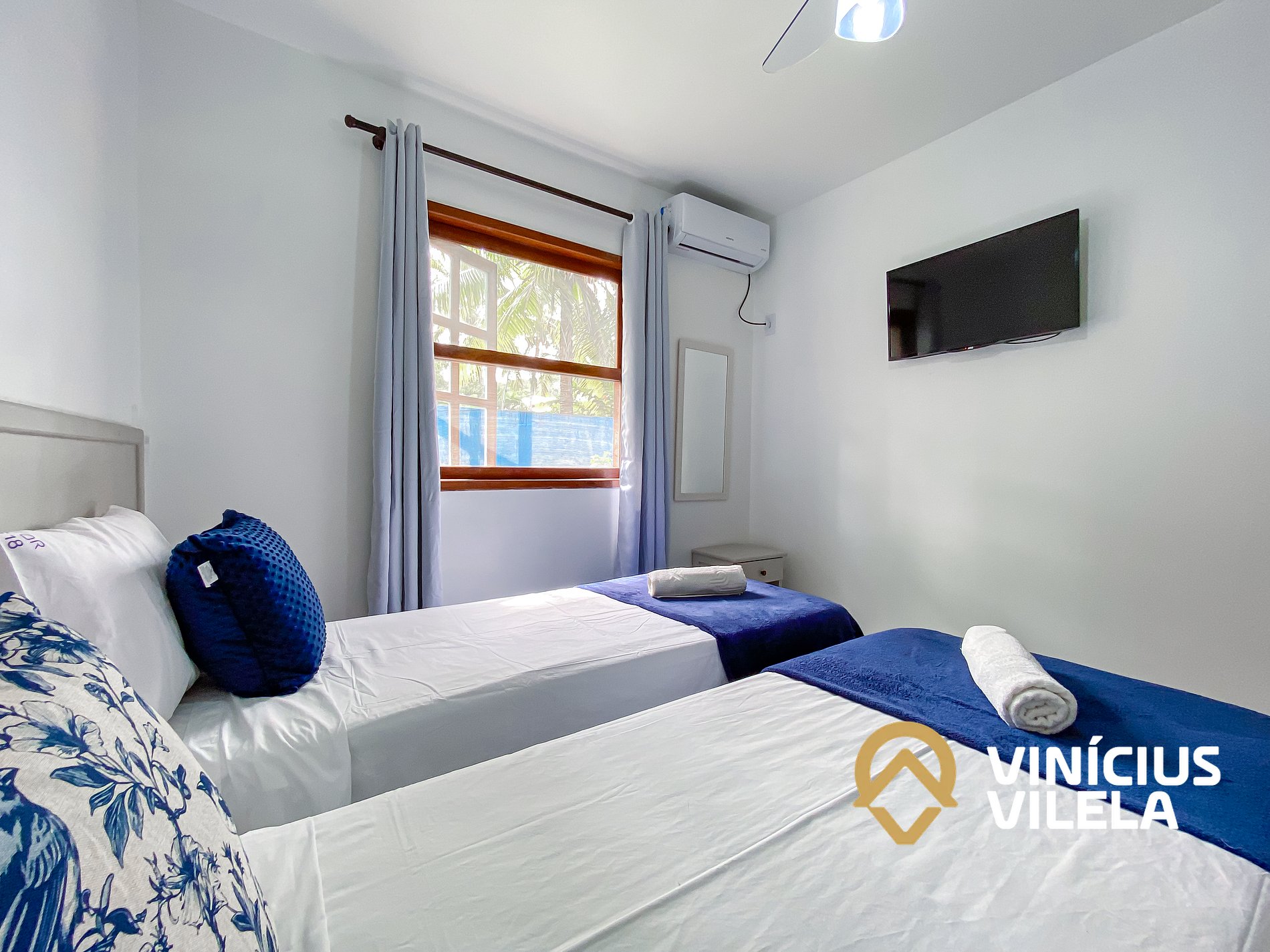 - Apto com 2 quartos sendo 1 suíte ambas com ar condicionado e TV