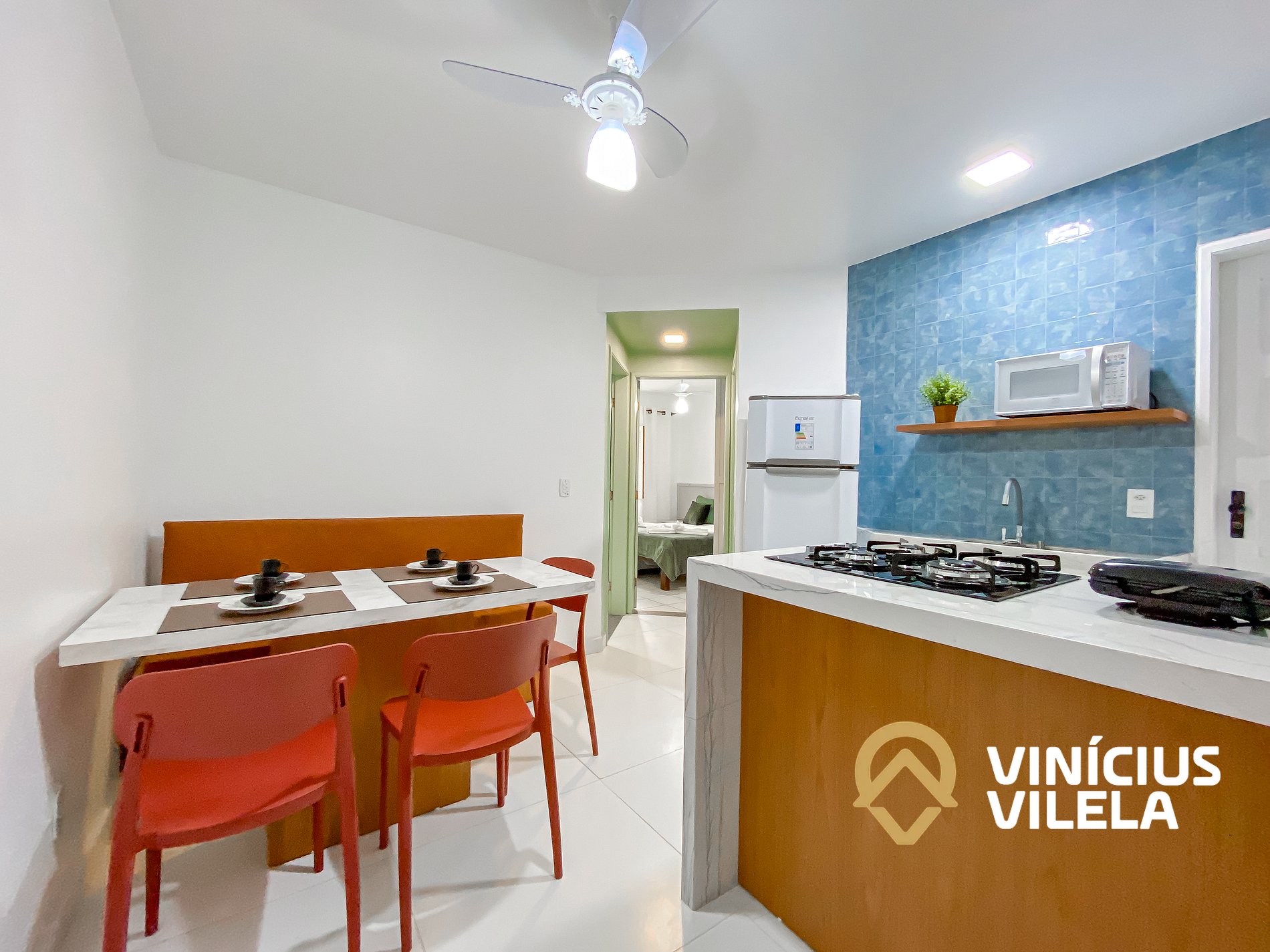 Belo apartamento localizado no térreo. Logo na entrada contamos com a sala de jantar conjugada com a cozinha completa, com geladeira, coktop , microondas, airfryer e diversos utensílios , panelas, pratos , talheres, liquidificador, sanduicheira, mesa com 4 cadeiras. O apartamento possui ainda uma área de serviço e banheiro social, além dos 2 quartos sendo um deles suíte . A suíte possui uma cama de casal e uma de solteiro , ar condicionado e tv além de um roupeiro. O outro quarto contamos com uma cama de casal e 1 cama auxiliar de solteiro além de ar condicionado e Tv. A acomodação conta com internet privativa de 300mbps. Oferecemos o serviço de limpeza diária (sem troca de enxoval) mediante solicitação junto à recepção.(exceto aos domingos). Oferecemos roupa de cama e banho (trocas de enxoval poderão ser negociadas e pagas diretamente à recepção, O condomínio (Golden Dolphin) possui piscina adulto , piscina infantil , portaria 24hrs e área de churrasco (agendamento e pagamento da taxa de utilização diretamente junto à recepção )
