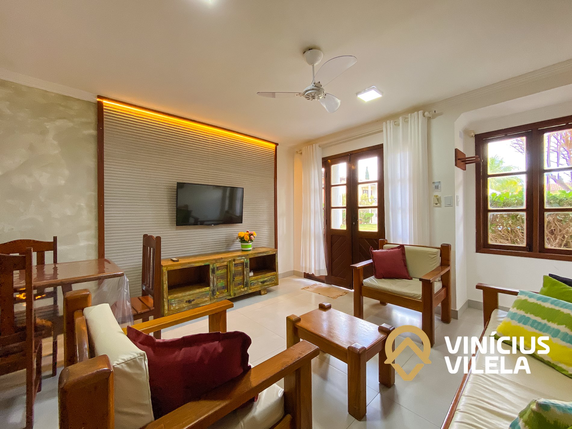 Logo na entrada possui uma ampla sala conjugada com a copa, no qual são compostas com sofá cama (que acomoda 2 pessoas) e almofadas, 2 poltronas , rack e TV tela plana. Mesa de madeira com 6 cadeiras.