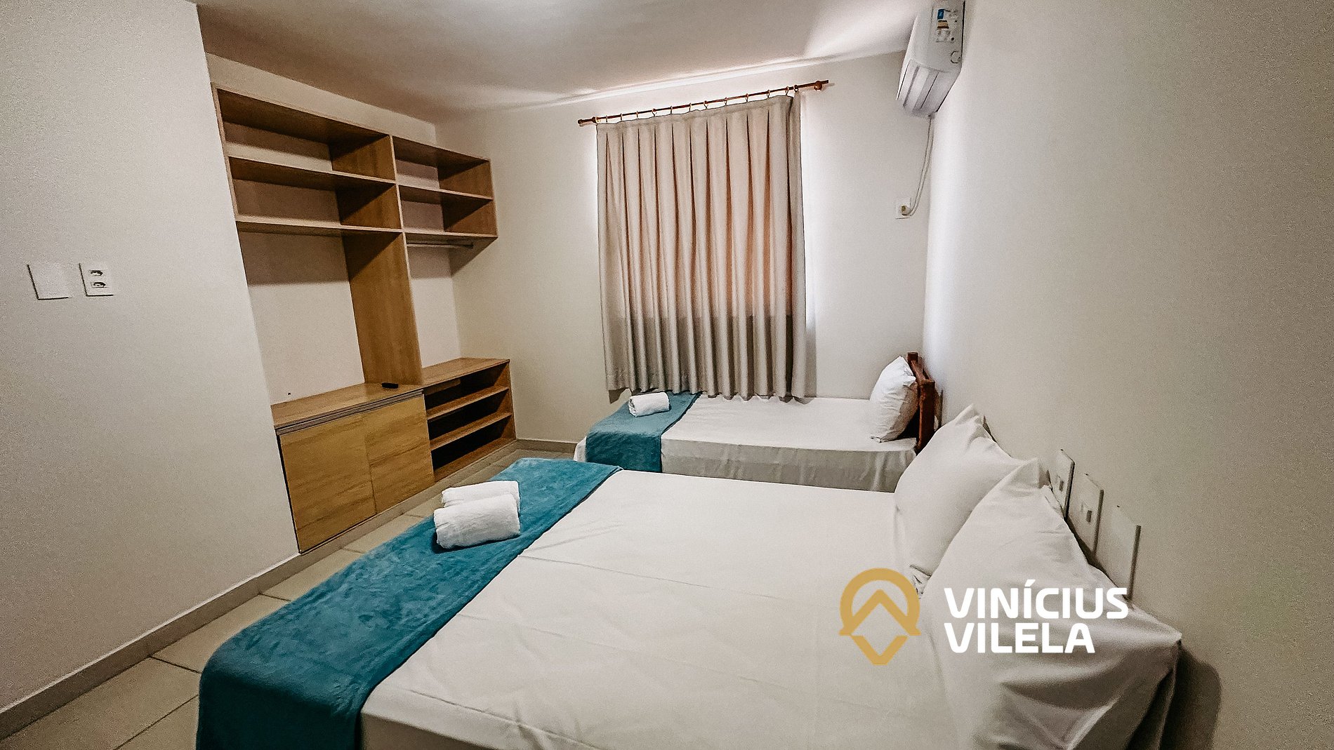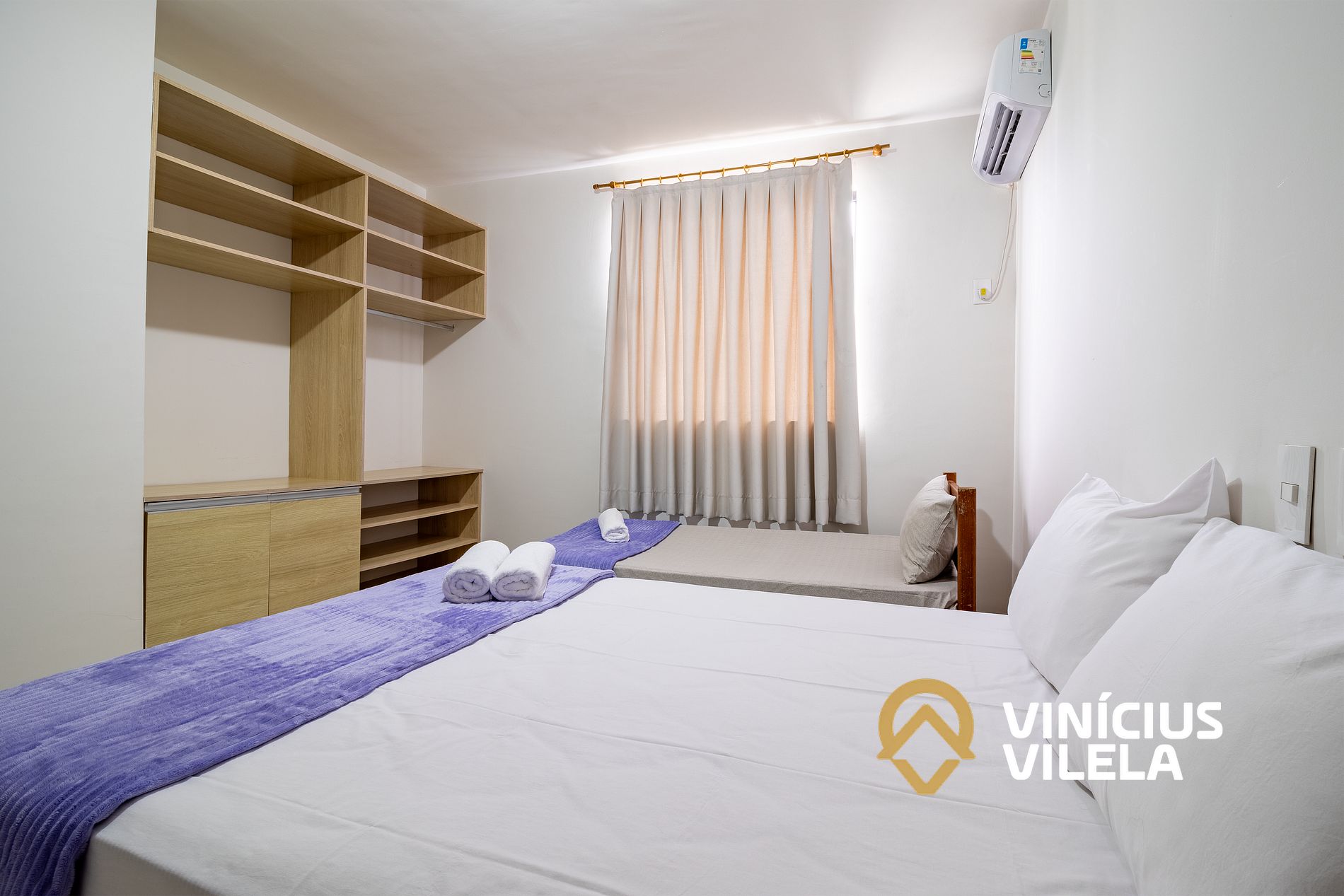 O quarto possui ar condicionado, 01 cama de casal e 01 cama de solteiro, travesseiros ,enxoval de cama e banho.