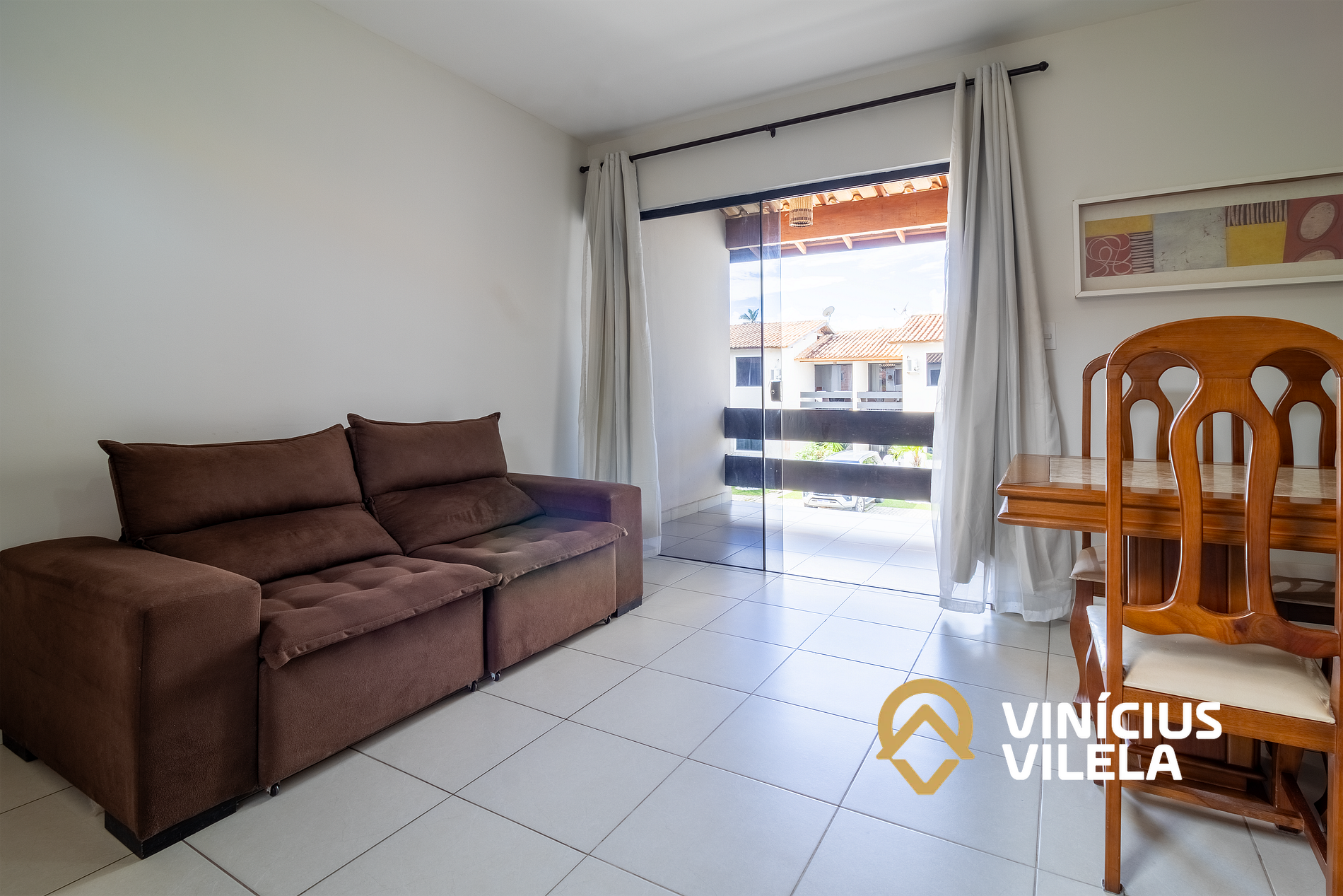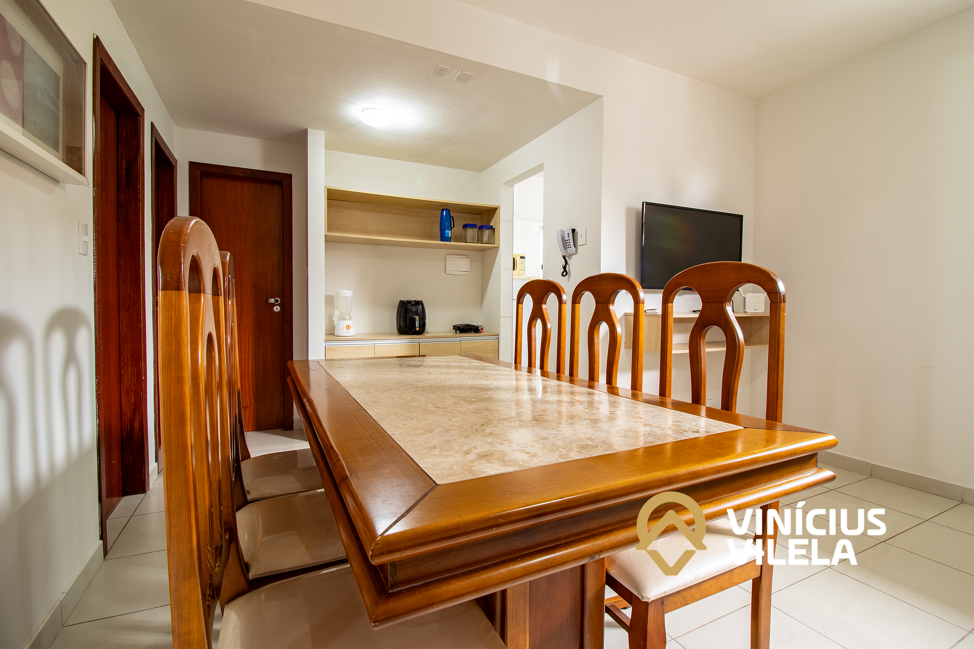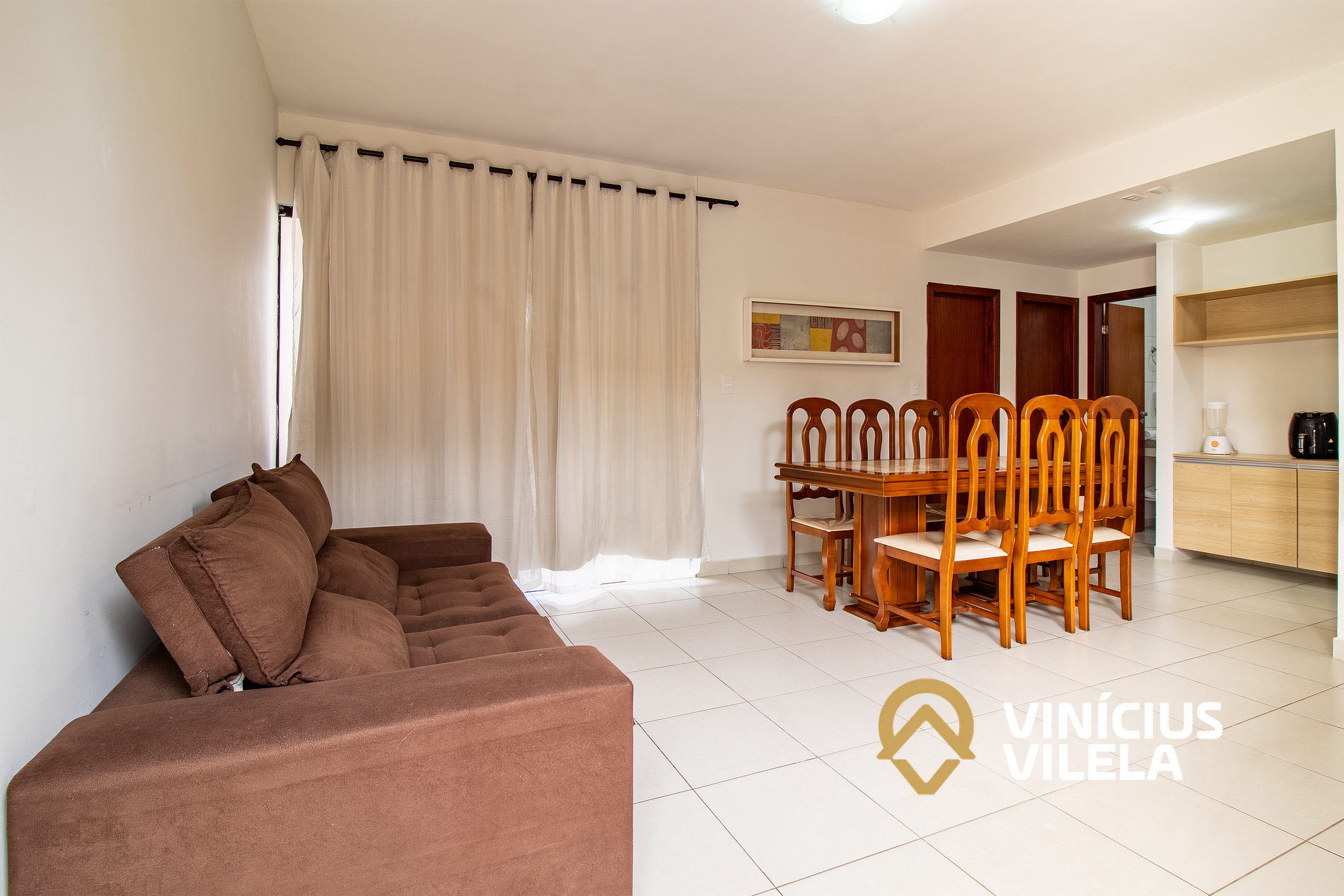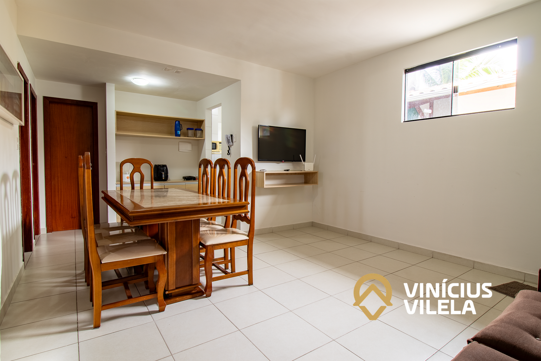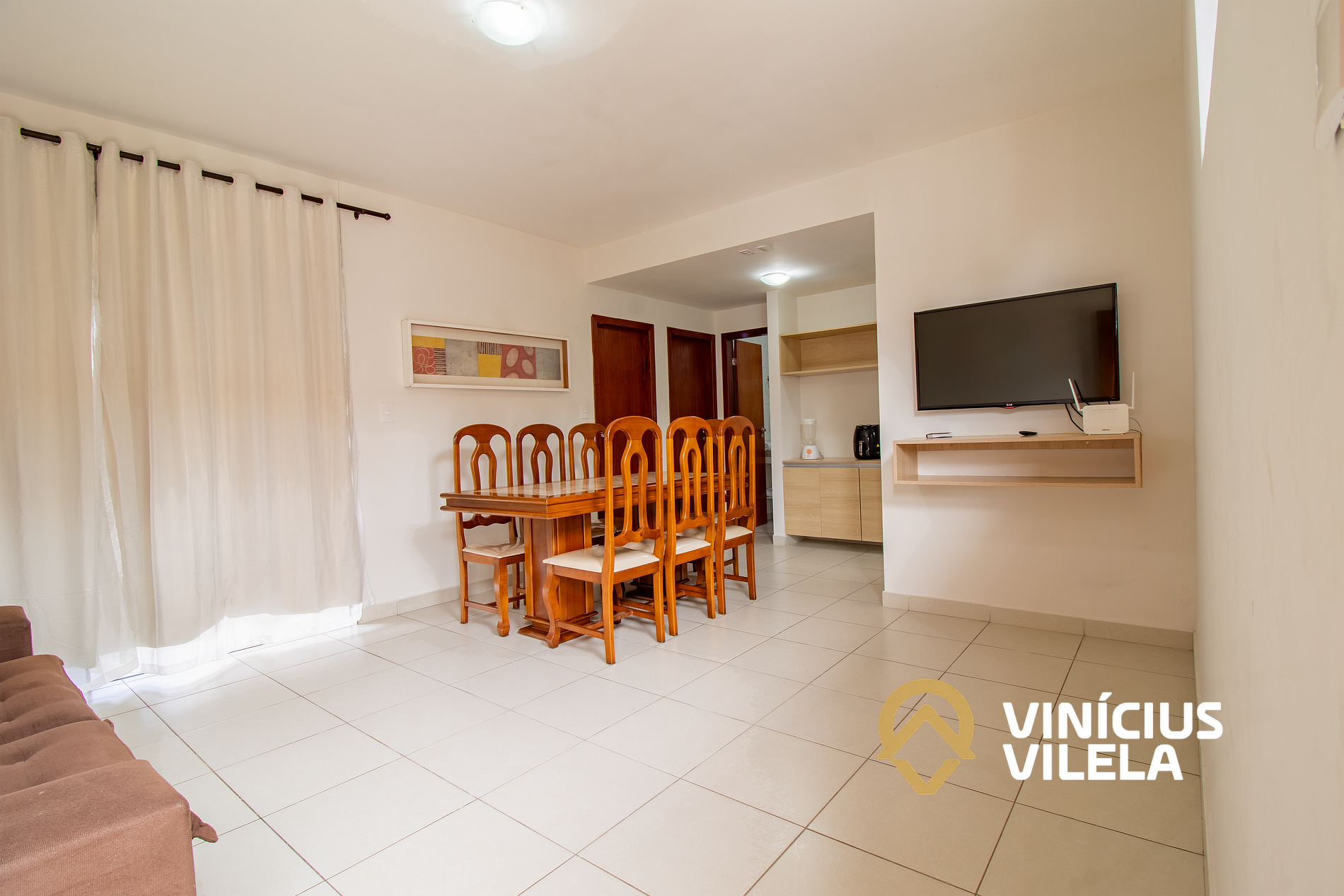 Logo na entrada possui uma sala conjugada com a copa, no qual são compostas com sofá e TV tela plana. Mesa com 6 cadeiras, varanda.