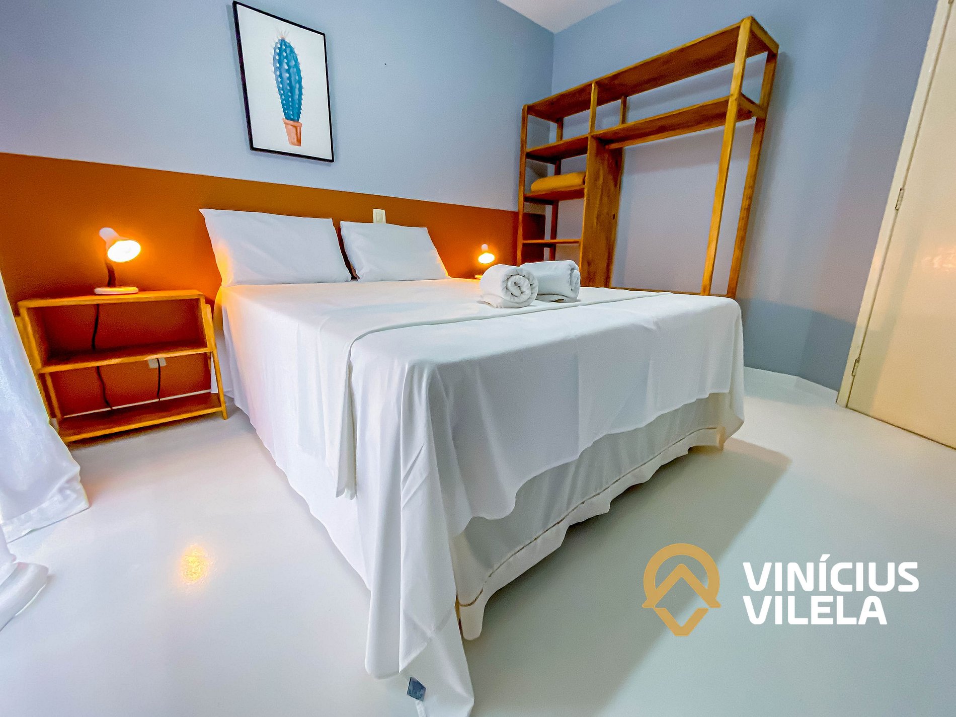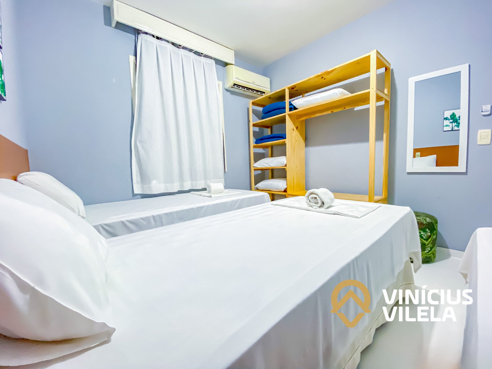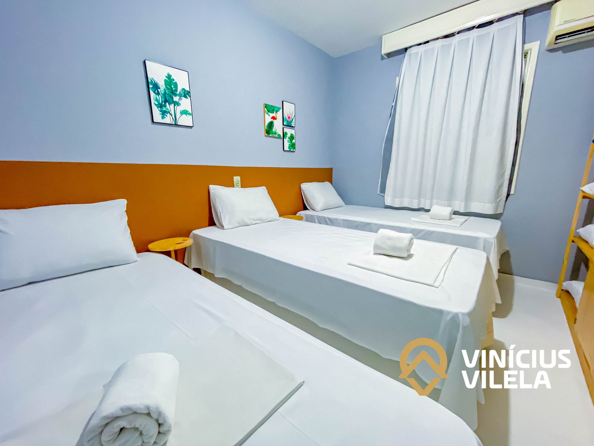 O apartamento possui ainda o banheiro social, além dos 2 quartos . o primeiro quarto possui uma cama de casal e ar condicionado além de um roupeiro. O outro quarto contamos com 3 camas de solteiro além de ar condicionado e roupeiro.