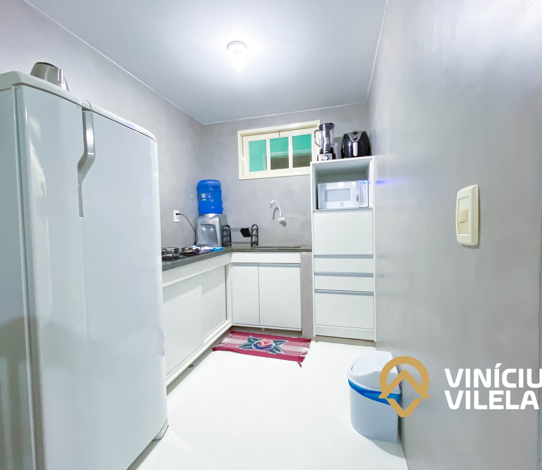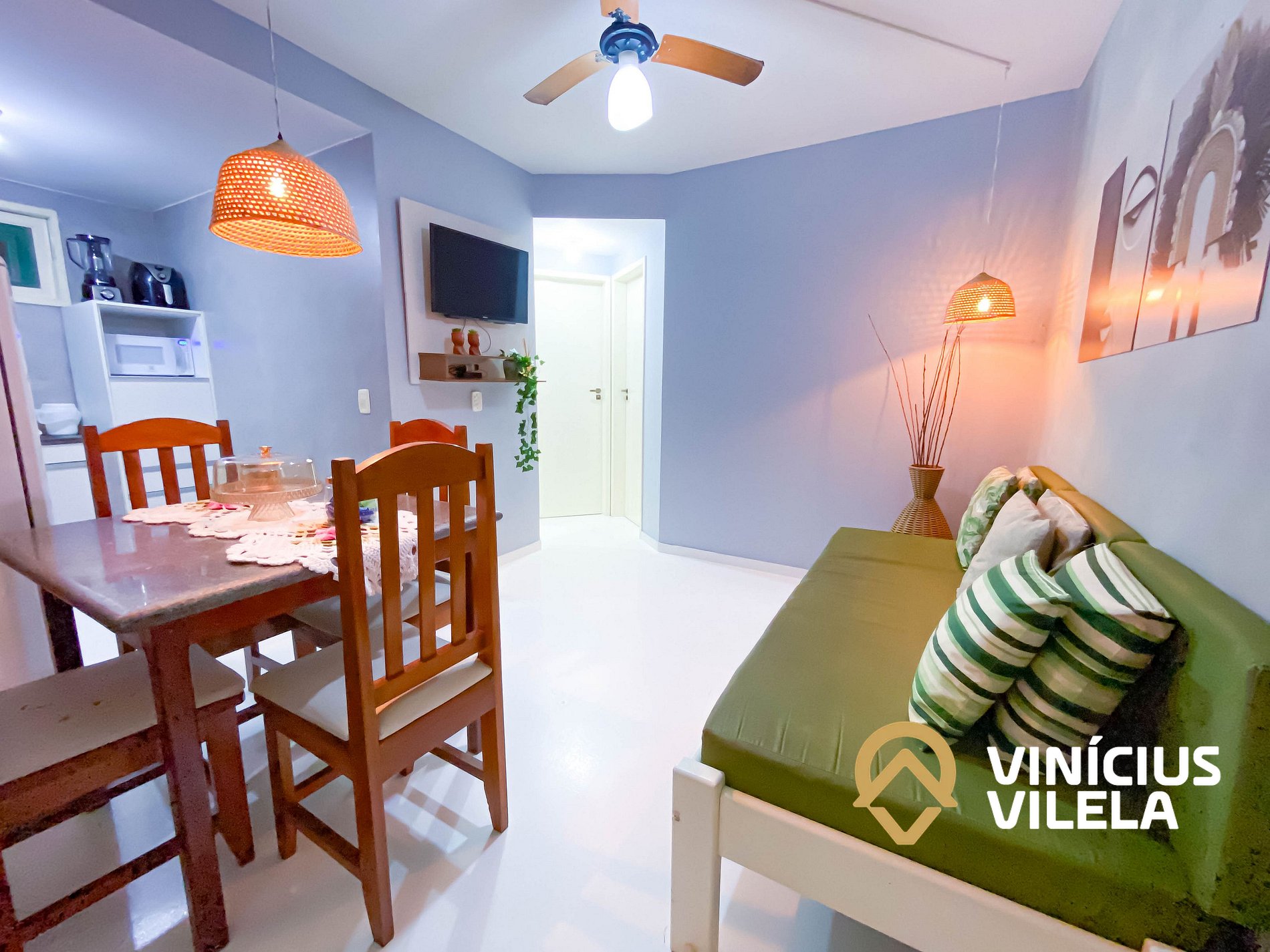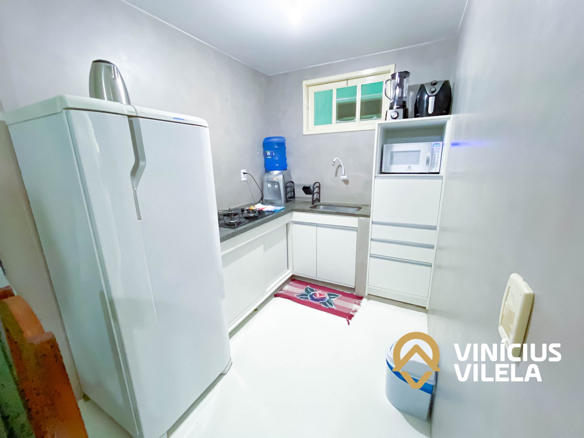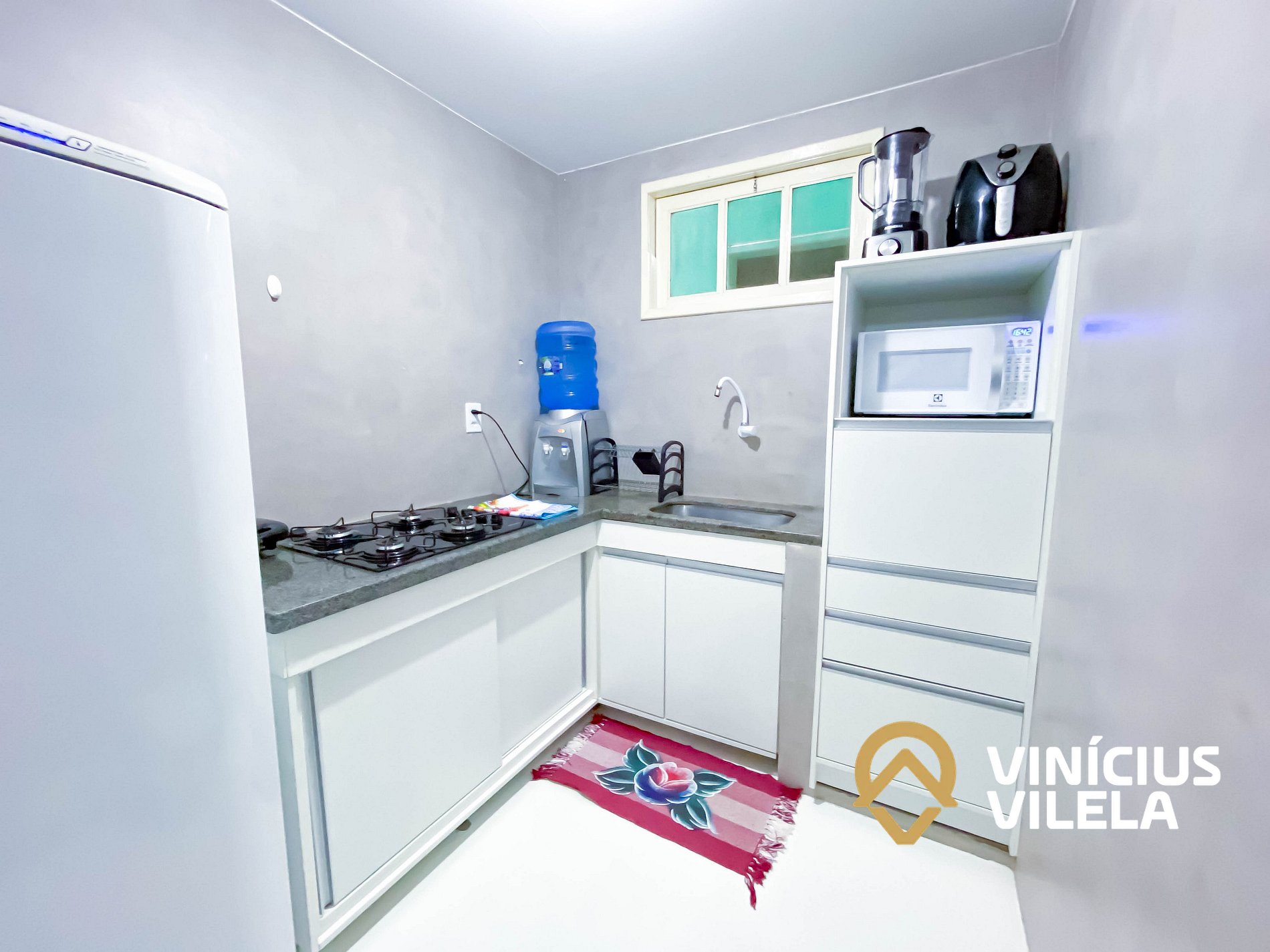 Logo na entrada contamos com a sala com sofá cama, mesa com 4 cadeiras, TV e ventilador de teto, a cozinha completa, com geladeira, fogão , microondas e diversos utensílios , panelas, pratos , talheres, airfryer, liquidificador, sanduicheira.
