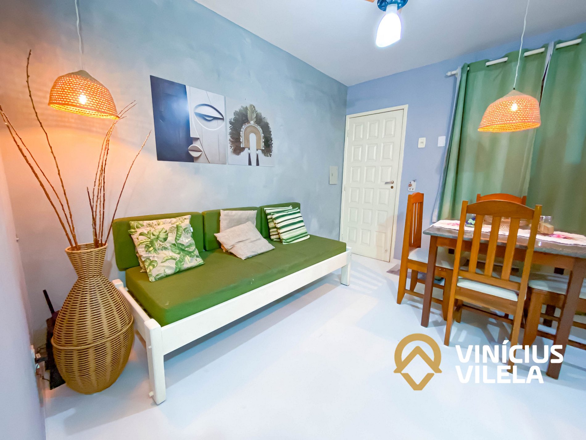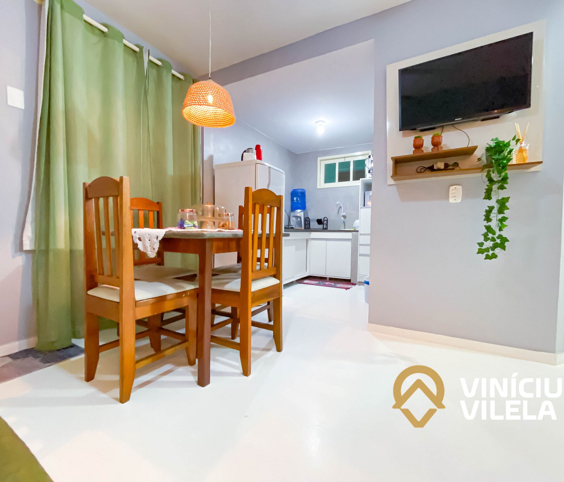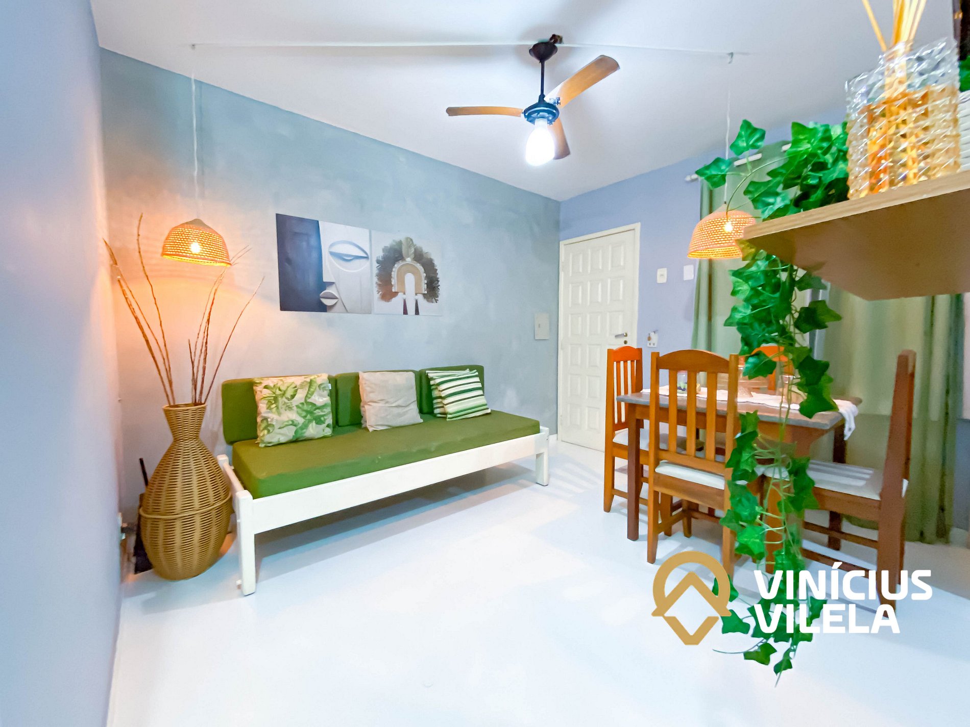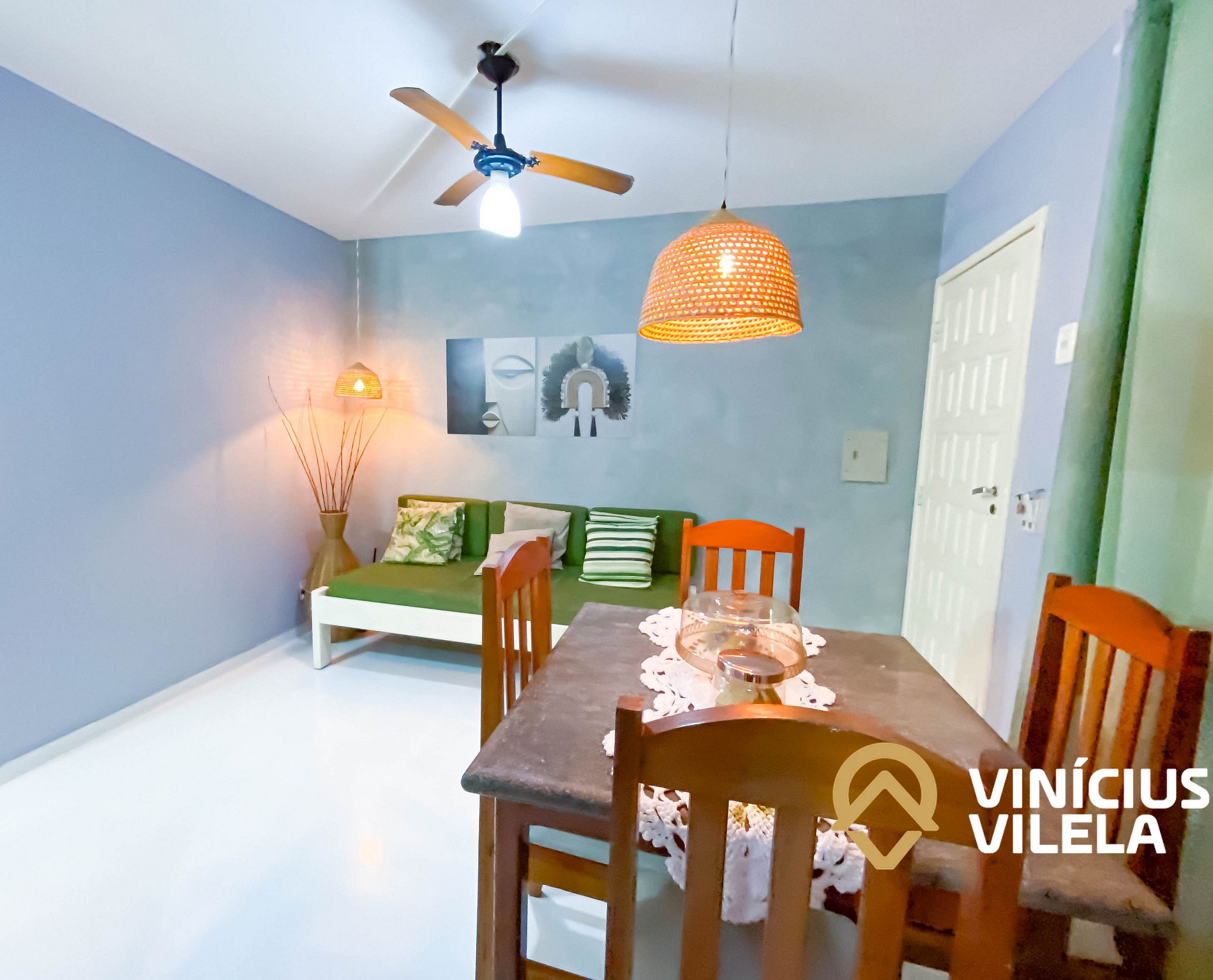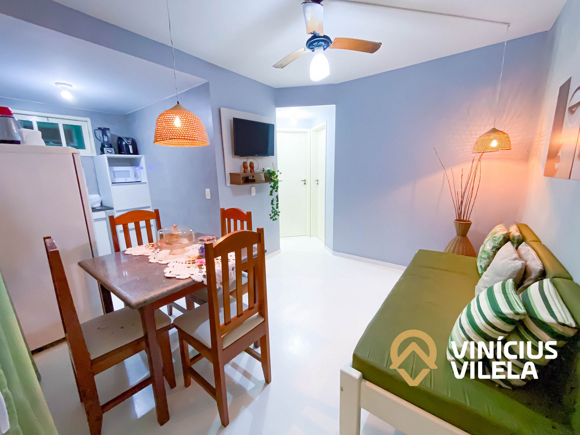 Logo na entrada contamos com a sala com sofá cama, mesa com 4 cadeiras, TV e ventilador de teto, a cozinha completa, com geladeira, fogão , microondas e diversos utensílios , panelas, pratos , talheres, airfryer, liquidificador, sanduicheira.