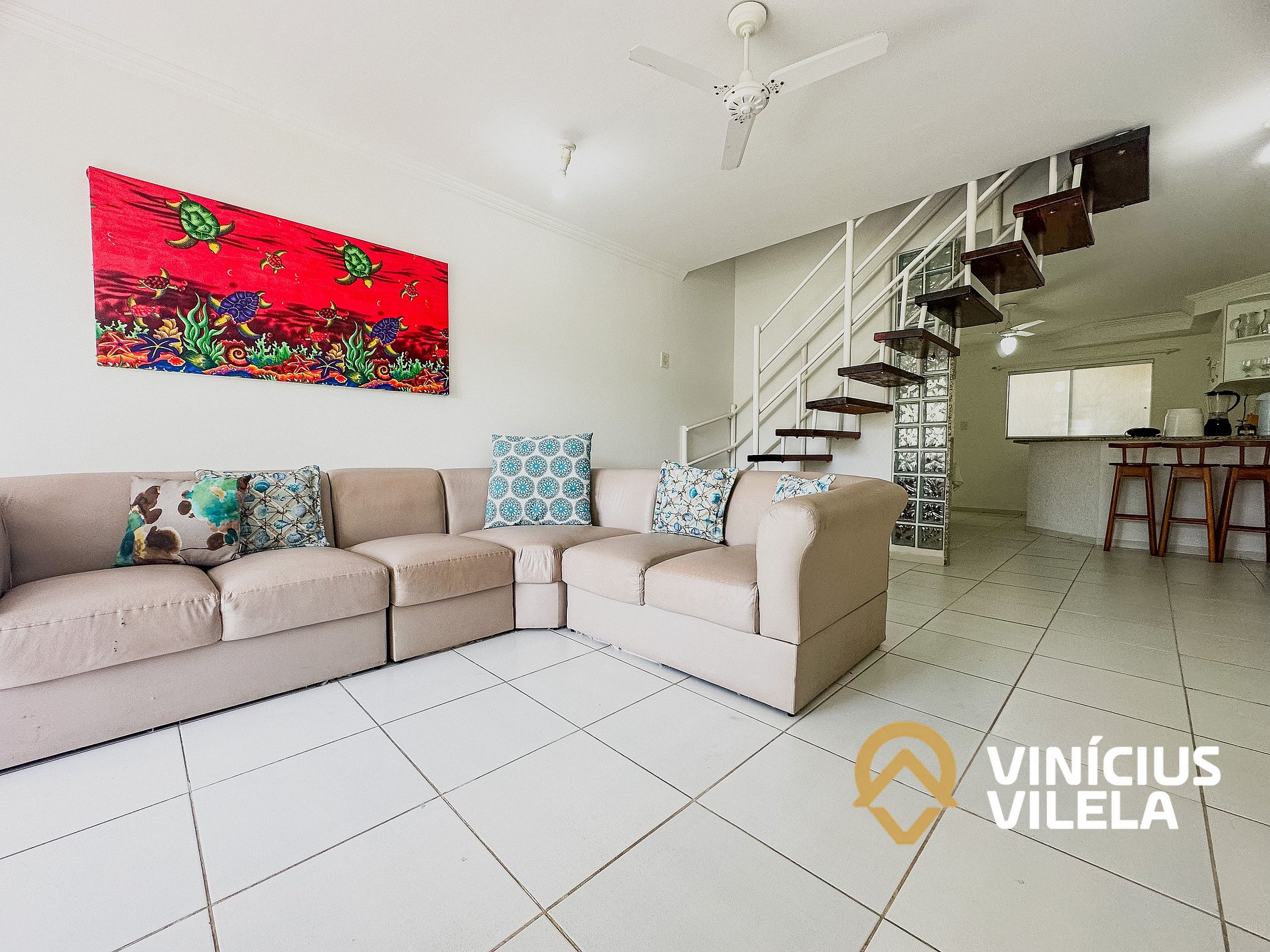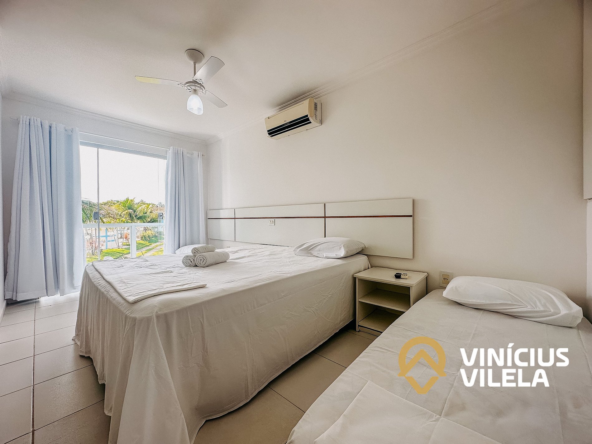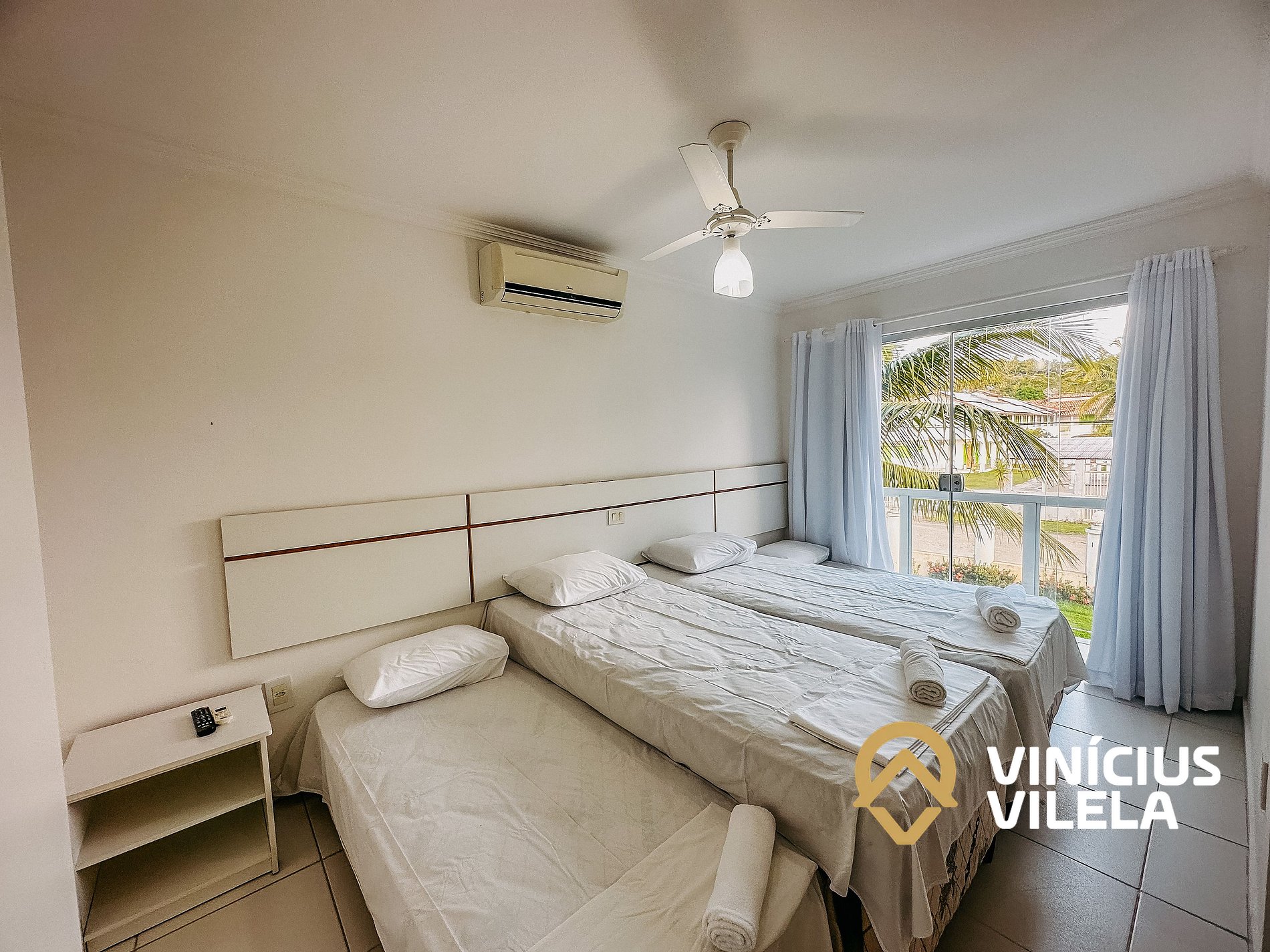 As 2 suítes no pavimento superior possuem ar condicionado, ventilador de teto,