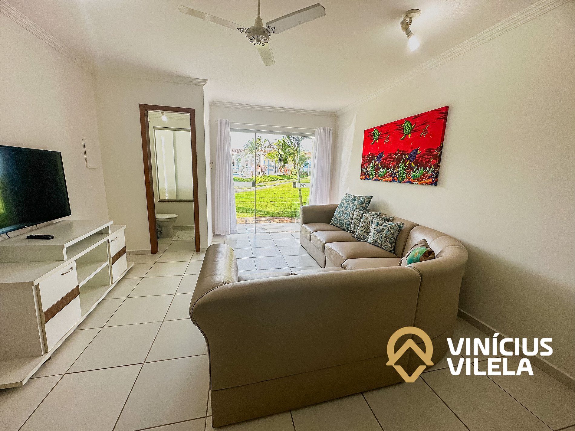 Logo na entrada possui uma ampla sala conjugada com a copa, no qual são compostas com sofá cama e almofadas, 2 poltronas , ventilador de teto, rack e TV tela plana. Mesa de madeira com 6 cadeiras.